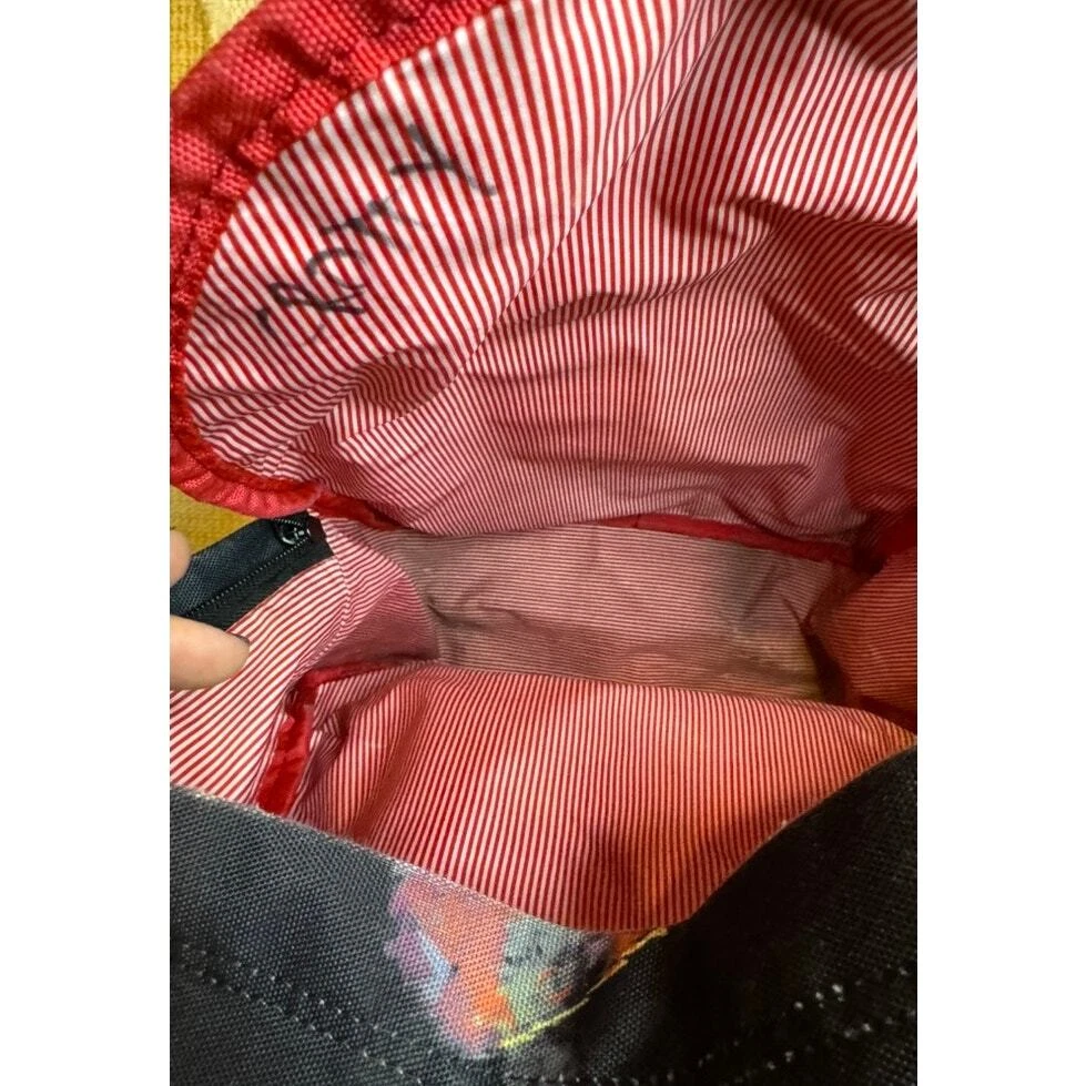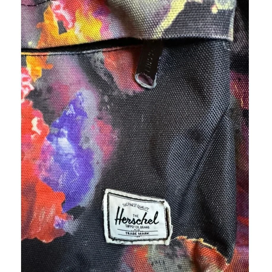 Hershel Mini Backpack Multi color water color normal wear to outside corners of bag, missing color from zipper Name written inside of bag