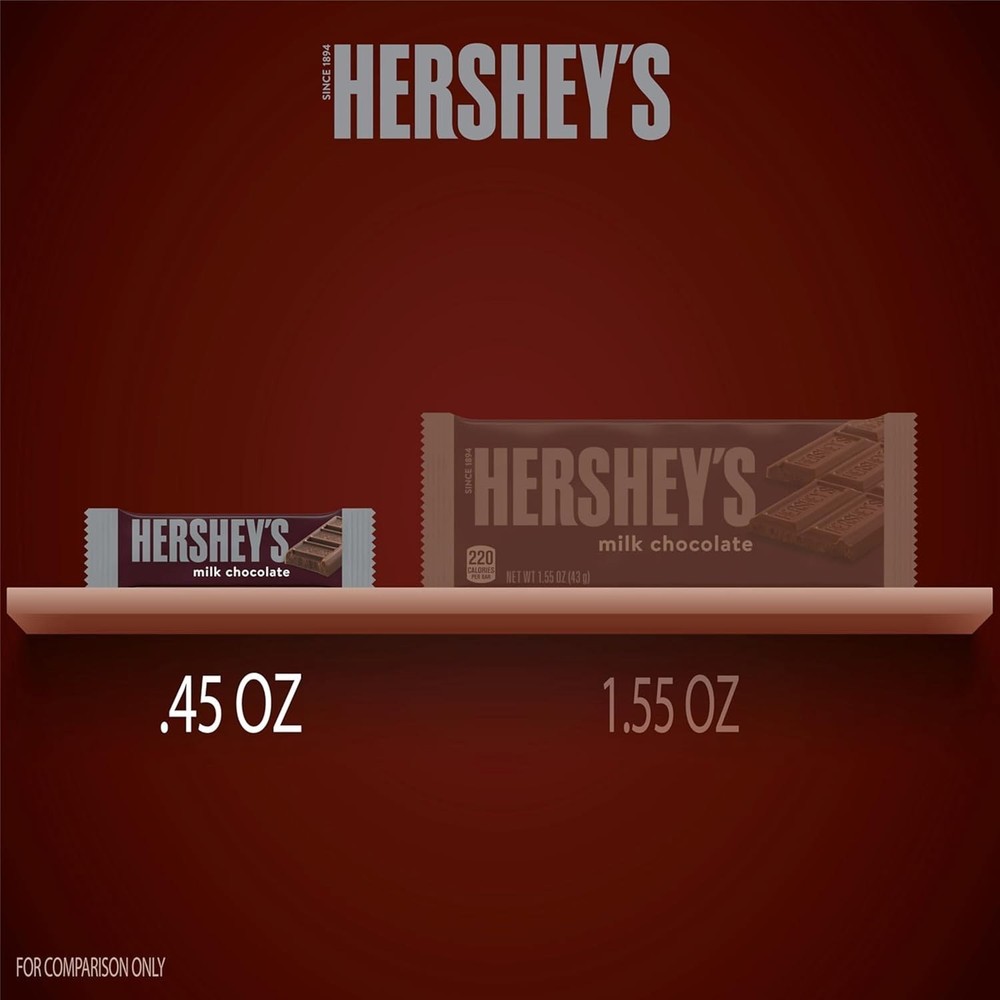 Item description from the seller About this item Item Form Bar Occasion Halloween Chocolate Type Milk Flavor Milk Chocolate Contains twenty five (25) 0.45-ounce HERSHEY'S Milk Chocolate Snack Size Candy Bars in an 11.25-ounce pantry pack Keep your favorite milk chocolate candy neat and organized with HERSHEY'S pantry pack candy box that you can store in the pantry or fridge Includes 25 kosher, individually wrapped HERSHEY'S milk chocolate candy bars in a resealable and stackable box to protect your snack size candy treats Product Description Made from deliciously creamy milk chocolate, this pantry pack of HERSHEY'S chocolate candy includes 25 snack size bars with a classic flavor that's been enjoyed for decades. Whether you enjoy this pantry pack of snack size candy bars alone or shared with loved ones, you can count on this sweet treat to put a smile on any face. This milk chocolate bar is the perfect treat for countless special and all of the ordinary moments in between. HERSHEY'S milk chocolate candy bars can be used to stuff Christmas stockings, Halloween trick or treat bags, Easter baskets and Valentine's Day party favors