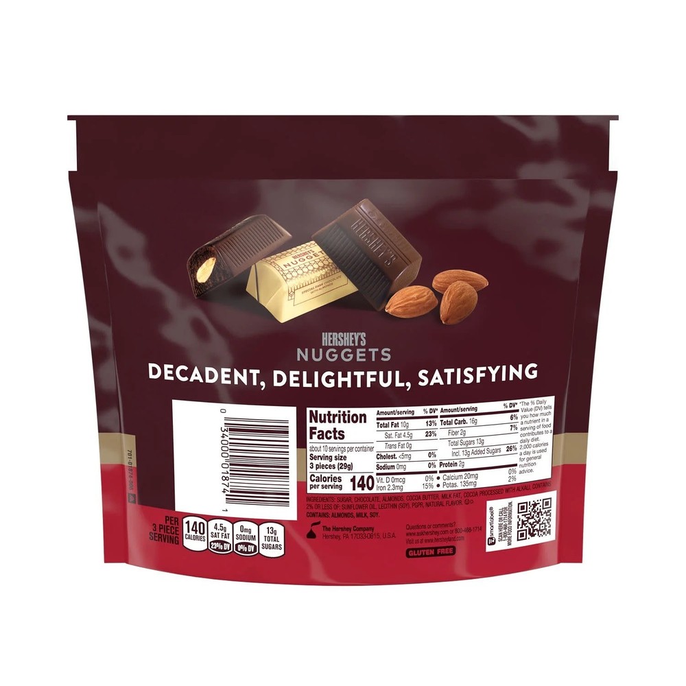 Hershey's Nuggets SPECIAL DARK Chocolate with Almonds Candy, Share Pack 10.1 oz Item description from the seller: This HERSHEY'S NUGGETS SPECIAL DARK mildly sweet chocolate with almonds share pack is filled with delicious chocolate treats any dark chocolate and almond lover will adore. Each two bite candy offers creamy, delightful mildly sweet dark chocolate over crisp, crunchy almonds individually wrapped in stunning gold foil. Dress your kitchen table up with a bowl of HERSHEY'S NUGGETS goodies. Contains one 10.1-ounce share pack of HERSHEY'S NUGGETS SPECIAL DARK Chocolate with Almonds Candy A candy dish hit any day of the year for anyone seeking the perfect amount of mild sweetness and almond crunch in a dark chocolate bar Kosher certified, gluten free dark chocolate candy packaged in golden wrappers for convenience in any snack-worthy setting Perfect for graduation celebrations, birthday parties, anniversary dates and Saint Patrick's Day events Enjoy a delicious snack that you can take anywhere, from everyday occasions to seasonal gatherings throughout the year HERSHEY'S SPECIAL DARK chocolate with almonds for movie nights and baked goods requiring a mildly sweet finish with that just-right crunch.