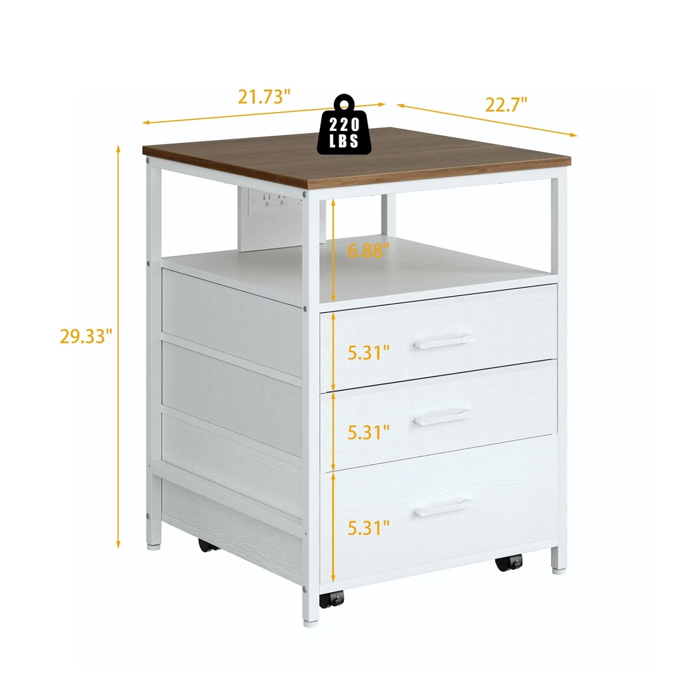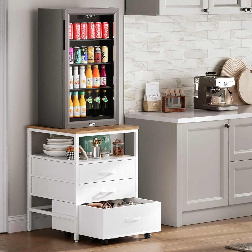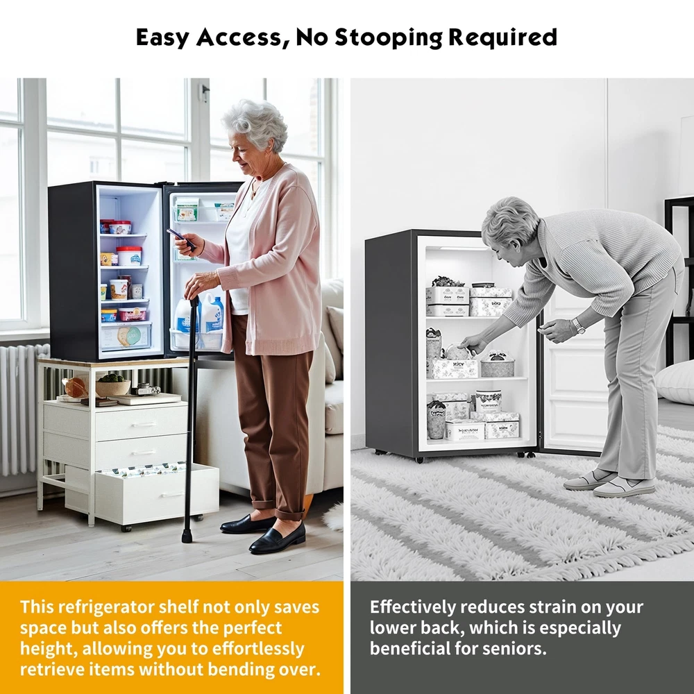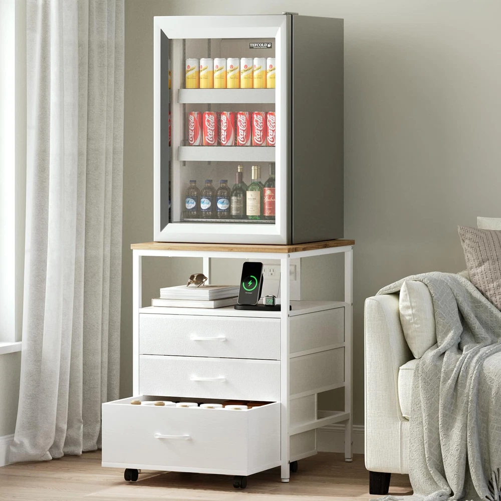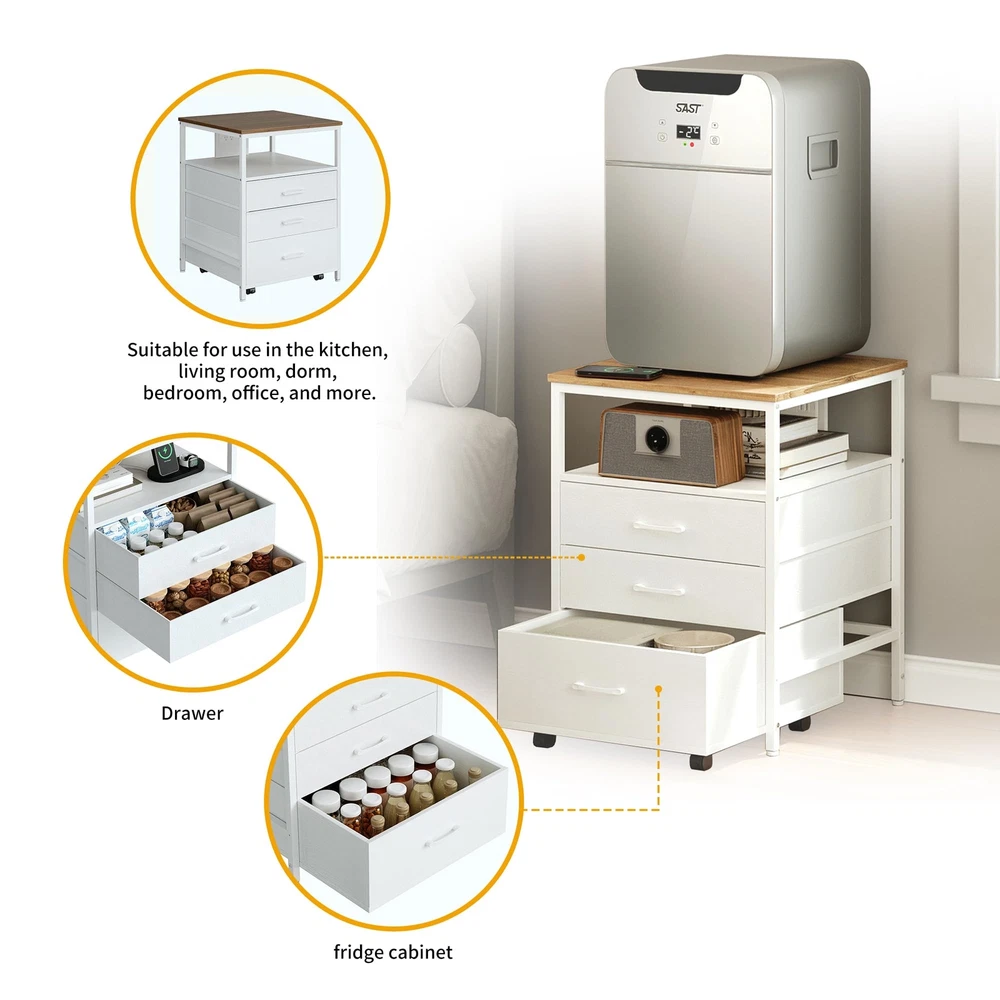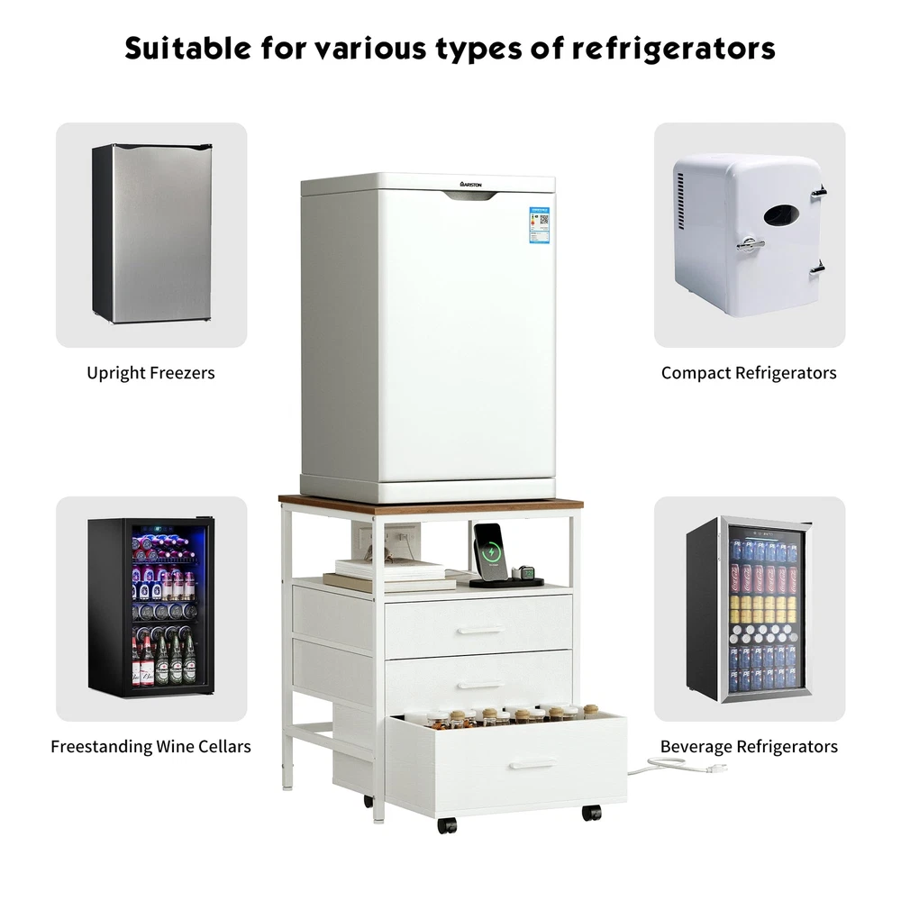 Elevate and organize your space with this versatile mini fridge stand, designed for both convenience and style. Featuring a built-in power outlet, three spacious storage tiers—including two drawers and an open shelf, with a rolling wooden drawer for easy access—this stand maximizes functionality. Crafted from high-quality MDF and a durable metal frame, it supports up to 220 lbs, providing a stable base for most mini fridge models. Perfect for protecting your back by reducing the need to bend, this ergonomic mini fridge organizer is ideal for any home or office setup. Ergonomic Design for Enhanced Comfort - This mini fridge stand elevates your refrigerator to a comfortable height, eliminating the need to bend over to access items. It's designed to reduce strain on the back and waist, making it especially user-friendly for seniors or anyone looking to protect their posture. Spacious four-level storage - this mini fridge stand with storage features two (non-wooden drawers), one wooden drawer, and an open compartment, providing ample space to organize various items. The wooden drawer at the bottom is equipped with wheels, making it easy to move and adding extra convenience and versatility to meet your storage needs. Built-in Power Outlet for Ultimate Convenience - With a built-in power outlet, this mini fridge cabinet lets you power up your refrigerator and other appliances without cluttering your space with extra cords. It’s a smart solution for a tidy, efficient setup in your home or office. High-Quality MDF and Sturdy Metal Frame for Maximum Stability - Crafted with premium MDF and a reinforced metal frame, this mini fridge stand supports up to 220 lbs, providing a stable and reliable base for even the heaviest mini refrigerators. Feel confident in its durability and safe design. Universal Fit for Most Mini Fridge Models - Designed to accommodate a wide range of Mini Fridge Table sizes, this mini refrigerator stand, including standalone wine coolers, upright freezers, compact fridges, and beverage coolers. Minimalist Style, Maximizing Vertical Space – With a modern and simple design, this mini fridge cabinet complements various interior decor styles. It not only saves floor space but also optimizes vertical space utilization, making it an ideal home accessory for the kitchen, living room, or dorm. Product Dimensions: 21.7“ L *22.7” W *29.33“ H