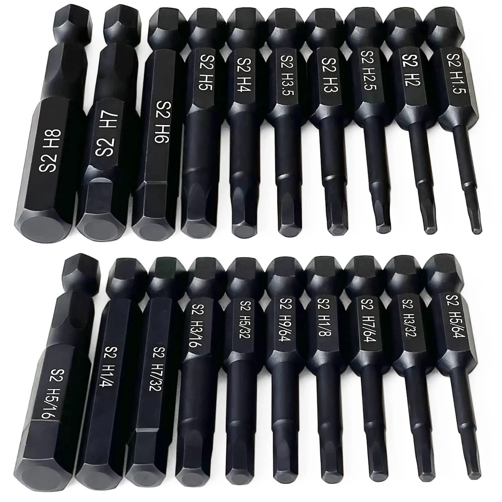 This hex bit set includes 10pc Metric: 1.5mm, 2mm, 2.5mm, 3mm, 3.5mm, 4mm, 5mm, 6mm, 7mm, 8mm and 10pc SAE: 5/64, 3/32, 7/64, 1/8, 9/64, 5/32, 3/16, 7/32, 1/4, 5/16 inches, and is 2 inches (50mm) long. Made from selected S2 alloy steel material with vacuum high-frequency quenching treatment, these Allen wrench bits for drill a hardness of 58-60HRC. This ensures long-lasting durability and precision, even under heavy use. The magnetic feature also makes it easier to handle and use the bits without worrying about them slipping out of place. Implementing Siemens CNC integrated processing for Bits results in integral molding, leading to increased precision and standardization in size. The high concentricity is ensured for better performance. This ensures excellent quality by using preferred materials. The black phosphate treatment of the allen key drill bit set provides additional protection against corrosion. Each bit is clearly marked with laser etching, making it easy to identify the size and type of bit you need. Hex bits are magnetic and can easily connect with screws. We guarantee the quality and durability of our products, the product comes with a 1 year warranty, and if any bits break during use, they will be replaced for free. Give it a try now!