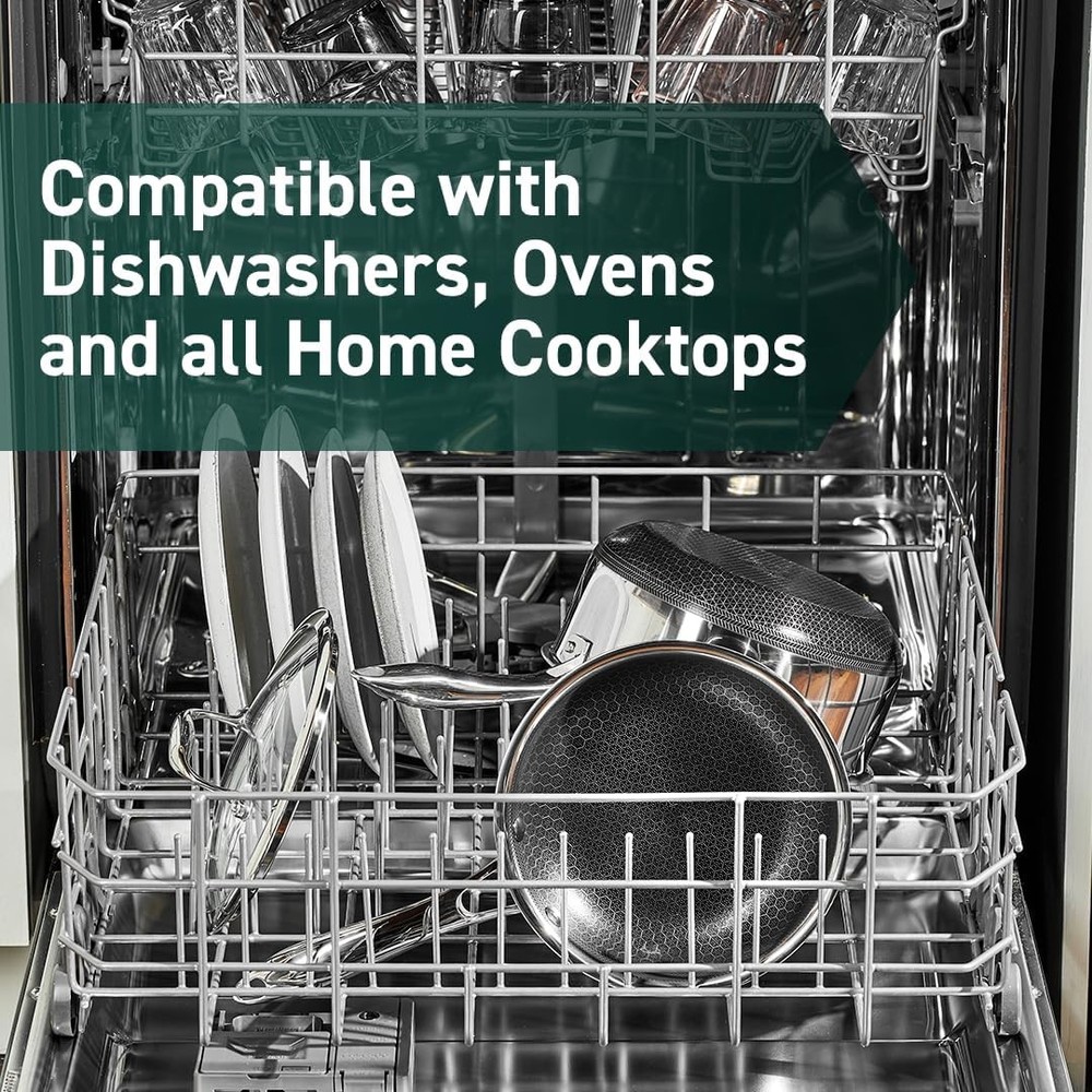 HexClad Hybrid Nonstick 7-Inch Frying Pan with Tempered Glass Lid, 7-inch Product Details Brand: HexClad Material: Tempered Glass, Stainless Steel, Aluminum Special Feature: Electric Stovetop Compatible, Includes Lid Capacity: 1.5 Liters Compatible Devices: Gas Product Care Instructions: Oven Safe, Hand Wash Only Handle Material: Plastic Item Weight: 3.7 Pounds Is Oven Safe: Yes Has Nonstick Coating: Yes Is Dishwasher Safe: Yes Recommended Uses For Product: Sautéing, Frying Specific Uses For Product: small servings, precise heat control, reductions, toasting seeds or nuts, melting butter UPC: 810140340016 Product Dimensions: 7.09 x 7.09 x 1.57 inches Item Weight: 3.7 pounds Manufacturer: HexClad Country of Origin: China Item model number: CWPNLD07 HexClad’s patented Hybrid technology features a laser-etched hexagonal nonstick surface that combines both stainless-steel and our TerraBond ceramic coating for the ultimate sear and easy cleaning. An excellent pan for small, individual servings, the Hybrid 7-inch pan also enables precise heat control making it ideal for reductions, toasting seeds or nuts and melting butter. Tri-ply construction with an aluminum core for quicker even heating, it’s safe to use on any home cooktop or stovetop, including induction. HexClad is metal utensil-safe, dishwasher-friendly, and oven-safe up to 900°F. (Tempered glass lids are oven-safe up to 400°F, while stainless steel lids are oven-safe up to 900°F.) Your purchase includes one HexClad 7-inch Pan and one Tempered Glass Lid. The 7-inch Pan measures approximately 7 inches in diameter, 1.6 inches in height, and 1.5 pounds in weight.