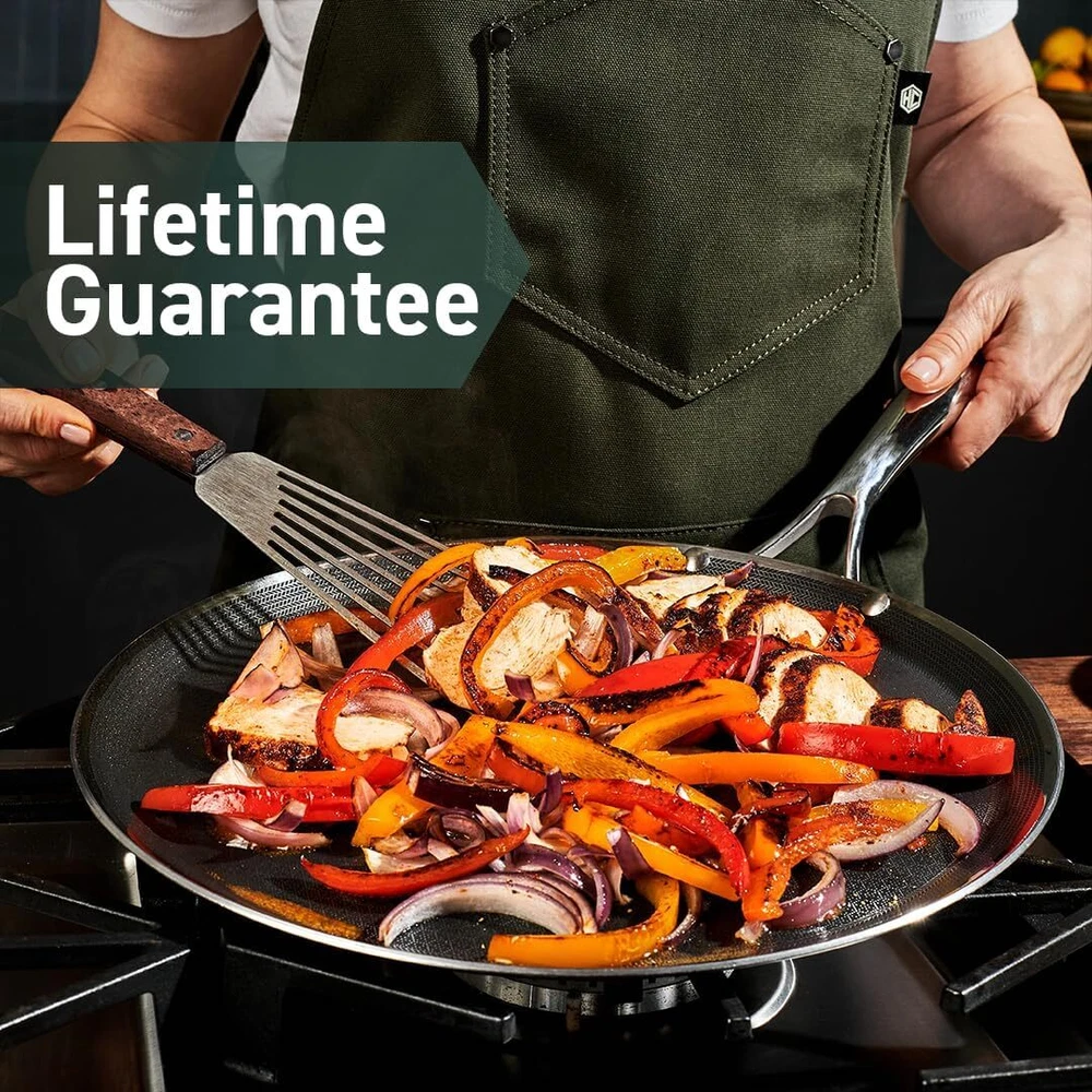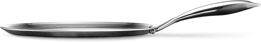 Package: 1X HexClad Hybrid Nonstick 12-Inch Griddle Pan, Stay-Cool Handle, Dishwasher-Friendly, Oven-Safe Up to 900°F, Induction-Ready, Compatible with All Cooktops Description: HexClad's patented hybrid tech utilizes tri-ply construction – aluminum between two layers of stainless-steel - laser-etched with our hexagonal nonstick surface to deliver the searing power of stainless, durability of cast-iron and easy cleanup of nonstick. Versatile enough to toast tortillas for huevos rancheros, or cook up French toast or even sear a steak, the Hybrid Griddle is ideal for cooking up anything needing a large flat surface to perfection. Use your HexClad cookware on any home cooktop or stovetop, including induction. Every piece is also scratch-resistant, dishwasher-friendly, and oven-safe up to 900°F. (Tempered glass lids are oven-safe up to 400°F, while stainless steel lids are oven-safe up to 900°F.) HexClad products that are sold by HexClad Cookware are backed by a lifetime warranty from manufacturer's defects. (Commercial and restaurant use excluded). Your purchase includes one HexClad 12-inch Griddle Pan. The 12-inch Griddle Pan measures approximately 12 inches in diameter, and 1 inch in height.