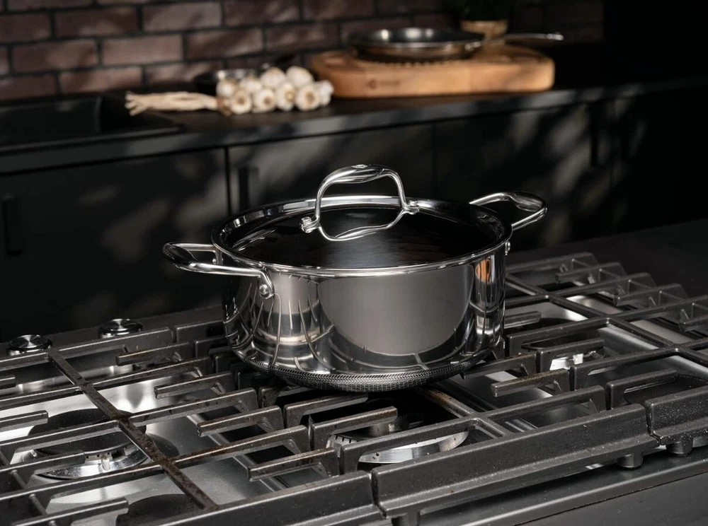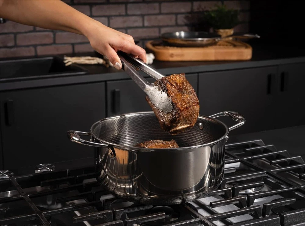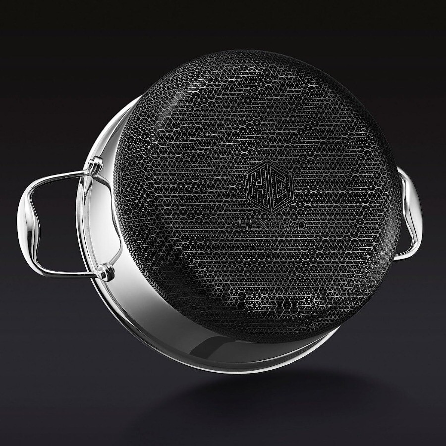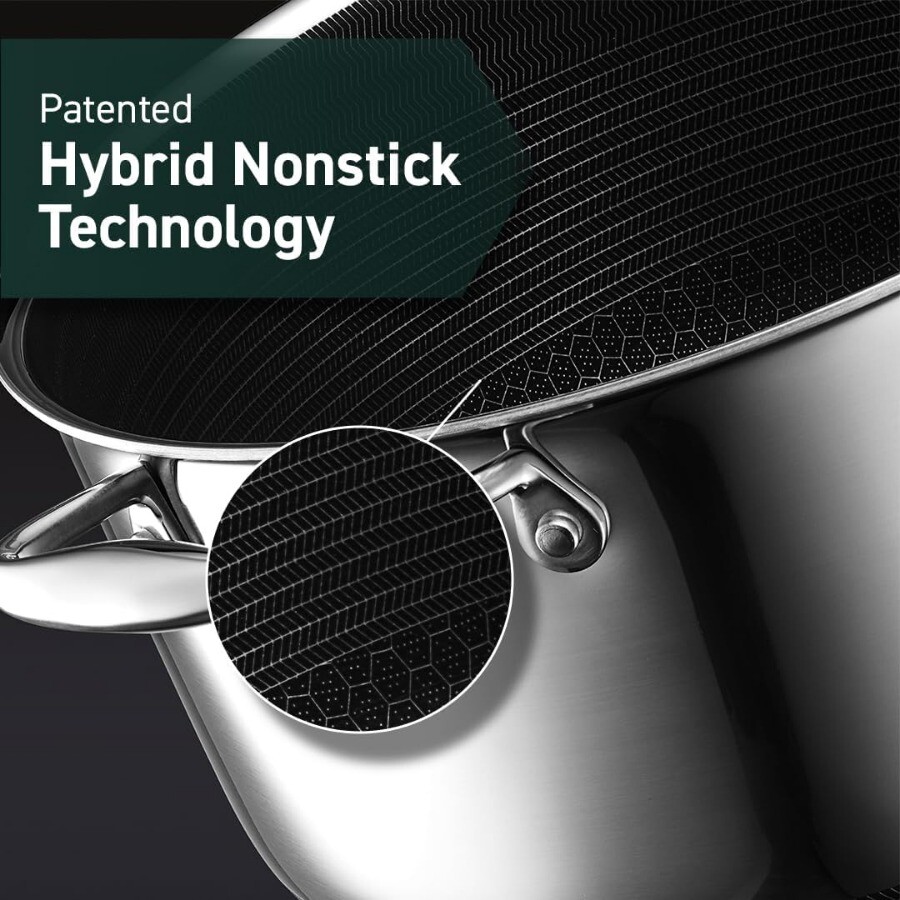 Package: 1X HexClad Hybrid Nonstick 5-Quart Dutch Oven with Stainless Steel Lid, Stay-Cool Handles, Dishwasher-Friendly, Oven-Safe Up to 900°F, Induction-Ready, Compatible with All Cooktops Description: HexClad's patented hybrid tech utilizes tri-ply construction – aluminum between two layers of stainless-steel - laser-etched with our hexagonal nonstick surface to deliver the searing power of stainless, durability of cast-iron and easy cleanup of nonstick. Half the weight of traditional enamel-coated cast-iron pots, our Hybrid 5-quart Dutch Oven is a champion at searing proteins on the stovetop and then slow braising them in the oven. Also perfect for slow-cooked stews, soups and breads. Use your HexClad cookware on any home cooktop or stovetop, including induction. Every piece is also scratch-resistant, dishwasher-friendly, and oven-safe up to 900°F. (Tempered glass lids are oven-safe up to 400°F, while stainless steel lids are oven-safe up to 900°F.) HexClad products that are sold by HexClad Cookware are backed by a lifetime warranty from manufacturer's defects. (Commercial and restaurant use excluded). Your purchase includes one HexClad 5-quart Dutch Oven and one Steel Lid. The 5-quart Dutch Oven measures approximately 10 inches in diameter, 2.5 inches in height, and 3 pounds in weight.