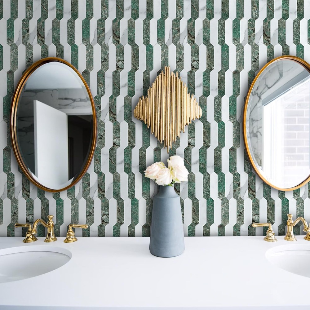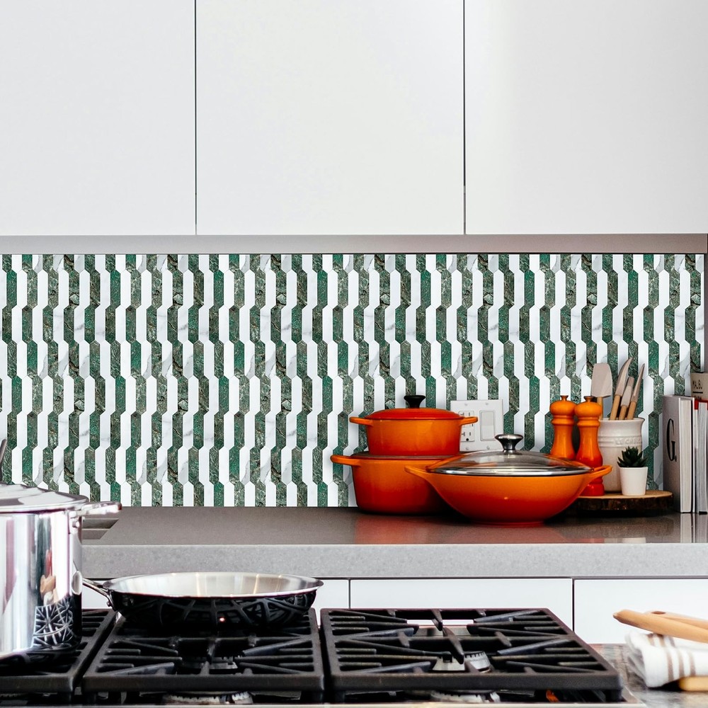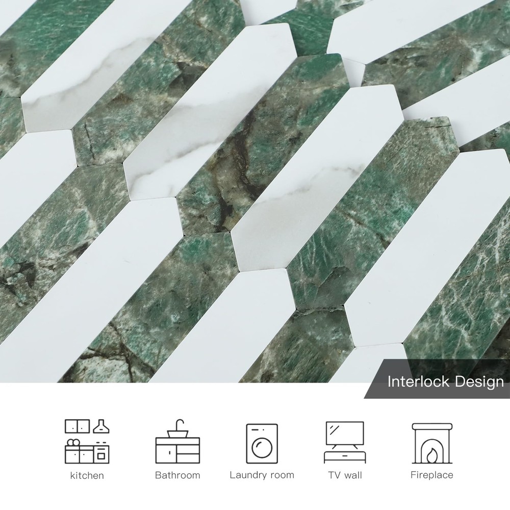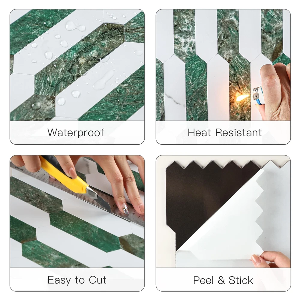 peel and stick tile backsplash are flexible and smart. Just peel and stick, no grout and contractor required, adapted to instant renovation and decoration. Peel and stick kitchen backsplash not suitable for Latex painted wall ,Repainted wall , Falling Ash wall !!! Kitchen backsplash made of anluminun composite panel and with Stronger backing adhesive backing than ordinary vinyl backsplash tile, stick firmly to the smooth & clean surface. The green marble look tiles are versatile and paired with today's popular furniture. Perfectly decorated in Kitchen island walls, bedroom walls backsplash, laundry room, Washbasin etc. Self-Adhesive Kitchen Backsplash colors never change over time, and easy wipe to remove the stain, don'