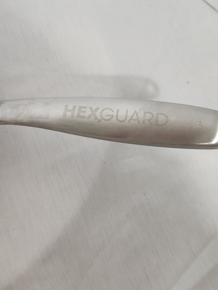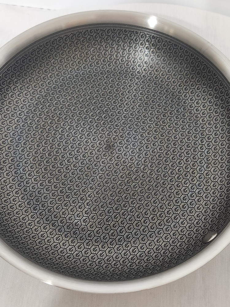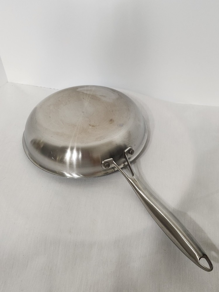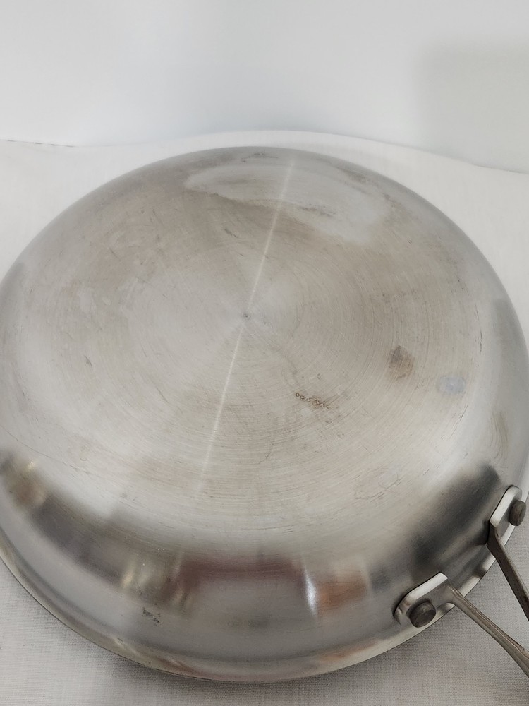 Very good used condition, little usage marks, sits flat, tri-ply, Stainless steel, frying pan