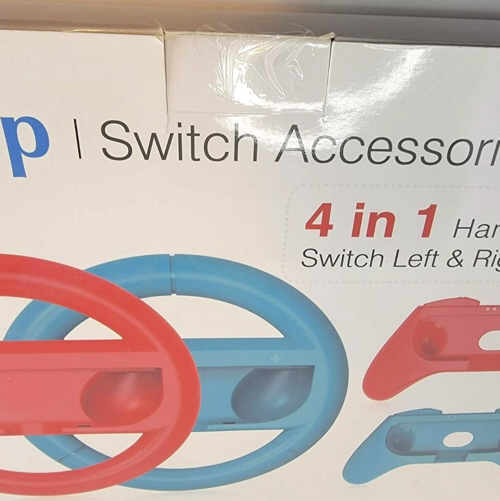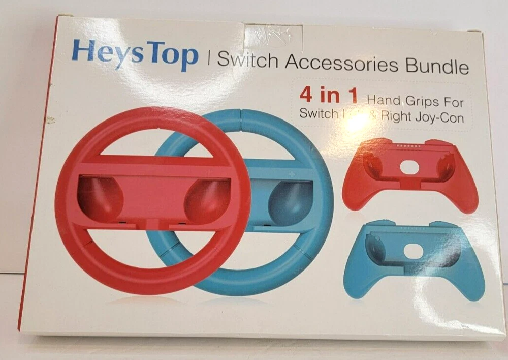 Heys Top Switch Accessories Bundle 4 in 1 Hand Grips Controller Steering Wheel Joy-Con Steering Wheel and Grip Bundle, especially designed for Switch Joy-Con 2 versions - One for normal games and one for racing games Easy installation, put the Joy-Con into the steering wheel or grip and get started Totally 4 pack - can be used by players Made of high quality materials Patent product created for gaming