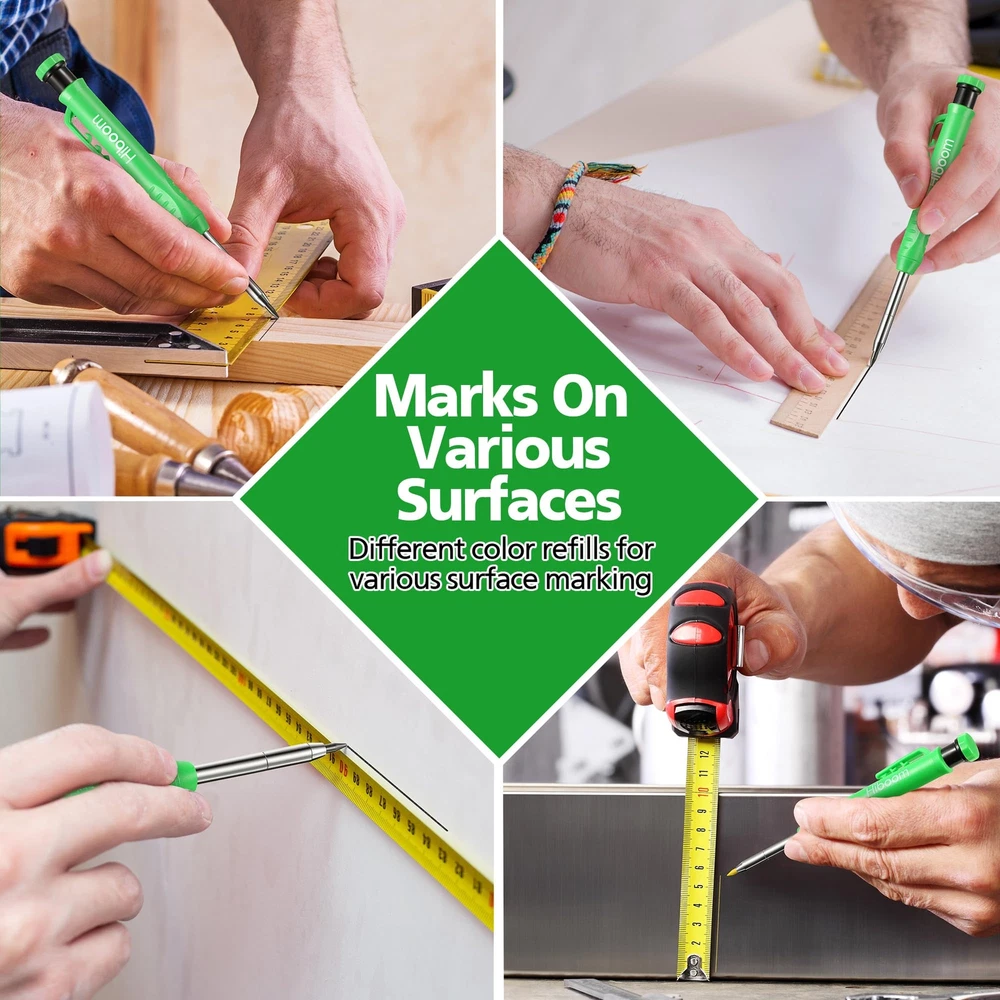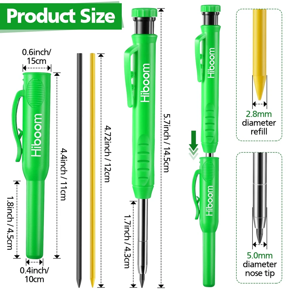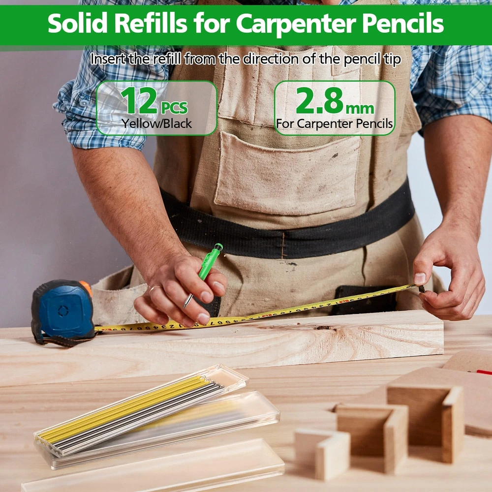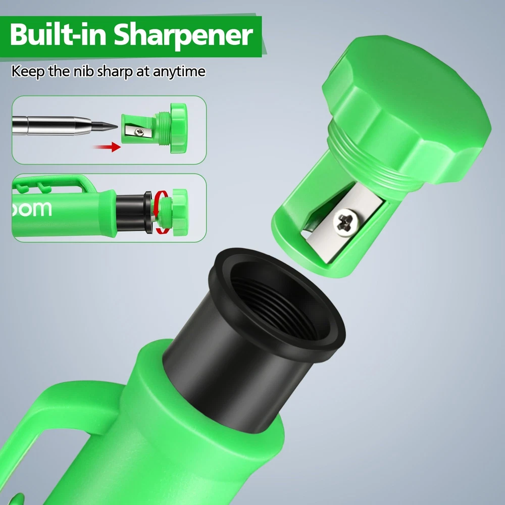 Carpenter Pencil with Sharpener, Mechanical Carpenter Pencil Set with 12 Refill, an Ideal Choice for Woodworking Features: Long nose tip for deep hole marker Built in sharpener for marks The solid carpenter pencil can draw on various surfaces such as metal, plastic, glass, wood, paper, etc The pencil clip design can be easily attached to the pocket, easy to carry 2 Colors of refills can distinguish marks with different meanings Retractable design and convenience Specifications: Material: ABS plastic, stainless steel Color: Mechanical pencils: green Pencil caps: green Pencil refills: black, yellow Package includes: 1 x Carpenter Pencil with refill inside 1 x Protective Pen Cap 12 x Refills Notes: Manual measurement, please allow slight errors on size. The color may exist a slight difference due to different screen displays. The products contain pointed parts. Keep away from children. Package includes: You will receive a woodworking carpenter pencil that pre filled with refill, a pencil protective cap and 12 pen refills, ensuring a long term usage during your work; Whether for personal use or gifting, our packaging meets your needs Protective Pen Cap Included: To keep your pen refill dry and clean at all times, our solid contractor pencil comes with a pen cap; This cap not only protects the pen tip from break but also prevents dust and debris from entering the pen, extending the lifespan of the refill. it is also convenient to carry around and is not easy to fall off Deep Hole Design for Precision Marking: Our mechanical carpenter pencil features a deep hole design tailored to reach narrow and hard to access areas in woodworking projects; With a nose tip length of 45 mm/1.8 inches, it allows for precise marking even in the tightest spaces, ensuring accuracy and efficiency in your woodworking tasks Built in Pencil Sharpener: Never lose your sharpener again; Our woodworking pencil comes with an integrated sharpener that attaches securely to the top of mechanical drawing pencils; Keep your pencils sharp for precise markings without the hassle of searching for a sharpener Widely Application: Whether you're a professional woodworker or a hobbyist, our deep hole marker meets your needs; From home repairs to professional projects, this pen is a reliable tool for marking, drawing, outlining, and various other woodworking applications