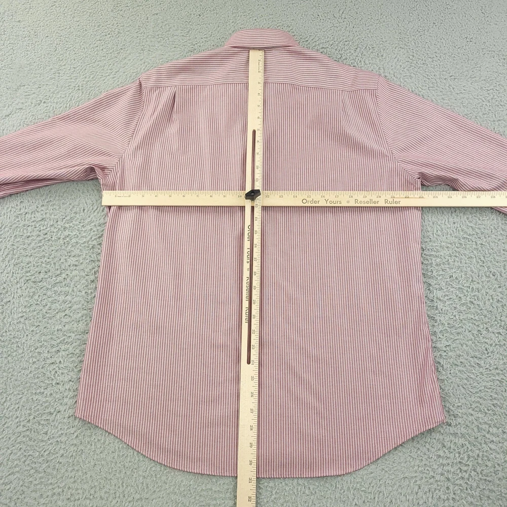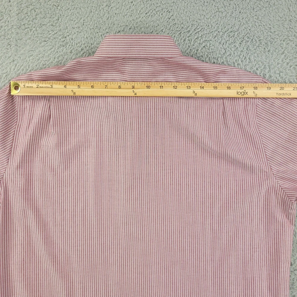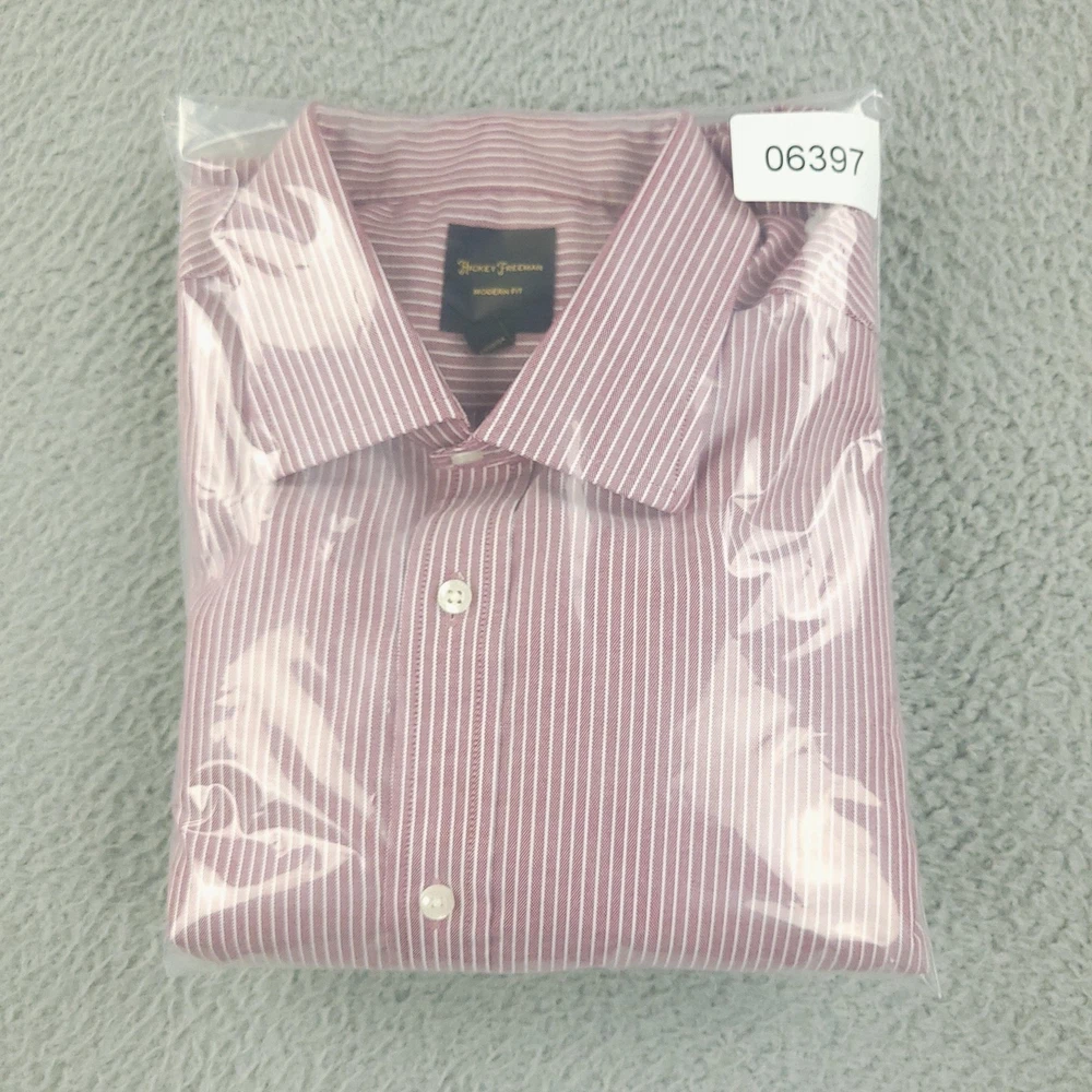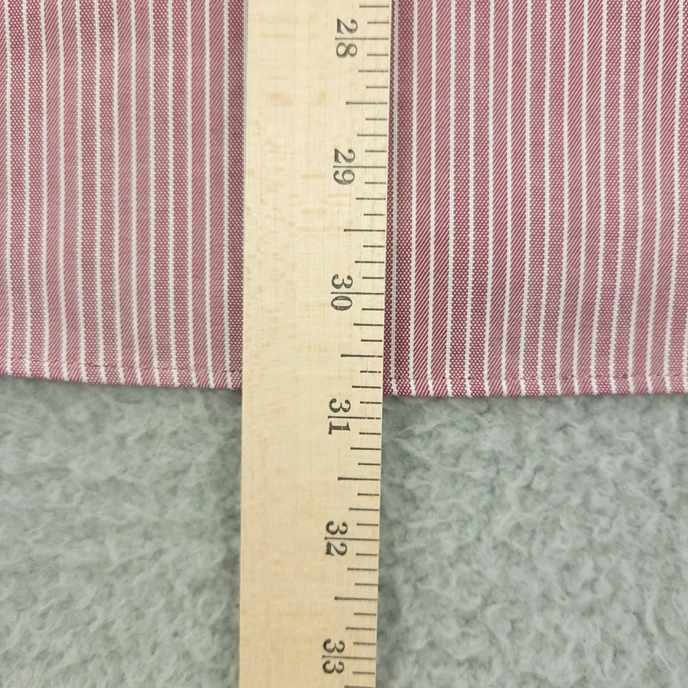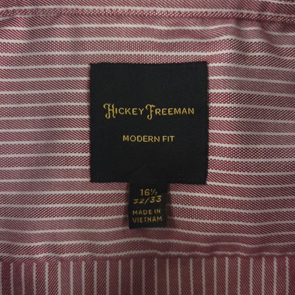 Brand: Hickey Freeman Style: Mens long-sleeve button-front dress shirt in a Modern Fit silhouette. Color/Pattern: Red and white vertical stripe. Size on tag: 16½ neck, 32/33 sleeve. Made in Vietnam. Details: Spread collar, button cuffs, curved shirttail hem, classic striped woven fabric suitable for business or smart-casual wear. Washed and dried with Fragrance Free Detergent & Dryer Sheets. Measurements are included in the photos, compare measurements with your item to ensure proper fit. (Measurements are done with the item lying flat). I ship next business day and all items include tracking. Items are added daily to my store Visit My Store Buy More & Save! Combined shipping for US customers - $1.99 for each additional item (Add items to shopping cart and discounts will automatically calculate during checkout)