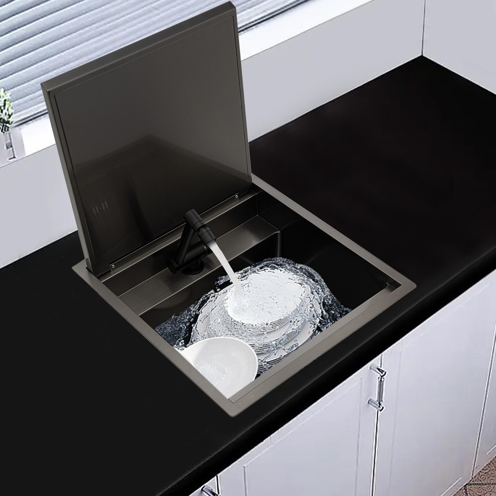 Hidden Kitchen Bar Sink Single Bowl w/Folding Faucet+ Drain+ Lid Stainless Steel