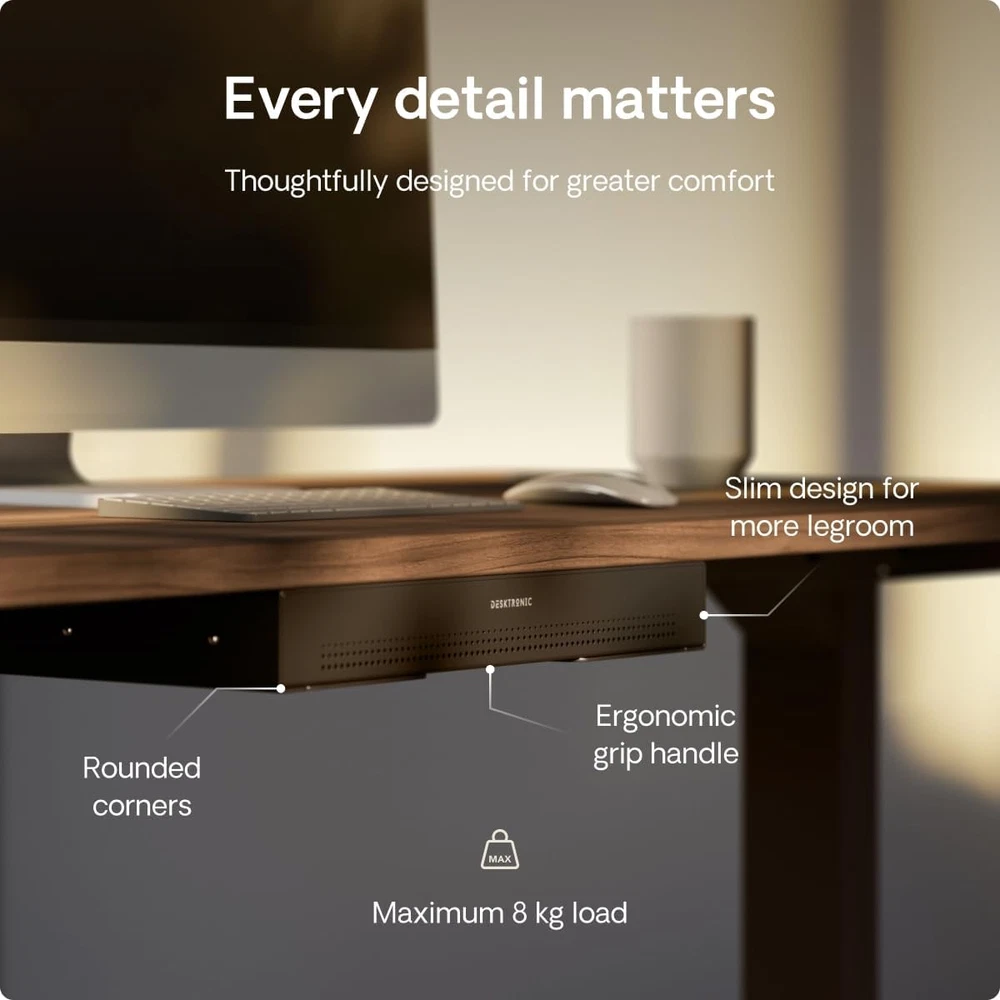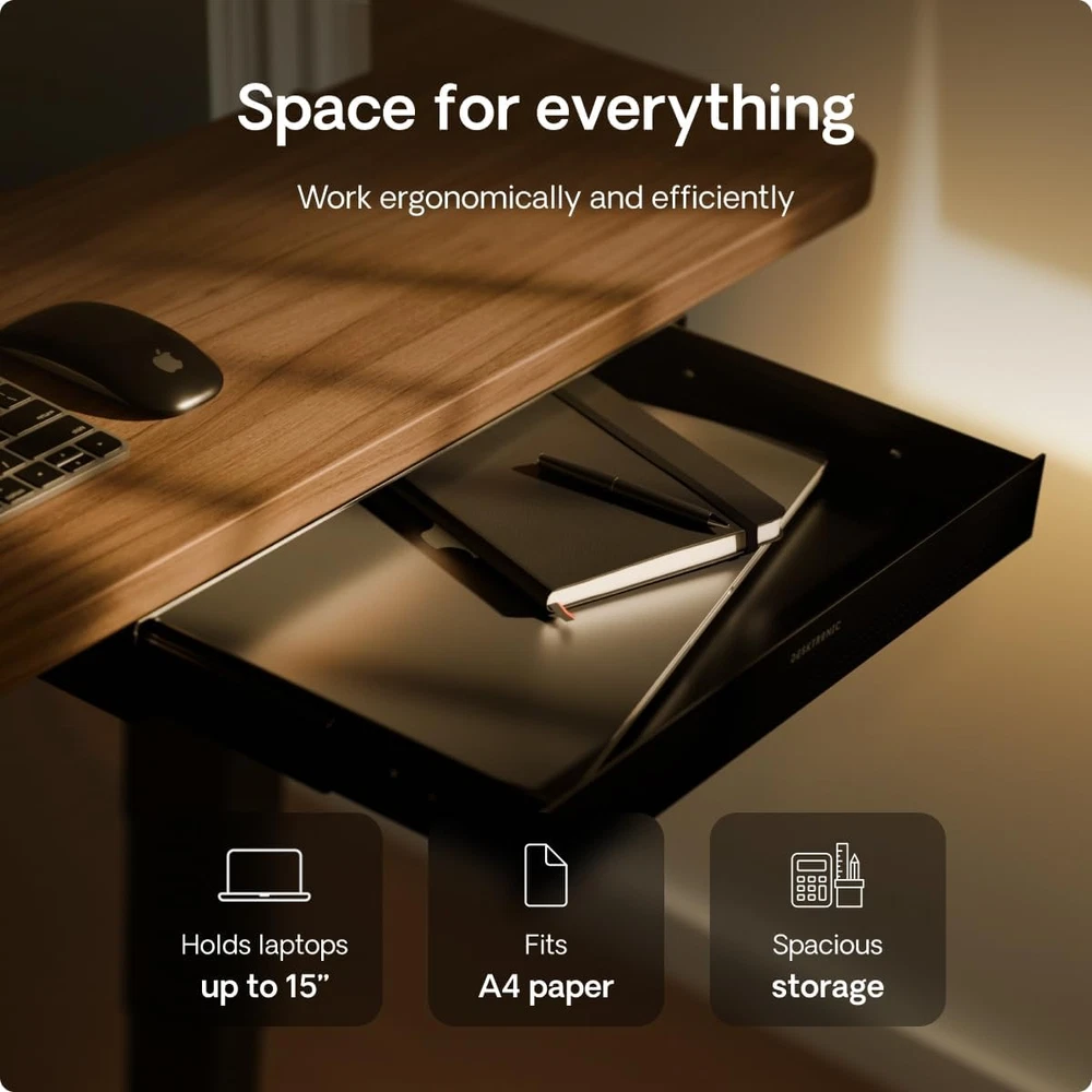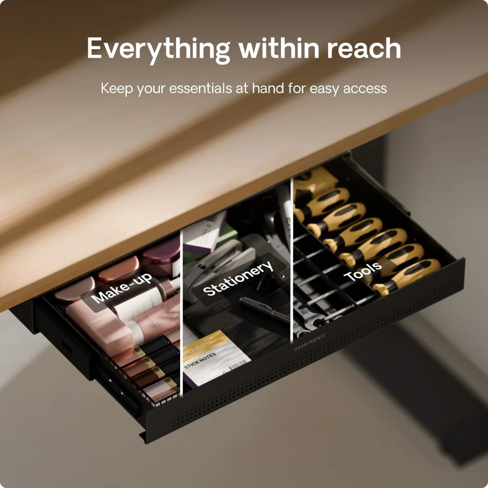 Store New Arrivals Add to Favorite View Feedback Contact Hidden Organizer, Under-Desk Storage Drawer - Easy Installation, Space-Saving, Large Capacity, Metal, for Office and Vanity - Durable Construction (Black) Description Assembly Instructions Description function(f) {var _np=(window.P._namespace("DetailPageProductOverviewTemplatesJava"));if(_np.guardFatal){_np.guardFatal(f)(_np);}else{f(_np);}}(function(P) { P.when('A').execute(function(A){ A.on('a:truncate:po-attribute-truncate-8:updated', function(data) { var isTruncated = !data.truncateInstance.getIfTextFits(); var seeMoreElement = document.getElementById('po-attribute-see-more-id-8'); if(seeMoreElement) { seeMoreElement.style.display = isTruncated ? '' : 'none'; } }) }); })); Flat bottom drawer attaches in seconds. It comes with all the necessary tools and clear instructions so you can secure the drawer quickly and effortlessly. See more Product Dimensions 41 x 27.2 x 5.08 cm; 3.5 kg Colour Name Black Assembly required Yes Item Weight 3.5 kg Colour Black Material Metal Model Number DRW-1 Item weight 3.5 Kilograms Product dimensions 41D x 27.2W x 5.1H centimetres Frame material Metal Number of drawers 1 Lasts for years: Sturdy steel under desk drawer construction will ensure long-lasting durability and the super smooth sliding mechanism opens and shuts quietly. Fits almost every table: Under table drawer is compatible with a wide range of desks and is a perfect addition to our HomeOne and HomePro desks (except for the120x60 size). Quick and easy installation: The under desk drawer is easy to attach and comes with all necessary tools and clear instructions, allowing you to quickly and effortlessly secure it. Minimal design: The metal under desk storage features a beautiful design that complements any tabletop or frame. Its sleek look enhances any workspace, making it a perfect match for various desk styles. Everything within reach: Keep your essentials within reach. Desk drawer has enough space for your phone, earbuds, pencils, paper, and desk accessories, perfect for organizing your home office or workstation. Product Description 1 Space saver 2 Perfect fit 1 Office desk 2 Dressing table 3 Workbench Desktronic Product Line: Add To Basket Add To Basket Add To Basket Add To Basket Add To Basket Add To Basket Add To Basket Customer Reviews 4.6 out of 5 stars 472 4.4 out of 5 stars 140 4.7 out of 5 stars 860 4.8 out of 5 stars 792 4.8 out of 5 stars 3,097 4.4 out of 5 stars 134 4.6 out of 5 stars 173 Price £38.99 £ 38 . 99 £69.99 £ 69 . 99 £32.99 £ 32 . 99 £349.99 £ 349 . 99 £299.99 £ 299 . 99 £369.99 £ 369 . 99 £249.99 £ 249 . 99 Product Desk drawer Single monitor stand Desk Cable Tray Height-adjustable desk Height-adjustable desk Ergonomic office chair Ergonomic office chair Best for Every desk Every desk Every desk Home & small / large office Home & small office Home & office Home & office Special feature # 1 Smooth gliding mechanism Space saving technology Metal construction Fast dual-motor system 50mm/s Fast dual-motor system 30mm/s Made larger and wider Made larger and wider Special feature # 2 Sturdy metal construction 360° rotation Larger to fit power adapters Maximum Stability Rating A++ Maximum Stability Rating A++ 10 Adjustable Points 6 Adjustable Points Special feature # 3 Spacious for work essentials Wide compatibility 5 cutouts - easy cable routing European one-piece tabletop European one-piece tabletop Pressure Relief Seat Cushion Pressure Relief Seat Cushion Special feature # 4 Quiet opening and closing Sturdy metal construction 10x Cable Ties Included Built-in Charging Ports Built-in Charging Ports Soft & Wide 3D Armrest Soft & Wide 4D Armrest Customization options Black, white, grey Black, white Black, white, grey 75 color/size variations 45 color/size variations Black, grey Black, grey Max weight / load capacity Up to 5 kg Up to 8 kg Up to 5 kg Up to 160 kg Up to 120 kg Up to 136 kg Up to 136 kg Easy Assembly ✔ ✔ ✔ ✔ ✔ ✔ ✔ ABOUT US At TheNextDayShipper, we always put the customer first - that's why we offer free next day delivery and 30 day returns on all of our products SHIPPING We’re a UK-based seller, dedicated to getting your order to you as quickly as possible. We ship all orders the same day and deliver next day across the UK, completely free of charge. While we work hard to ensure every parcel arrives on time, please understand that factors such as weather conditions, postal delays, or courier performance may occasionally be outside our control. For international buyers, we use eBay’s Global Shipping Programme . Your item will first be sent to eBay’s UK distribution centre and then forwarded to your country. International customers are responsible for any import duties or taxes, and any queries regarding the Global Shipping Programme should be directed to eBay directly. RETURNS We offer a 60-Day Return Policy on items in which you are not completely satisfied with. You have the option of a full-refund or an exchange of the item. No returns are available on items shipped outside of the UK. PAYMENT We accept PayPal. CONTACT US This page content is yet to come Please ad us to your favorite seller and visit again later Thank You CUSTOMER SATISFACTION We try our very best to make sure every customer is completely satisfied. If there's a problem, message us! We're happy to help and always reply within 24 hours. WE ACCEPT