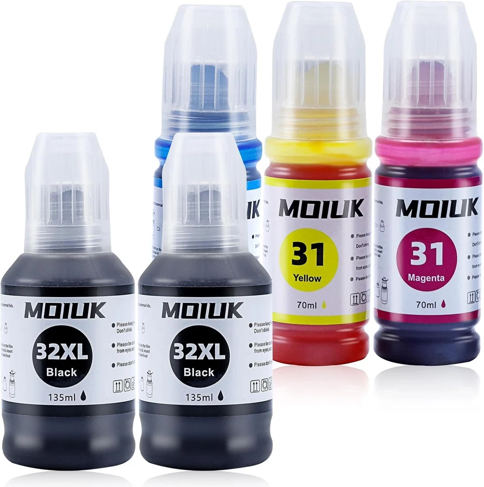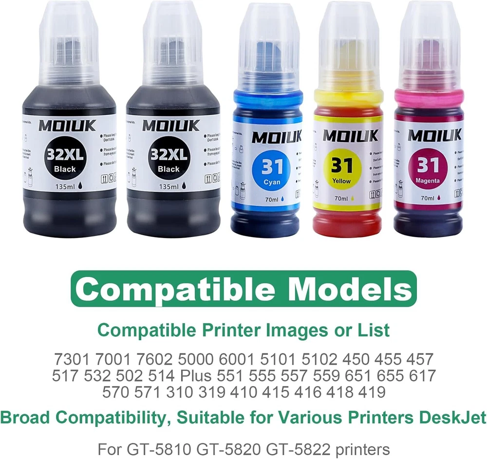 Compatible with HP 31 32XL Ink Refill Set:For HP Smart-Tank Printers: 5000, 7301, 7602, 7001, 6001, 5101,For HP Smart Tank Plus Printers: 617, 655, 651, 551, 502, 514, 517, 532, 555, 557, 559, 570, 571, 450, 455, 457,For HP Ink Tank Printers: 310, 319, 410, 415, 416, 418, 419,Compatible With: HP DeskJet GT-5810, GT-5820, GT-5822 printers Outstanding Print Quality: Delivers crisp text and vibrant colors, ensuring professional-quality prints for all your documents and photos.Suitable for home, office, school, and business use, providing consistent results across a variety of printing needs. Compatible High-Capacity HP 31 32XL Ink Refill Set:With five bottles in total, you'll have more than enough ink to keep your printer running smoothly for a long time. translates to more pages printed per refill cycle,reducing overall costs per page and saving time spent on frequent replacements. Easy Replacement: Each bottle is designed to securely contain an ample amount of ink, allowing for mess-free refills and preventing leaks or spills during the replenishment process. The ergonomic design facilitates easy handling and precise pouring into the designated ink tanks. Just hold the bottle with your hand. What You Get:Includes two bottles of black and 1*C+1*M+1*Y ink Total 5 bottles,Each bottle is in its own shrink wrap plastic to keep it fresh.Comes in a nice colorful cardboard box in case you wanted to use it as a gift. Product Description 🎨 Unlock Vibrant Colors & Crisp Prints! Upgrade your printing experience with our High-Capacity Compatible Ink Refill Bottles , designed exclusively for HP Smart Tank 7301, 7602, 5000 series. Whether you’re printing documents, photos, or projects, enjoy professional-quality results every time! 🖨️✨ ✔️ High-Yield Performance : Print more for less—ideal for home, office, or school use. ✔️ Seamless Compatibility : Engineered for smooth operation with your HP Smart Tank printer. ✔️ Eco-Friendly : Reduce waste with refillable bottles. 🌱♻️ ✔️ Easy to Use : Simple refill process—no mess, no hassle! 💸 FREE Shipping on Every Order! Shop with confidence and save more with free delivery . Your ink refill will arrive quickly, ensuring minimal downtime for your printing needs. 🚚💼 Why Choose Us? ✅ Trusted Seller with a Proven Track Record ✅ Top-Notch Customer Support ✅ 100% Satisfaction Guaranteed or Your Money Back