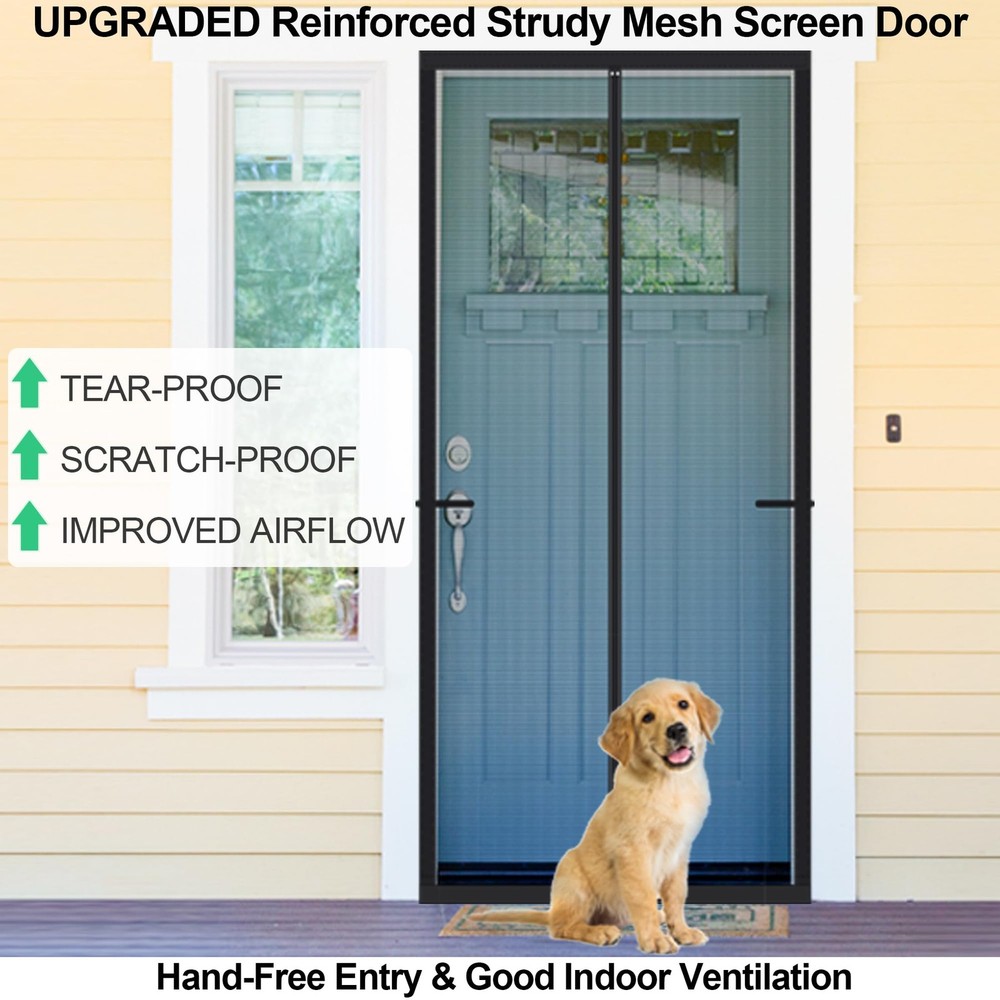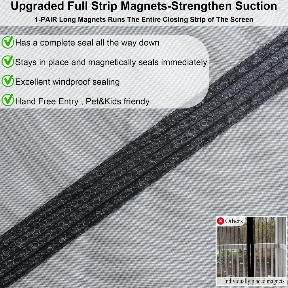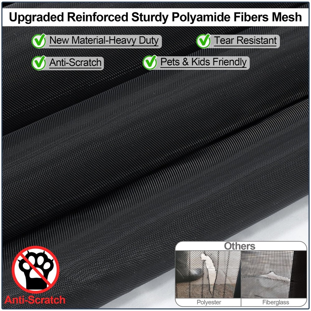 Upgraded Polyamide fiber Mesh- Scratch Resistant:Made of Polyamide fibers Which are commonly used in various applications due to their unique properties such as high strength, durability, and resistance to wear and tear.Such as fishing lines.Polyamide fiber Mesh is Much stronger than ordinary polyester or fiberglass screen door mesh. It is sturdy, tear-proof, and scratch-proof, so there is no need to worry that the magnetic screen door for sliding door will be broken in a short time. FULL STRIP MAGNETS for Tight Seal - Our upgraded magnetic Mosquito door net uses 1 pair of long magnetic strip in the middle closing strips instead of individually placed magnets, which will let the screen door have a complete seal all the way down,no more gaps.With stronger magnetic force, the wind resistance of the screen door increases by 80%,Good idea for screen door cover for front doorway. PET FRIENDLY SCREEN: Constructed with reinforced thicker anti-tear mesh,our magnetic screen door is built to withstand daily use and resist wear and tear,it is also lightweight enough for children and small dogs and cats to walk through and open without using hands.So it’s a good choice as a pet screen door. EASY TO INSTALL: Screen Door Measures 40“x 83", Fits Door Sizes: 38"x 82".It is super simple, quick and fast to install the sliding screen door. Simply attach it to the door frame with the included Hoop&Loop Tape strips. Extra push pins are included for added security and strength. For best adhesive results, clean and dry surface properly. Double Reinforcement:Full Frame Widen Adhesive Tap Strip-1.5 Inch,make sure maximum stability for longer use.Unique double reinforcement in Top Middle,Protects the top middle of the patio screen door for tearing.