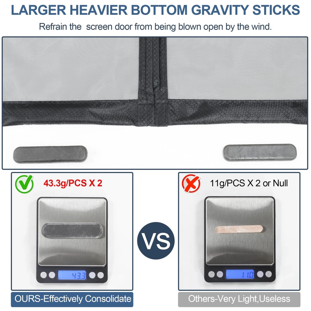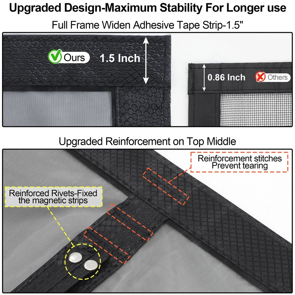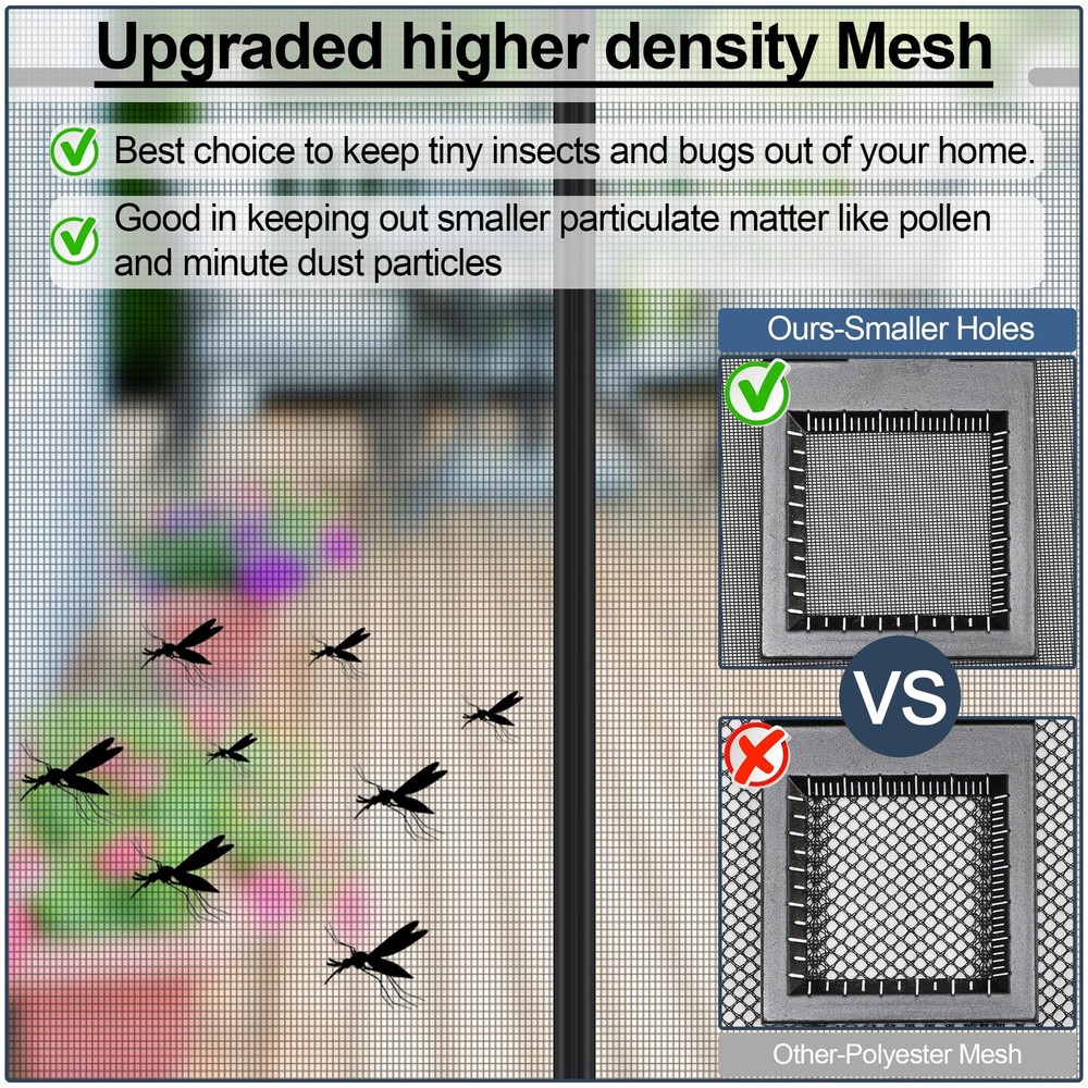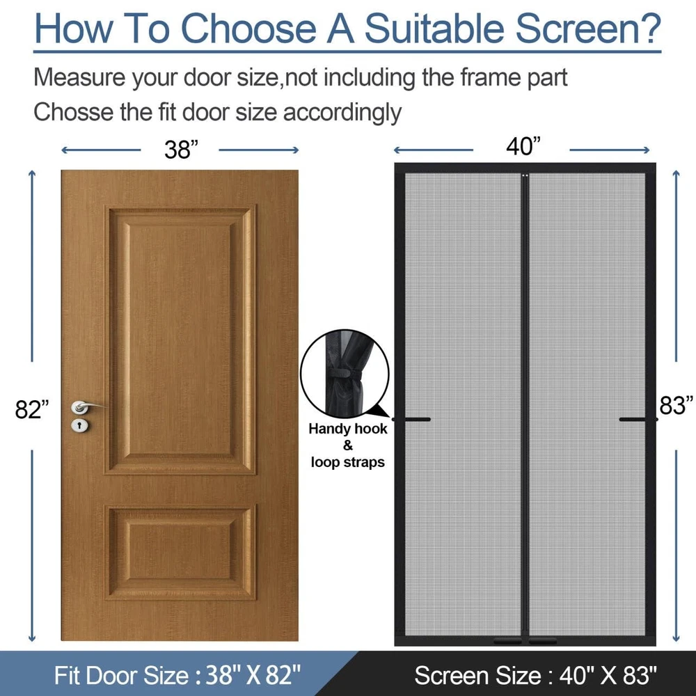 Upgraded Polyamide fiber Mesh- Scratch Resistant:Made of Polyamide fibers Which are commonly used in various applications due to their unique properties such as high strength, durability, and resistance to wear and tear.Such as fishing lines.Polyamide fiber Mesh is Much stronger than ordinary polyester or fiberglass screen door mesh. It is sturdy, tear-proof, and scratch-proof, so there is no need to worry that the magnetic screen door for sliding door will be broken in a short time. FULL STRIP MAGNETS for Tight Seal - Our upgraded magnetic Mosquito door net uses 1 pair of long magnetic strip in the middle closing strips instead of individually placed magnets, which will let the screen door have a complete seal all the way down,no more gaps.With stronger magnetic force, the wind resistance of the screen door increases by 80%,Good idea for screen door cover for front doorway. PET FRIENDLY SCREEN: Constructed with reinforced thicker anti-tear mesh,our magnetic screen door is built to withstand daily use and resist wear and tear,it is also lightweight enough for children and small dogs and cats to walk through and open without using hands.So it’s a good choice as a pet screen door. EASY TO INSTALL: Screen Door Measures 40“x 83", Fits Door Sizes: 38"x 82".It is super simple, quick and fast to install the sliding screen door. Simply attach it to the door frame with the included Hoop&Loop Tape strips. Extra push pins are included for added security and strength. For best adhesive results, clean and dry surface properly. Double Reinforcement:Full Frame Widen Adhesive Tap Strip-1.5 Inch,make sure maximum stability for longer use.Unique double reinforcement in Top Middle,Protects the top middle of the patio screen door for tearing.