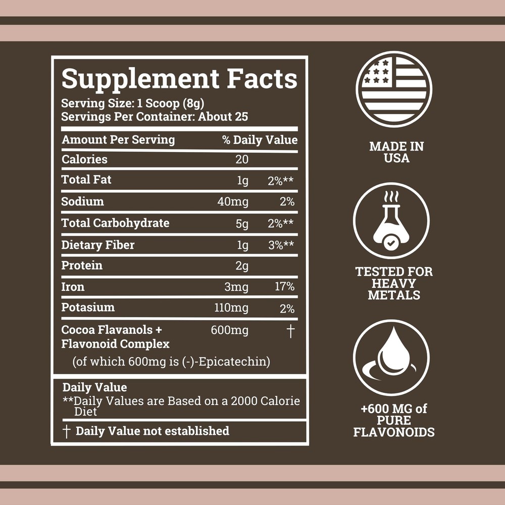 Introducing High Flavanol Cocoa Powder, a superior dietary supplement meticulously crafted to bolster heart health, elevate energy levels, and enhance overall wellness. This exceptional cocoa powder distinguishes itself by delivering a potent dose of 1200mg of cocoa flavanols per serving—12 times the amount found in standard cocoa powder. Each scoop is fortified with 600mg of flavonoids and 150mg of epicatechin, key components known for their heart-protective and energy-boosting properties. High Flavanol Cocoa Powder is made from the finest cocoa beans selected for their high flavanol content. Through minimal processing, we preserve the natural flavanols that are often lost in conventional cocoa powders. Our has been rigorously tested for heavy metals, ensuring that you receive all the benefits of pure cocoa powder without any impurities. Enriched with cocoa flavanols, flavonoids, and epicatechin supplements, making it a powerful cardio health ally. These compounds are scientifically proven to improve blood flow and reduce blood pressure, thereby enhancing cardiovascular health. Additionally, the increased nitric oxide production from our epicatechin supplements aids in delivering essential oxygen and nutrients throughout the body, further boosting energy and vitality. Moreover, it supports brain health due to its high content of cocoa flavanols and flavonoids. These substances contribute to enhanced cognitive functions, providing antioxidant and anti-inflammatory benefits that protect against oxidative stress and aid in maintaining mental acuity. In summary, High Flavanol Cocoa Powder offers a robust blend of cocoa flavanols, flavonoids, and epicatechin in a high-quality, pure cocoa powder form. It is your go-to supplement for enhancing heart, cardio, and brain health, providing a substantial energy boost, and ensuring you receive the antioxidant protection necessary for optimal health. 1200MG PER SERVING – Our Cocoa delivers a whooping 600 mg of flavanols and 600mg of flavonoids per scoop, 10X more flavanols (epicatechin) than standard cocoa powder. Sourced from high-flavanol cocoa and minimally processed to maximize muscle, heart, and performance benefits. ENRICHED WITH HEART-PROTECTING FLAVONOIDS: Not only do we have 600 mg of flavanols but we also enhanced our cocoa with 600mg of flavonoids cocoa per serving. This creates a unique & synergistic solution to enhance heart health by improving blood flow, reducing blood pressure, and combating oxidative stress and inflammation. SUPPORTS HEART & CARDIO HEALTH: Our product Leverages the synergistic effects of cocoa flavonoids and flavanols to offer comprehensive solution for cardiovascular health. Flavanols boost blood flow, enhancing oxygen and nutrient delivery body-wide while Flavonoids offer antioxidant and anti-inflammatory protection, preventing cell damage. EPICATECHIN NITRIC OXIDE POWER: Boosted with 600mg of epicatechin, our high flavonoid dark chocolate supplement supports nitric oxide levels, promoting blood flow and nutrient delivery from head to toe. USA PROUD AND VEGAN SAFE: ’s Cocoa Flavanols supplement is manufactured in a GMP Approved Facility and tested for safety and heavy metals right here in the USA, Non-GMO, Gluten Free, and Vegan Safe.