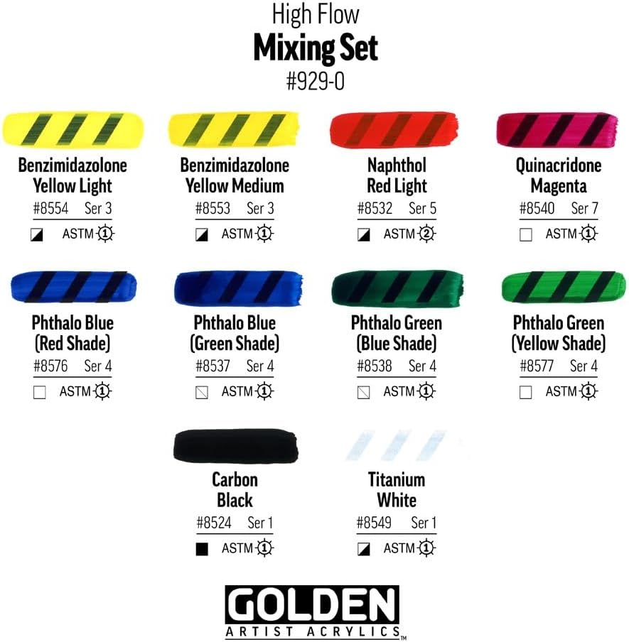 Store New Arrivals Add to Favorite View Feedback Contact High Flow Acrylics by GOLDEN, High Flow Mixing Set, 10 Colors, Professional Acrylic Paint Description Item model number 0000929-0 Part Number 0000929-0 Style Set Item Volume 10 Fluid Ounces Item Package Quantity 1 Color Multicolored Product Dimensions 2.38 x 5.94 x 4 inches Warranty Description No Warranty Item Weight 14.6 ounces Batteries Included? No Coverage Medium Batteries Required? No Package Information Bottle Special Features Washable Size 10 fl oz Paint Type Acrylic A warm and cool choice of each primary color in addition to other key colors allows the artist to mix an extensive range of colors with a limited palette Includes: Benzimidazolone Yellow Light, Benzimidazolone Yellow Medium, Naphthol Red Light, Quinacridone Magenta, Phthalo Blue (Red Shade), Phthalo Blue (Green Shade), Phthalo Green (Blue Shade), Phthalo Green (Yellow Shade), Carbon Black, and Titanium White PROFESSIONAL QUALITY colors combine the durability of acrylics with the versatility of ink, great for drawing, staining, dripping, pouring, calligraphy, color washes and spraying EXCEPTIONAL UTILITY – Formulated with flow improvers and retarders so colors are ready to use in dip pens, refillable markers or airbrushes with no thinning required. Made in the USA with globally sourced materials by an employee-owned company with more than 40 years of experience making paint for professional artists HIGH FLOW ACRYLICS are an ultra-thin paint with ink-like consistency that provide incredible versatility. They can go directly from bottle to airbrush, refillable marker or dip pen and work great for drawing, staining, dripping, pouring, calligraphy and color washes. High Flow offers a palette that includes many single-pigment colors, as well as Fluorescent and Iridescent colors. While it acts like an ink, it’s an acrylic so it's compatible with other GOLDEN Acrylic colors and mediums. ABOUT US We offer the best prices around on high quality products. Our E-store includes media such as books, movies, music and games while offering electronics, toys, sporting apparel, clothing, tools, general home, garden items and more. SHIPPING We are always working hard to ensure your package arrives as soon as possible. Please understand that some factors like weather, high postal traffic, and the performance of shipping companies are outside of our control. We offer free shipping to the lower 48 states and ship within 2 business days of payment, usually sooner. We do not accept P.O. Boxes. Please provide a physical address. RETURNS We offer a 30-Day Return Policy on items which you are not completely satisfied with. You have the option for a full-refund or an exchange of the item. No returns are available on items shipped outside of the USA. PAYMENT We accept PayPal. CONTACT US This page content is yet to come Please ad us to your favorite seller and visit again later Thank You CUSTOMER SATISFACTION We try our very best to make sure every customer is completely satisfied. If there's a problem, message us! We're happy to help.