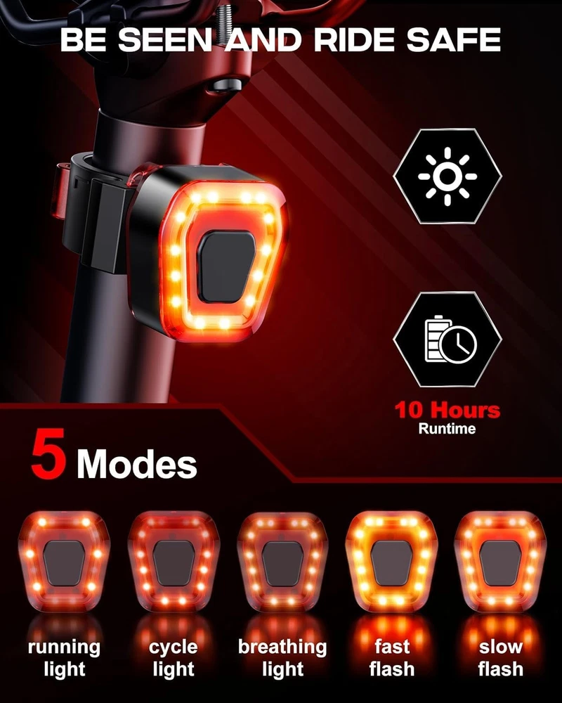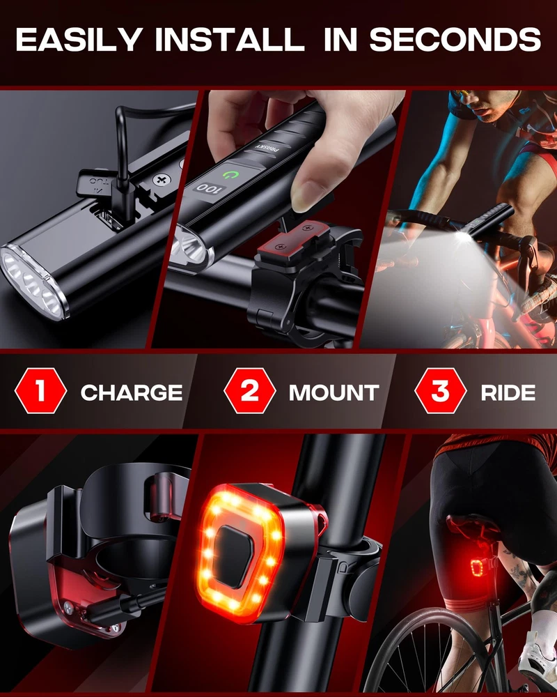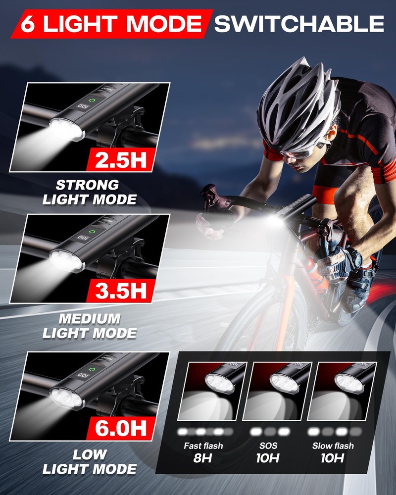 1. Bright, extra wide, long-range beam, improves visibility. This front and rear rechargeable LED bike light kit allows you to ride safely and stay visible day and night. The bright high lumen headlight and taillight emit powerful beams that caution approaching cars and pedestrians from all angles. 2. 6+5 Multiple Light Modes The headlight has 6 lighting modes: strong/medium/low brightness/fast flash/SOS/slow flash. Quickly double-click the headlight power button for flashing modes. The taillight has 5 lighting modes: running/cycling/breathing/fast/slow flash. 3. Bike light with battery display, lets you know your battery level at any time, making sure you don't lose light when riding at night suddenly. 4. Designed with an all-metal body and IPX65 waterproof rating, you can rely on these flashlights in the rain as well as dirt road conditions. Versatile, durable, and easy to use, this set is the best safety lighting combination for more than just biking. Use it during running, hiking, camping, dog walking, night activities, power outages, etc. Mount it to a scooter, stroller, or wheelchair, or even use it with your helmet in place of a headlamp. And can be used as an emergency flashlight, and put in the car, basement, attic, and emergency kit. 5. It can be installed and removed without tools. High Brightness and Securely Lock: 's high-performance bike lights have a maximum output of high lumens, reaching distances of up to 500ft with a wider angle view, illuminating the road as you ride at night. The bicycle lights front and rear can be securely and easily installed in seconds without the need for any tools. C-clamp handlebar brackets are more stable and durable than other rubber straps 6+5 Light Modes: The bike front cycling lights features a one-touch switch with 6 different lighting modes to suit your needs, including strong/medium/low brightness, fast flash, SOS, and slow flash. The taillight includes 5 different lighting modes: running/cycle/breathing light and fast/slow flash, designed to alert following cars or people. You must double-click the bike headlight switch to enter flashing modes quickly Long Runtime and LED Screen: Our bicycle light is equipped with a 5000mAh large capacity battery. It operates for over 10 H in low brightness mode, catering to your extended riding lighting requirements. Featuring an LED display, you can easily monitor the battery level and avoid the concern of running out of power Military Grade and IPX65 Waterproof: The LED road bike light is crafted with a premium aluminum alloy shell, offering excellent impact resistance and heat dissipation, ensuring durability and longevity. The bike lights for night riding with an IPX65 water-resistant rating, you can enjoy cycling even in rainy, snowy or foggy conditions Versatile, More Than Bike Accessories: This bicycle headlight integrates a USB port for emergency phone charging, ensuring backup power during rides. It can be widely used in various scenarios as emergency flashlights. Use mountain bike lights front and back while cycling, hiking, running, camping, walking pets, or some emergency situations What You Will Get: Bike headlight*1, bike taillight*1, type-c to USB cable*2, user manual*1, bracket*2. Replacement of the mount within 1 year. For your best experience, please fully charge the bike lights front and back before your first use. Recommended to use a 5V-1A or 5V-2A charging device to charge this bike light