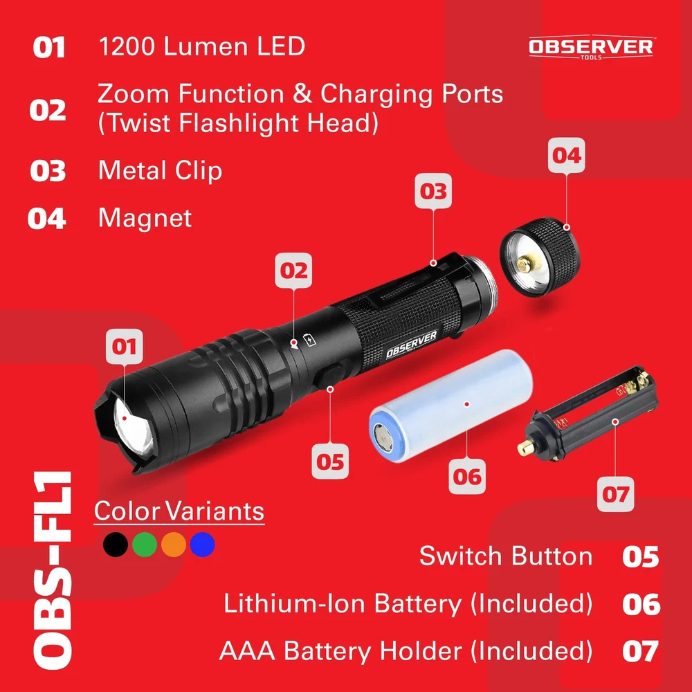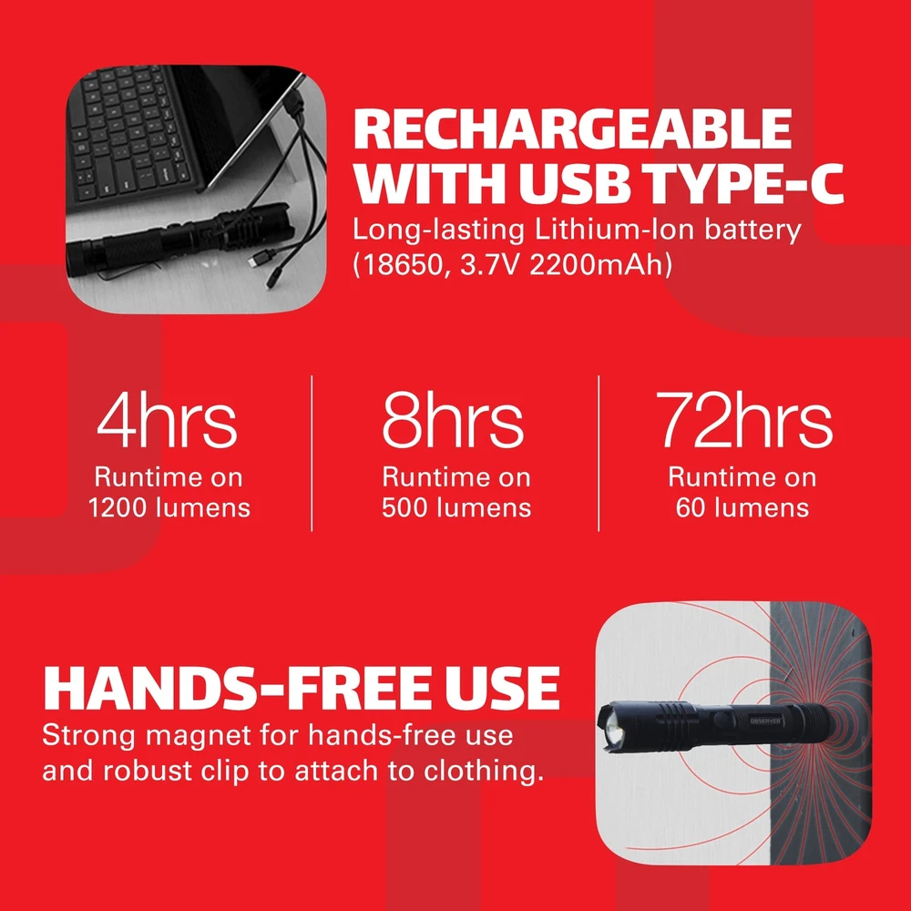 【X-Factor】This is the most feature-rich flashlight on the market (Powerful, Rechargeable, Up to 72h Runtime, Power Bank, Dual-Power, Magnet, Zoom, Waterproof). Don’t settle for just a few features when you can have it all in one LED flashlight. 【High-Power Tactical Light】1200 Lumen on High (500 Lumen on Low, 60 lumens on Ultra-Low) and 886 ft (270 m) beam distance for maximum illumination from your tactical flashlight rechargeable. Zoom capability allows you to adjust the military flashlight beam width. 【Rechargeable Flashlight】Long-lasting lithium-Ion battery delivers significant savings vs. disposable batteries. Runtime: 4-hours on High, 8-hours on Low, 72-hours on Ultra-Low (perfect for power outages and other emergencies). Charge before first use using the included USB Type-C charging cord (plug not included). 【Power Bank to Charge Your Devices】Power bank allows you to use this rechargeable flashlight as a phone charger. Unique 3-in-1 charging cord comes with Apple Lighting, micro-USB and USB Type-C connectors. 【Survival Flashlight】AAA battery holder (included) takes three AAA batteries (not included) and can replace the rechargeable battery so your rechargeable tactical flashlight always has a back-up power supply.