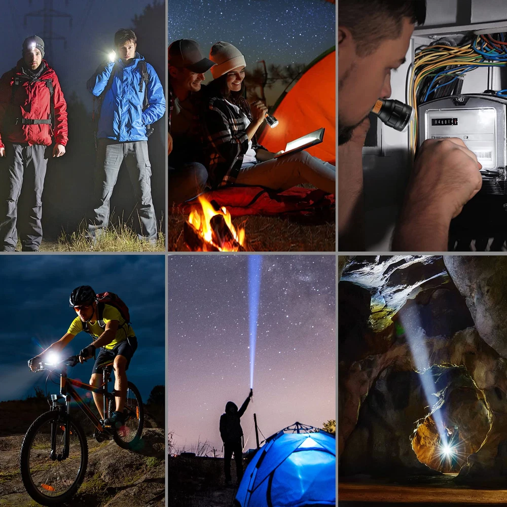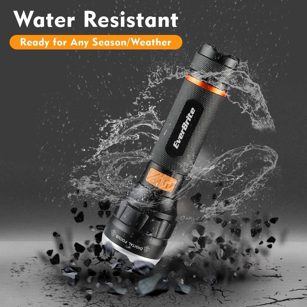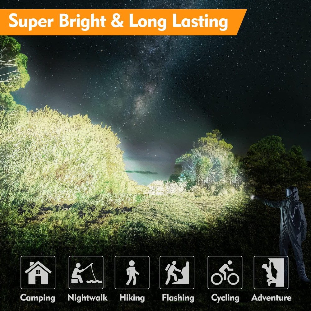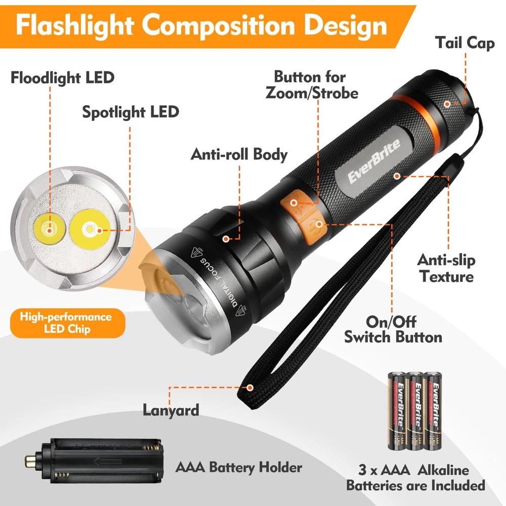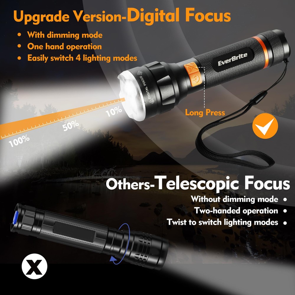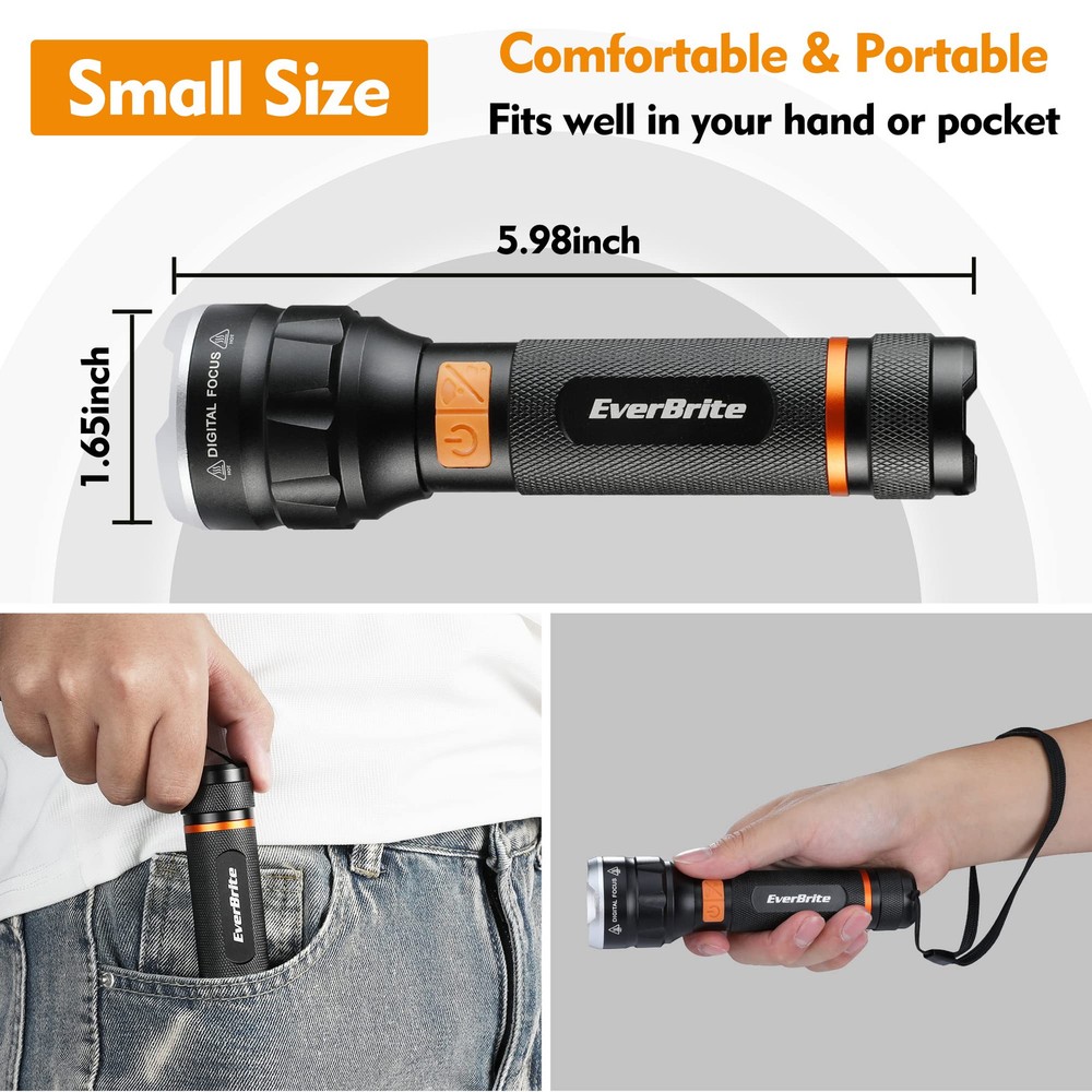 Super Bright Flashlight: The super bright led flashlight adopts the newly upgraded two LED, and the beam distance of the flashlight is up to 328Ft. Luminous flux is about 500 lumens in full brightness. Easily light up an entire room Digital Focus Flashlight: The flashlight uses digital focus to adjust light changes, one-hand operation, and can easily switch between spot, flood and strobe light modes, no need to operate with two hands like ordinary telescopic focus flashlight. Long press the button, you can also adjust the brightness of the light (0-100%), and at the same time realize the continuous alternating cycle of spotlight and floodlight 4 Lighting Modes: The flashlight features 4 lighting modes: Floodlight, Spotlight, Strobe, and Dimming Mode, allowing you to choose your level of brightness for any given situation. In spotlight mode, the concentrated intense beam has a range of up to 328 feet, with a clear beam and a long range. In the floodlight mode, the irradiation area is large, the field of vision is wide, it is safer to use the flashlight outdoors, and the range is also up to 164 feet One Hand Operation & Small Size: Compared to other flashlights, our flashlights are designed with two buttons that can control on/off and zoom in/out. This unique design allows users to control the flashlight with one hand. Our flashlight is portable in small size, with a strap, easy to carry and put in pocket Water Resistant & Skid-proof Design: The LED Flashlight is constructed of a sturdy aluminum alloy body that can withstand scratches and corrosion, as well as withstand the effects of accidental drops, temporary flooding, and freezing. Ideal for camping, hunting, dog walking, power outage, and other indoor or outdoor activities