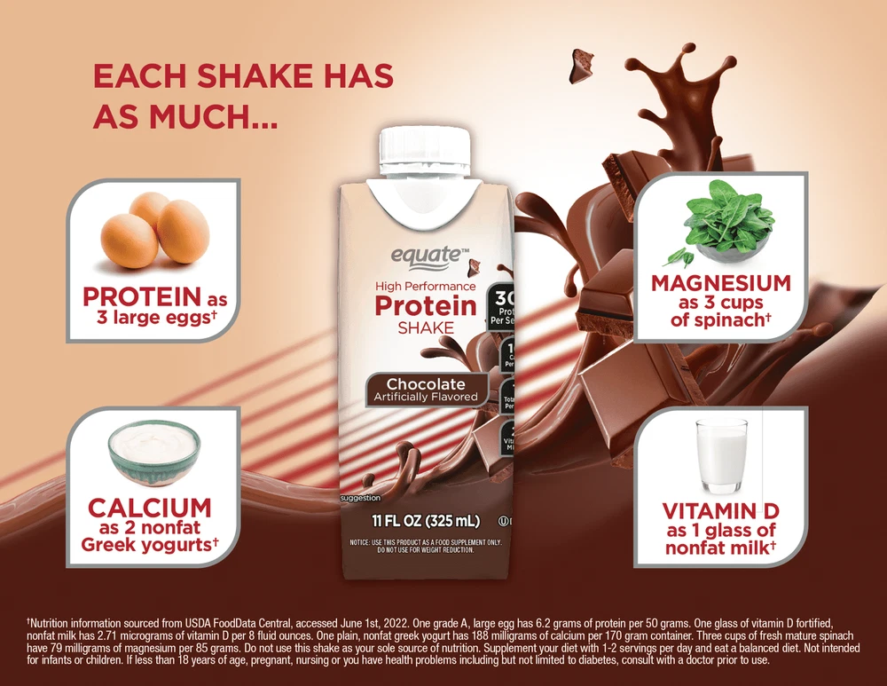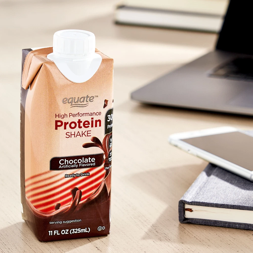 Product details Equate High Performance Protein Shakes are ready to drink and come in a variety of delicious flavors. These nutrition-packed shakes deliver 30 grams of protein, 24 vitamins and minerals, and only one gram of sugar per serving. Packed with iron, calcium, and vitamin D, these shakes are a nutritious option when you're trying to curb hunger or need something convenient while on the go. This pack comes with 12 protein drinks, so it's easy to stock up for continued enjoyment. Satisfy your appetite with the great taste of Equate High Performance Protein Shakes. Making the right health decisions can be challenging. With a complete range of products and simple solutions, Equate allows you to take care of your family with confidence. Easy-to-drink shakes 30g of protein and 24 vitamins and minerals per serving Excellent source of iron, calcium and vitamin D Gluten-free beverage Delicious chocolate flavor