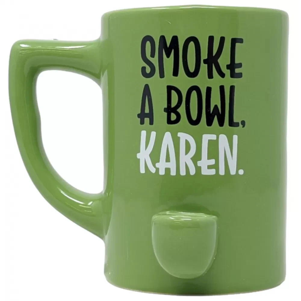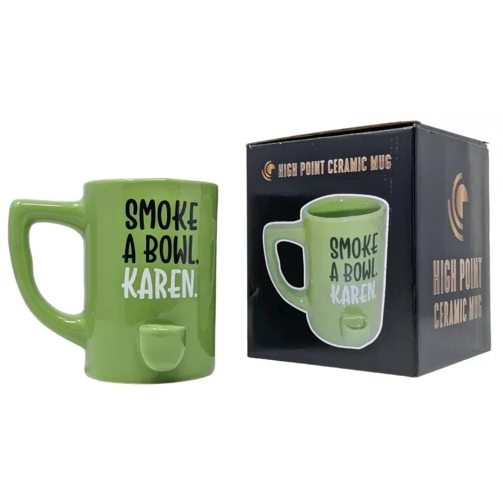 High Point Ceramic Green Smoke a Bowl Karen Mug Hand Pipe Product Description: The High Point Ceramic Green "Smoke a Bowl, Karen" Mug Hand Pipe is the ultimate blend of humor, functionality, and bold design. With its vibrant green ceramic finish and the cheeky phrase "SMOKE A BOWL, KAREN." , this mug is perfect for those who enjoy a good laugh with their morning coffee. Designed for dual use, it functions as both a standard drinking mug and a built-in hand pipe, making it a fun and practical addition to any collection. Made from high-quality ceramic, this mug is durable, heat-resistant, and easy to clean—perfect for everyday use or as a novelty gift. Key Features: ✅ Funny & Eye-Catching Design – The bold phrase "SMOKE A BOWL, KAREN." makes it a conversation starter. ✅ 2-in-1 Functionality – Works as both a drinking mug and a built-in hand pipe for added convenience. ✅ High-Quality Ceramic – Durable, heat-resistant, and easy to clean, ensuring long-lasting use. ✅ Comfortable Ergonomic Handle – Designed for a secure and easy grip. ✅ Perfect Gift Choice – Great for collectors, friends, or anyone who loves unique and humorous accessories. The High Point Ceramic Green "Smoke a Bowl, Karen" Mug Hand Pipe is perfect for those who love to sip, smoke, and have a good time—all in one! ☕🔥 Note: Our glass products are handcrafted, making each piece and every batch unique in color. Please keep this in mind when making your purchase. We greatly appreciate your support and understanding.