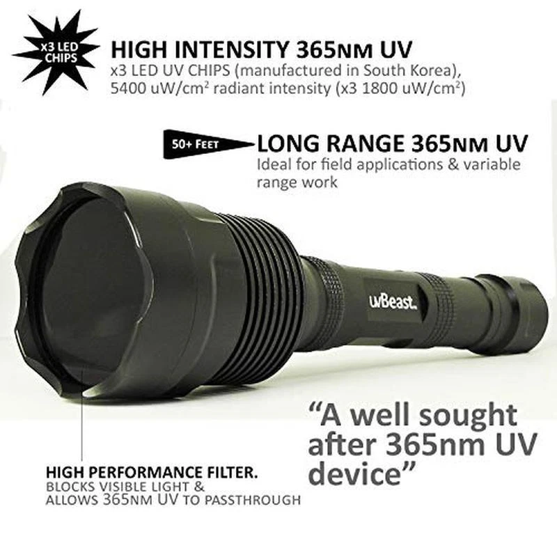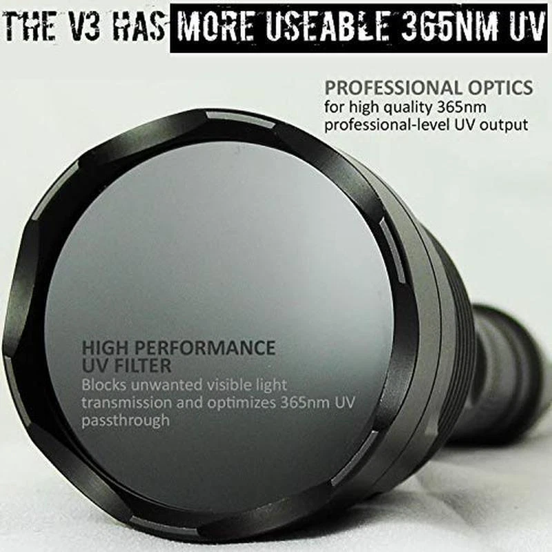 You may also like Durable Epoxy Acrylic Floor Paint Concrete Garage Basement High Traffic Surface 41.07 USD 43.23 USD Free shipping 5% off Extra Large Capacity Galvanized Steel Post Mount Mailbox W/ Outgoing Flag New 55.15 USD 58.05 USD Free shipping 5% off Stainless Steel Percolator Coffee Pot 9 Cup Camping Brew Outdoor Kitchen Classic 43.87 USD 46.18 USD Free shipping 5% off Multi Use Copy Paper 11x17 In Ledger 20 Lb 2500 Sheet Jam Free Performance White 53.08 USD 55.87 USD Free shipping 5% off Hot Cold Water Dispenser 5 Gallon Cooler Child Safety Lock Storage Cabinet New 94.04 USD 98.99 USD Free shipping 5% off Stackable Bariatric Medical Chair Antimicrobial Vinyl 1000 Lb Capacity Reception 121.53 USD 127.93 USD Free shipping 5% off 10x20 Ft Outdoor Waterproof Canopy Tent Removable Sidewalls Heavy Duty Event New 91.18 USD 95.98 USD Free shipping 5% off Washable Area Rug 8x10 Ft Non-Slip Soft Velvet Contemporary Design Indoor Carpet 117.32 USD 123.49 USD Free shipping 5% off 6x6 Ft Durable Outdoor Carport Shelter W/ Roll-up Windows Bike & Lawn Equipment 132.99 USD 139.99 USD Free shipping 5% off Weatherproof Outdoor Cat House Insulated Rabbit Hutch Small Pets Shelter Wood 56.99 USD 59.99 USD Free shipping 5% off Ceramic Nonstick 12 In Frying Pan Skillet W/ Lid Oven Safe PFAS Free Cookware 34.51 USD 36.33 USD Free shipping 5% off LED Computer Desk W/ Power Outlets 4 Drawers Monitor Stand Keyboard Tray New 94.99 USD 99.99 USD Free shipping 5% off About this item No Standalone lithium batteries are sold with the product. Batteries are pre-installed in the equipment and the insulation tab needs to be removed WHY uvBeast V3 365nm? Our users wanted more intense 365nm UV and more range for better results. Our new design intentionally aims to fill those gaps. (1) The popular and in-demand V3 spec now emits even higher quality UV at 365nm wavelength. (2) More bang for your buck with filtered UV. This isn’t cheaper unfiltered UV. (3) Unbeatable long range (60 feet+) and a high intensity 365nm beam unlike others. PROFESSIONAL GRADE FILTERED 365nm. This is High Flux Density 365nm wavelength that professionals use. We know. We supply them. This is NOT to be confused with longer wave 395nm devices. Nor is it to be confused with unfiltered 365nm UV. Most excitation occurs at 365nm which means you’re getting superior results to most users. 395nm cannot compete with 365nm devices. The on-board UV filter blocks unwanted visible light but allows max transmission of pure 365nm UV. This is UV at its purest OUR HIGHEST INTENSITY 365nm DEVICE. Higher UV Flux Density than most 365nm devices currently on the market. 365nm is the gold standard for UV flashlights. There's limited market choice in high flux density 365nm UV. So we made one with superior UV. The V3 365nm has TRIPLE LEDs (manufactured in S Korea) at 1000 mA each emitting 1800 uW/cm2 of UV radiant intensity. That’s a whopping total of 5400 uW/cm2 of UV intensity at 365nm UNLIKE OTHERS THIS IS LONG RANGE 365nm UV. A high intensity 365nm device which can emit a beam out to 60 feet plus is hard to find. We know, because our users have told us. We’ve filled this gap with the V3 365nm to change the game for those who want results at long range with UV 365nm purity › product details Special Feature Portable Color Metallic Black Power Source Battery Powered Light Source Type LED Material Aluminum You may also like 12 Pieces Dinnerware Set Stoneware Scratch Resistant Microwave Dishwasher Safe 80.89 USD 85.15 USD Free shipping 5% off 3 Drawer Mobile File Cabinet Rolling Storage Home Office Printer Stand Black New 99.71 USD 104.96 USD Free shipping 5% off 12 Outlet Power Strip 15 Ft Cord Mountable Heavy Duty W/ Circuit Breaker 120 V 76.78 USD 80.82 USD Free shipping 5% off Galvanized Metal Drawer Storage Unit W/ 3 Corrugated Drawers 2 Shelves Home New 152.3 USD 160.32 USD Free shipping 5% off 32 Qt Stainless Turkey Fryer Vented Lid Poultry Rack Thermometer Injector Kit 103.79 USD 109.25 USD Free shipping 5% off Multifunction Ergonomic Task Chair Mesh Back Adjustable Height Reclining Black 147.1 USD 154.84 USD Free shipping 5% off Twin Metal Trundle Bed Frame Daybed Guest Sleep Solution 500 Lbs Support New 81.31 USD 85.59 USD Free shipping 5% off 3 Bag Laundry Sorter Rolling Cart W/ Extensible Hanging Rod Steel Frame ‎Sturdy 60.86 USD 64.06 USD Free shipping 5% off Grain Free High Protein Dry Dog Food Small Breed Venison Lamb Fish 28 Lb Adult 73.89 USD 77.78 USD Free shipping 5% off Superfast Toolless Assembly Storage Cabinet W/ RGB Lighting Adjustable Shelves 183.56 USD Free shipping Extra Large Galvanized Steel Post Mount Mailbox Heavy Duty Locking Outdoor Use 72.4 USD 76.21 USD Free shipping 5% off Cordless LED Table Lamp Set 2 Dimmable Rechargeable Touch Control Home Lighting 85.49 USD 89.99 USD Free shipping 5% off