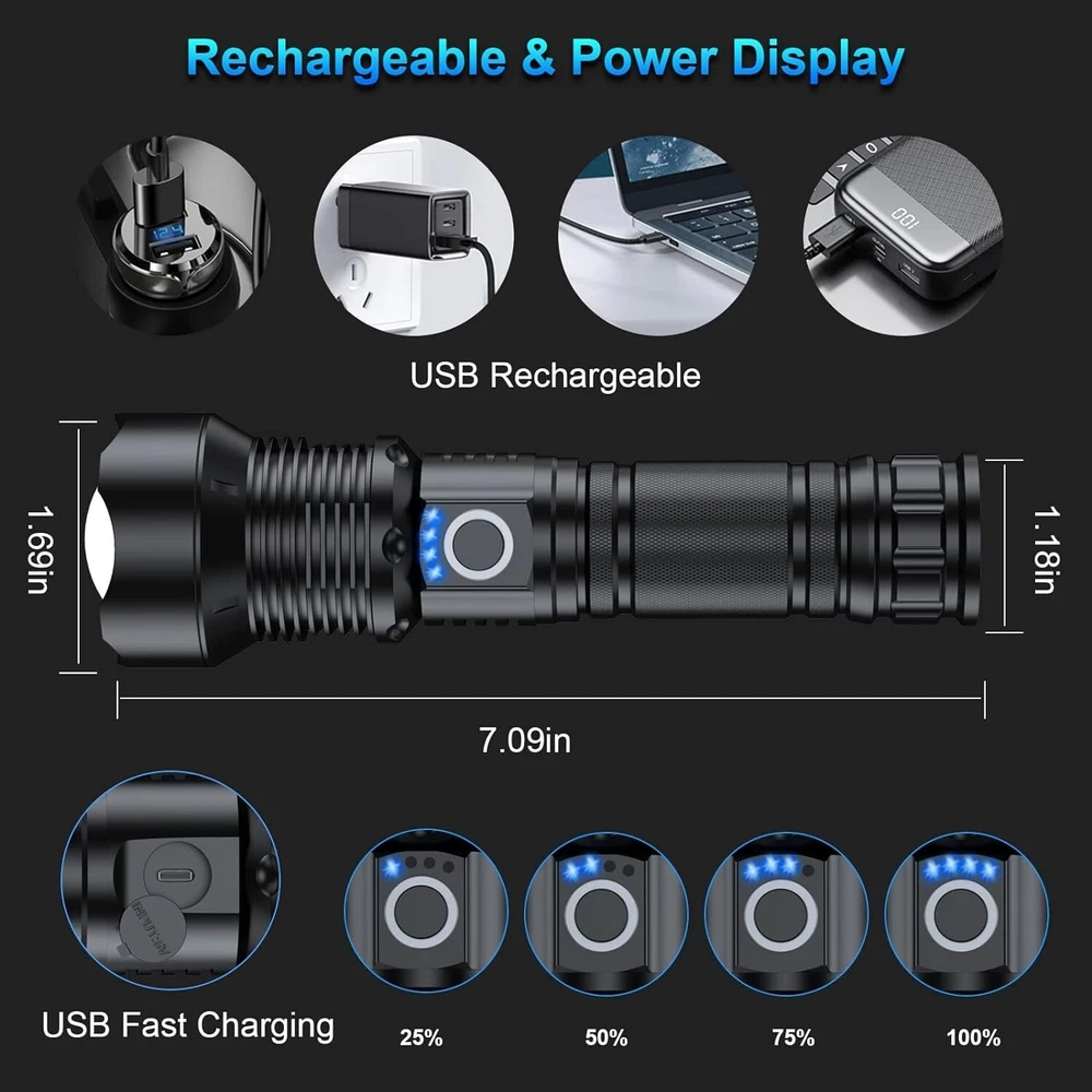 Number of Lights: 1-3 Battery Technology: Li-Ion IP Rating: IPX7 Specification Met: Ce Features: Rechargeable, High Power, Adjustable Light Modes, Non Slip Grip, Adjustable Focus, 5 Light Modes, Power Display, Free Installation, IPX7 Waterproof, Drop-resistant Design Power Source: Battery Lumens: 990000 Battery Cell Composition: Nimh Personalize: No gtin13: Does Not Apply White Brightness: 100000 Lumens Item Length: Rechargeable Flashlights Item Package Quantity: 2 Operating Range: 3280 feet UPC: Does Not Apply Runtime: 12 Hours Brightness: 990000 Lumen Product Dimensions: 1.69"d X 1.69"w X 7.09"h Water Resistance Level: Waterproof Item Height: Rechargeable Flashlights Material: Aluminum Recommended Uses For Product: Illumination Light Source Wattage: 900 Watts Battery Description: Lithium-ion Batteries: 2 Unknown Batteries Required. (included) Number of Batteries: 2 Item Weight: 1.1 pounds Style: Modern Brand: Unbranded Operating Time: 12 hours Lighting Technology: LED Voltage: 5 volts Type: Flashlight Finish Type: Aluminium Finish Types: Aluminium Included Components: Usb Cable Color: Black Light Source Type: Led Light Path Distance: 3280 Feet Number of LEDs: 1