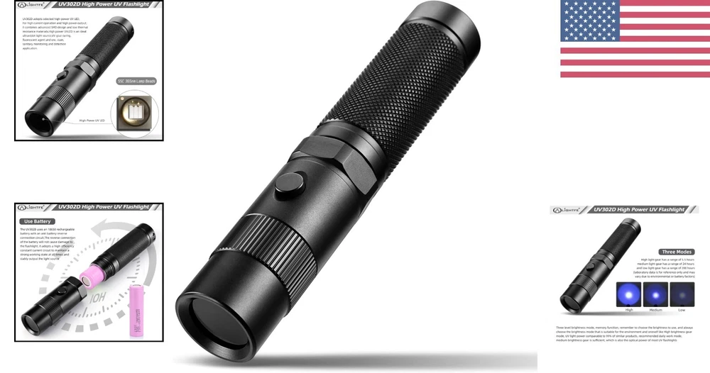 Number of Lights: 1-3 Personalize: No Operating Time: 6-8 Hours Light Source Type: Black Light Uv Led Style: Compact Voltage: 3.7 volts Battery Cell Composition: Alkaline Specification Met: Partially Met Special Features: High Power Battery Description: 1 Aa Alkaline, 1 Lithium-ion Item Length: UV Flashlight Features: Handheld, Waterproof, Rechargeable, Batteries Included Batteries: 1 Aa Batteries Required. (included) Type: Flashlight Lumens: 3000 lumen Battery Technology: AA Item Weight: 0.18 kilograms Water Resistance Level: Waterproof Power Source: Battery IP Rating: IPX-8 Special Feature: High Power Assembled Width: 0.87 Inches Assembled Height: 0.87 Inches Lighting Technology: UV-Light Material: Aluminum Operating Range: 6.5 ft gtin13: Does Not Apply Number of LEDs: 1 UPC: Does Not Apply Recommended Uses For Product: Professional And Specialized Applications Brightness: 3000 Lumen Product Dimensions: 4.05 X 0.87 X 0.87 Inches Mounting Type: Handheld Item Height: UV Flashlight Number of Batteries: 1 Aa Batteries Required. (included) Color: Black Assembled Length: 4.05 Inches Brand: Unbranded Batteries Included?: Yes Runtime: 6 Hours Item Package Quantity: 1