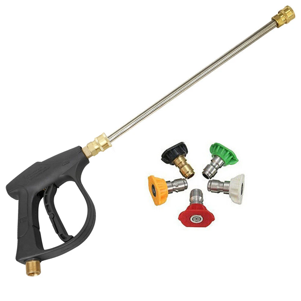 Product Description High Pressure Spray Gun Description: PLEASE NOTE: Fit for M22-14mm thread connector pressure washer hose. Not fit garden hose, regular hose or faucet. Perfect Pressure Washer Gun Kit: MAX 4000 PSI power washer gun with a 1/4 inch outlet quick-connector and M22-14 thread inlet fitting (inside diameter 14mm). Premium Material: The pressure washer gun shell body is made of high-quality engineering plastics, which is more wear-resistant. The valve core is made of aluminium, which has good resistance to high pressure and impact. The pipe is stainless steel material. Last longer, more Long-lasting and leak-proof. Professional Cleaning: 5 pressure washer spray nozzles tips creating 5 patterns for a variety of uses. 0 degree (red), 15 degree (yellow), 25 degree (green), 40 degree (white) and 65 degree (black Soap Nozzle). Great Compatibility: The pressure washer gun fits a M22-14 thread inlet fitting with 14 mm inside diameter. Please confirm the hose interface size before purchasing to avoid leakage. Safe Design: The handle of the short wand high pressure gun adopts a trigger lock design to prevent accidental spraying, make you safer when cleaning the car or the roof. Widely Applicable: Suitable for cleaning cars, pool, windows, roofs, sidewalks, auto detailing business, garden tractor, etc. Easily support your efficient cleaning. Specification: Material: Aluminium+ ABS Color: Black Gun Type: Ergonomic Max. Pressure: 4000PSI Normal Working Pressure: 2175PSI Max. Temperature: 60℃ / 140℉ (Cold water use only) Gun to Hose Connection: M22 - 14 Lance to Nozzle Connection: 1/4" Quick Coupling Size: 17.5 x 17.5cm / 6.9 x 6.9in 26ft Hose Color: Black Material: Rubber Length: Approx.26ft Hose Size: Inter Diameter: 6mm/Outer Diameter: 10mm Working Pressure: Max. 3200PSI Fit in with Connector: Inter Diameter: 14mm / Outer Diameter: M22mm Connecting Thread: NPT Thread Working Temperature: MAX 60℃/140℉ 5 Nozzle Nozzle Details: 0° Red Nozzle Tip: Clean high areas or are as hard to reach such as crevices in sidewalks 15° Yellow Nozzle Tip: Clean brick,concrete and other hard surfaces with stubborn stains. 25° Green Nozzle Tip: Clean wood,fences,painted surfaces,siding and lawn mowers. 40° White Nozzle Tip: Clean screens and windows. 65° Black Soap Nozzle Tip: Spray on detergents. Extension Wand Lance Description: Excellent Pressure: Pressure washer wand extension’s max pressure is up to 4000 psi, fits most pressure washer. During the using time, power washer wand extension can provide great cleaning function. Easy to Install: General M22 14mm Male to 1/4 quick plug (TYPE 1); 1/4'' quick Connector and 1/4'' quick plug (TYPE 2), fit for most pressure washer attachments in the market, including surface cleaner, undercarriage cleaner, foam cannon, pressure washer gun, hose, nozzle tips and adapter. Specification: Material: Stainless Steel + Brass Length: 16” Connector: M22-14 X 1/4” Quick Connector, 1/4 ” Quick Connector X 1/4 ” Quick Plug Max Working Pressure: 4000 PSI Package Included: Option 1 : 1 x High Pressure Spray Washer Gun + 1 x Extension Wand Lance + 5 x Spray Nozzles + 26ft Hose Option 2 : 1 x High Pressure Spray Washer Gun + 1 x Extension Wand Lance + 5 x Spray Nozzles Option 3 : 1 x 26FT Hose Only Option 4 : High-Pressure Cleaning Sprayer Set Option 5 : Adjustable High-Pressure Cleaning Sprayer Set On Jan 24, 2025 at 10:22:06 PST, seller added the following information: