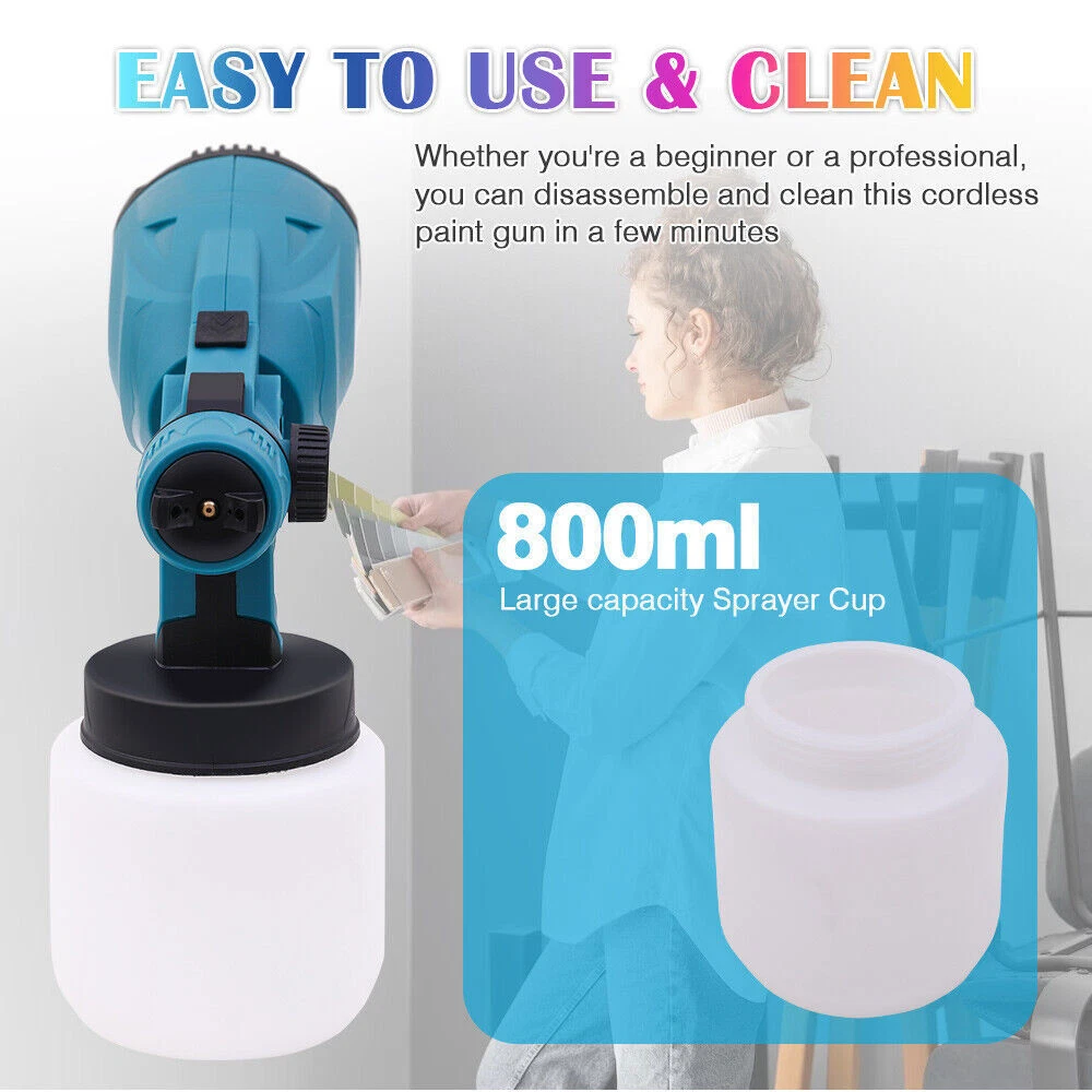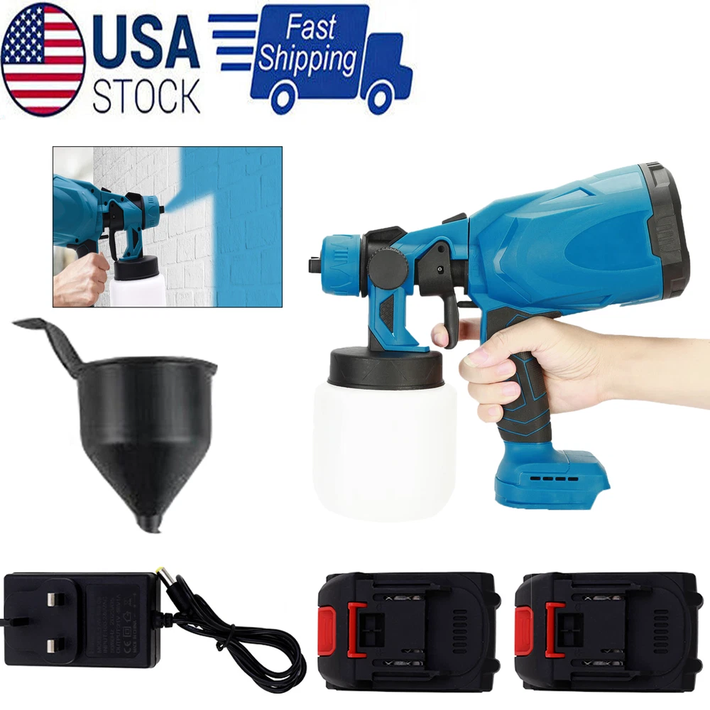 Descriptions: 【Battery Powered Cordless Paint Sprayer】 Without cords and outlets design, you can enjoy the convenience of outdoor operation with the cordless paint sprayer, works on all job sites, which will be a faster tool than a roller or brush. Kindly notes: Batteries are NOT included. 【Powerful Motor 】 150 Watts paint sprayerprovides a precise spray pattern, creating the smooth and superior finish. With 800ml high-capacity container, it will be your best electric paint sprayer for fence, deck, ceiling, tables, chairs and house interior exterior walls 【3 Patterns 】 Comes with 3 different spray patterns, you can easily achieved vertical, horizontal, and circular spraying patterns by adjusting the air cap ears. Versatile options help you complete your painting project efficiently a High Pressure Cordless Paint Sprayer With 2 Batteries Electric HVLP Spray Gun US D escriptions: 【 Battery Powered Cordless Paint Sprayer】 Without cords and outlets design, you can enjoy the convenience of outdoor operation with the cordless paint sprayer, works on all job sites, which will be a faster tool than a roller or brush. Kindly notes: Batteries are NOT included. 【 Powerful Motor 】 150 Watts paint sprayerprovides a precise spray pattern, creating the smooth and superior finish. With 800ml high-capacity container, it will be your best electric paint sprayer for fence, deck, ceiling, tables, chairs and house interior exterior walls 【 3 Patterns 】 Comes with 3 different spray patterns, you can easily achieved vertical, horizontal, and circular spraying patterns by adjusting the air cap ears. Versatile options help you complete your painting project efficiently and easily. 【 Portable & Wide Application】 The cordless paint sprayer gun is lightweight and portable, you can take it anywhere. Thus, the portable paint sprayer allows you to spray a various projects such as coating doors, windows, walls, fences, decking, ceilings, floors, cabinets, home furniture and other objects. 【 Easy to Use & Clean】 With the lightweight body, you can easy to take apart, reassemble and get back at it. When you have completed your painting job, you will need to remove the motor parts and battery, then soak other parts in water to clean. 【 Perfect for all painting projects】 As they strain out particles down to 190 microns. and work for all types of solvent or water-based paints, stains, varnishes, epoxy, latex and other liquids. So before use this paint sprayer, please make sure to dilute the paint according Specification: Motor: 150W Maximum flow: 200ml/min Maximum viscosity: 8-12s Capacity: 800ML Speed: 30000RPM Power Supply: Battery Battery Quantity:2PCS Plug: US Package List: 1 * Paint Sprayer 1 * Sprayer Cup 2 * Battery 1 * Charger 1 * User Manual Note: The machine Adapted for 18V Makita battery compatible for 18V B series lithium battery,such as BL1850B(197285-8),BL1840B(197270-1),BL1830B(197602-2),BL1430B(197618-7),BL1820B(197487-6); compatible for BL1850,BL1840,BL1440(196391-6),BL1415(194560-3),BL1815N(196781-3); NOT compatible for G Series battery such as BL1813G(196663-9) BL1413G(196882-7) BL1415G BL1430G BL1815G and so on NOT compatible for 18v Ni-CD battery such as 1822(194465-7) Payment Shipping Return Contact us About us Payment 1.Paypal, Credit Card, G Pay etc, many payment way is accepted. 2.Please be sure your shipping address is correct before make a payment. Shipping 1.We are shipping from multiple warehouses (Houston, Texas/ Corona, California) , please note before placing an order 2.We will ship out the item within 1-3 business days after comfirming the payment, appreciate your patience. 3.If the items are broken on the way( we will check the orders clearly before we sent them ),please contact us in 3 days you received it. We will send you a new one or refund your payment. Return 1.We stand behind every buyer.Items can be returned for exchange or refund within 30 days. 2.Please contact us when you have any confusion of our item, we will solve the trouble for you as soon as possible. Contact us 1.This is professional Seller.We will reply your message within 24 hours. 2.Please contact us whenever you have any question about the item. We will deal with it as soon as possible. 3. If you are unhappy with the item or our service,please Contact Us before leave feedback,just give me a chance,thank you! About us 1. Unless specified otherwise, all our products are IN STOCK and are shipped from Local warehouse - Not Overseas! 2. We provide a 30 day Satisfaction Guarantee or your money back (provided items are in the same new and resaleable condition.) 3. We have a PayPal Verified Business Account, please buy with Confidence! 4. Every item will be tesrted before send.We know our products well and if we don't have the answers we will do our best to find them for you! 5. Our friendly team look forward to serving you! Your satisfaction is our No.1 Priority We will do our best to satisfacy you.