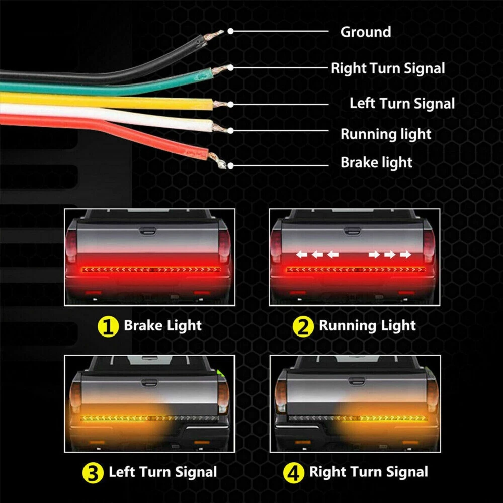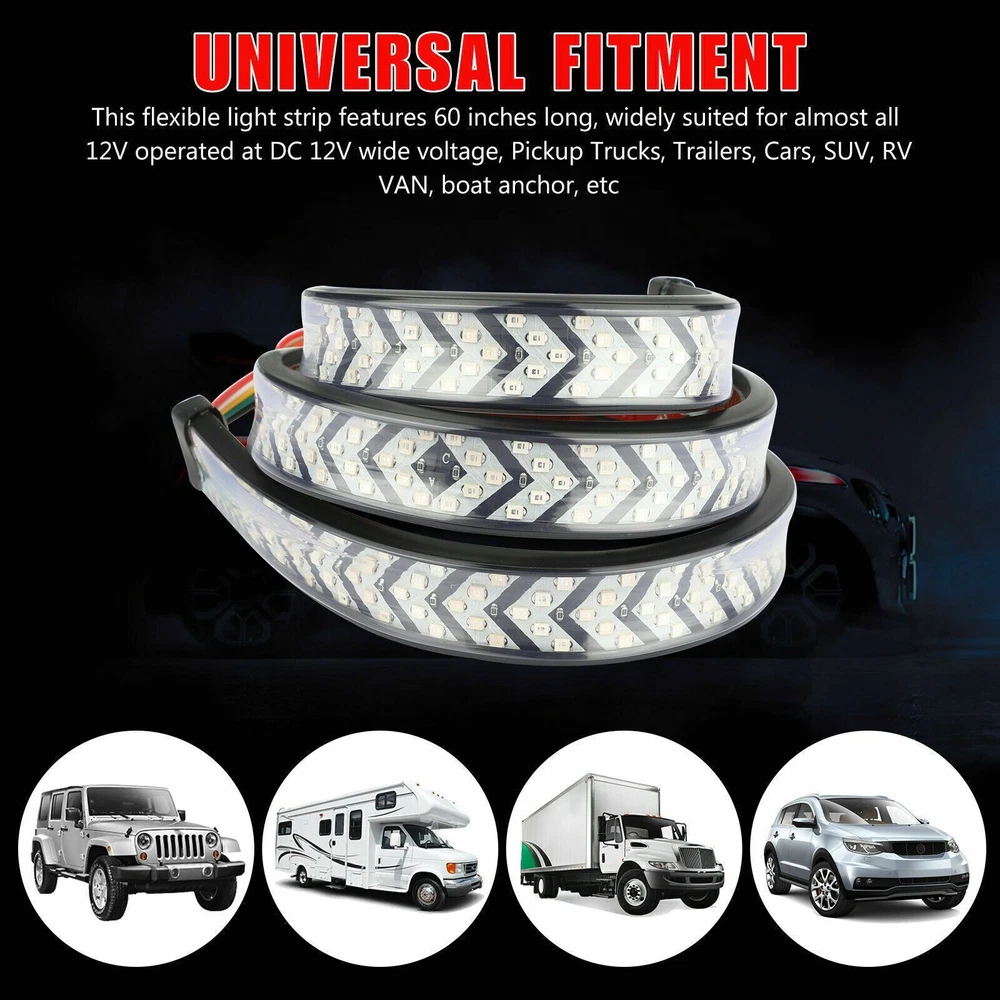 Product Description Features: Full Functions: The arrow-style tailgate light features full functions of the brake. Universal Fitment for: Tailgate light with a working voltage of 12V DC, fits most vehicles. Specifications: Housing material: Fully Sealed Silicone Housing Shell material: PVC Voltage: DC 12V Light Source Power: 5W Current: 0.5A Luminous Flux: 500LM LED Quantity: 540 LEDs (270 Red+270 Yellow) LED Type: 2835 Light Color: Red/Yellow Red Light For: Driving Light, Brake Light (Will Not override Turn signal) Yellow Light For: Turn Signal Light (Will override brake light) Brake Light: Quick flash 3 times and stay on. (Red color) Waterproof Rate: IP68 Light Length: 60inch / approx. 150cm Package Included: 1 x 60"inch Truck Tailgate LED Light Strip About Us Payment Shipping Returns Contact Us Welcome to our store! Our aim is to offer our clients items with high quality and fast delivery, also our price will be reasonable. We supply many products including video game, health & beauty, phone accessories, computers accessories, camera & camcorder,car accessories, games, toys & hobbies, jewelry, antique & craftwork. Excellent customer service and a reliable credit standing is our tenet. We accept all verified payments from ebay. Orders will be shipped after receiving cleared payment. We ship most of our orders within 24 hours, and may up to 48 hours. If you want faster shipping way. Please contact us before making payment. Sometimes due to problems with our transportation company system, your shipping information may be delayed to update. We recommend that you try again after 3-4 days. If you still haven't checked the shipping information, you can contact us by ebay message. Always believe we can figure things out with communication, if it comes to return, the pacakge must be intact and the same as you receive. If you have any questions, please feel free to email our service specialists 24 Hours a Day, 7 Days a Week. We will reply you ASAP. Return/refund is accepted within 30 days after the buyer receives the item. NO exchange will be accepted after 30 days from the date when the item is received. Please contact us first before returning your product!!! If you have any questions, our Customer Service staffs welcome you to email us. We strive to answer all questions and resolve any problems as quickly as possible. We care about our valued customers, and will always try to help you. So if you have any problems, You can contact us 7*24, we will reply at the first time. About Us Welcome to our store! Our aim is to offer our clients items with high quality and fast delivery, also our price will be reasonable. We supply many products including video game, health & beauty, phone accessories, computers accessories, camera & camcorder,car accessories, games, toys & hobbies, jewelry, antique & craftwork. Excellent customer service and a reliable credit standing is our tenet. Payment We accept all verified payments from ebay. Orders will be shipped after receiving cleared payment. Shipping We ship most of our orders within 24 hours, and may up to 48 hours. If you want faster shipping way. Please contact us before making payment. Sometimes due to problems with our transportation company system, your shipping information may be delayed to update. We recommend that you try again after 3-4 days. If you still haven't checked the shipping information, you can contact us by ebay message. Returns Always believe we can figure things out with communication, if it comes to return, the pacakge must be intact and the same as you receive. If you have any questions, please feel free to email our service specialists 24 Hours a Day, 7 Days a Week. We will reply you ASAP. Return/refund is accepted within 30 days after the buyer receives the item. NO exchange will be accepted after 30 days from the date when the item is received. Please contact us first before returning your product!!! Contact Us If you have any questions, our Customer Service staffs welcome you to email us. We strive to answer all questions and resolve any problems as quickly as possible. We care about our valued customers, and will always try to help you. So if you have any problems, You can contact us 7*24, we will reply at the first time. powered by
