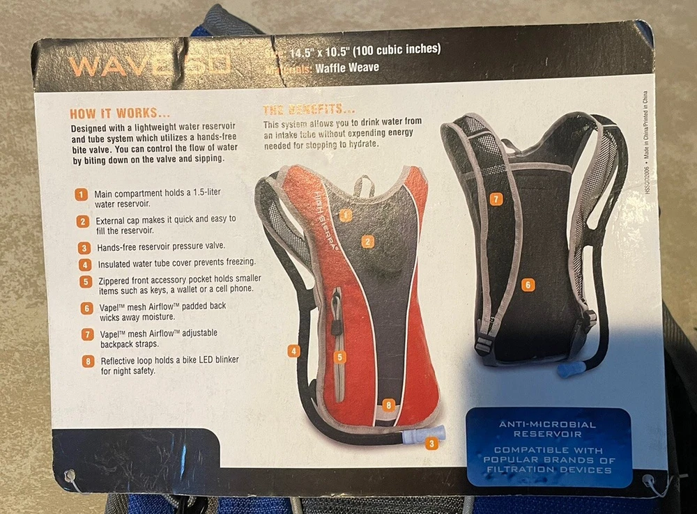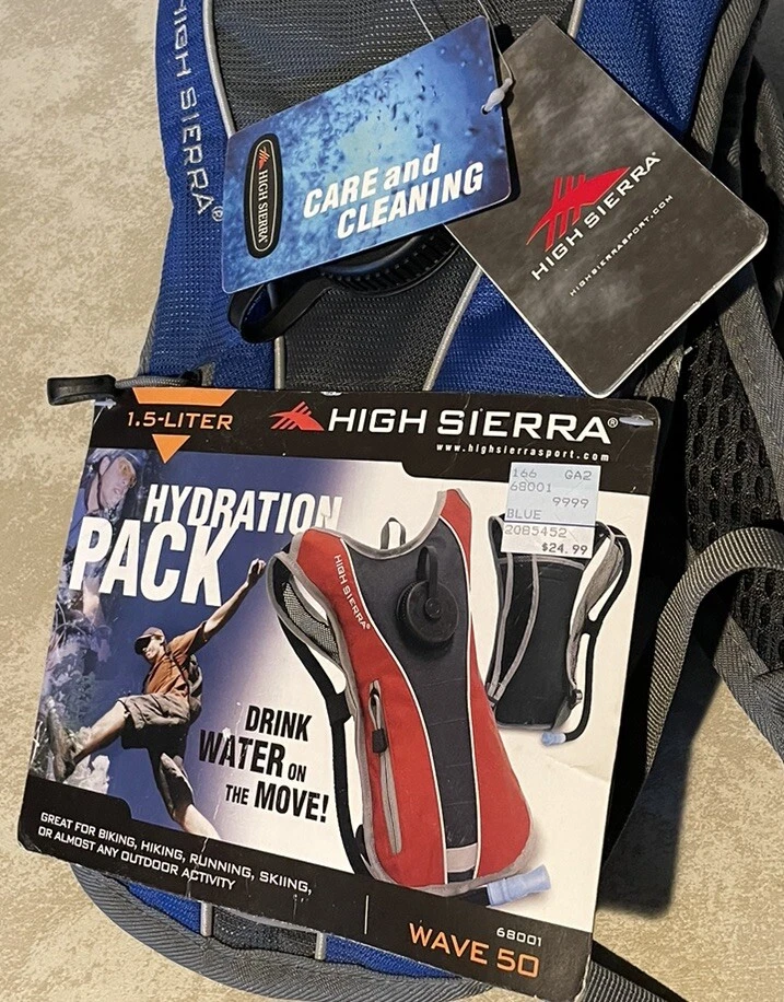 High Sierra 1.5 Liter Hydration Pack Wave 50 Blue and Gray Hiking Outdoors. Condition is New with tags. Shipped with USPS Ground Advantage.