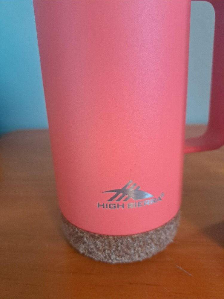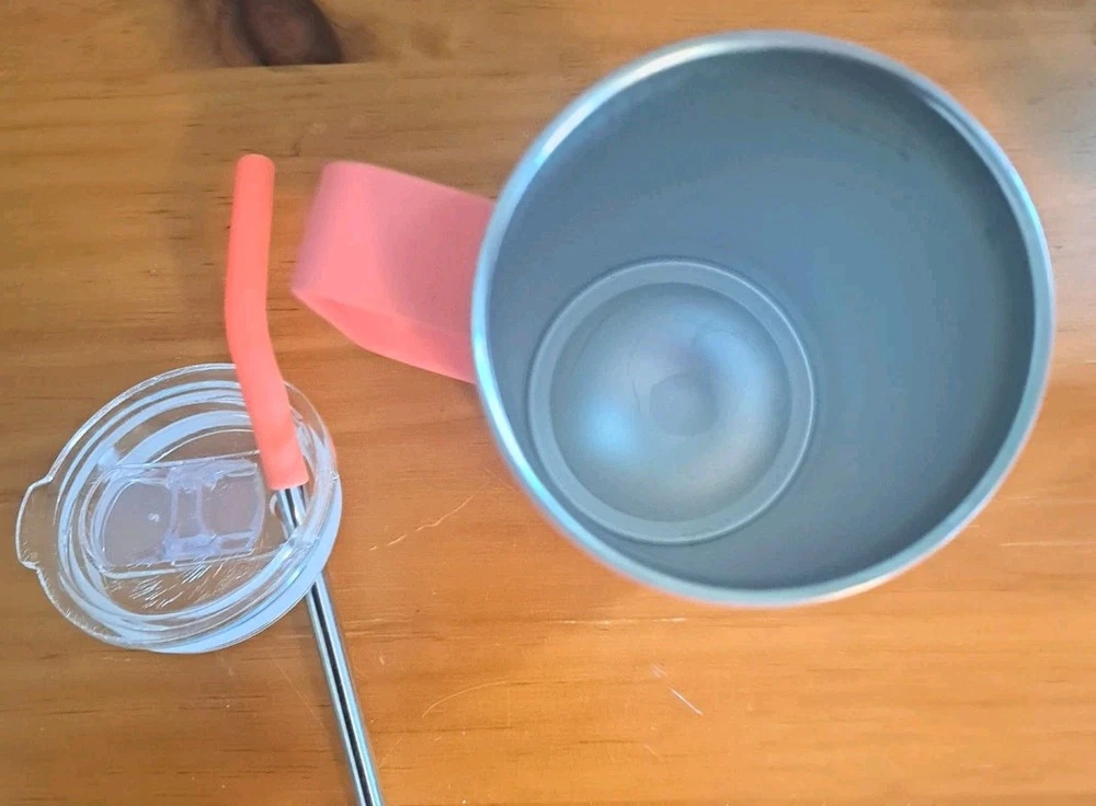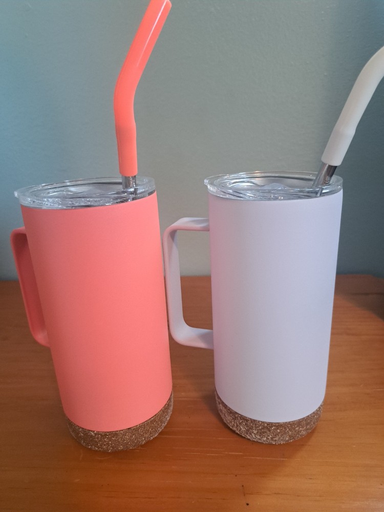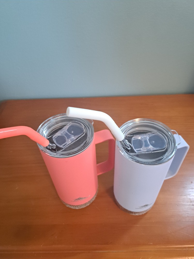 High Sierra Stainless Mugs 2 BPA Free 7 x 3 inch Peach and white colors, clear lid, 9 inch stainless straws. Slight peeling rubber bottoms, clears lid look like may have been put in dishwasher.