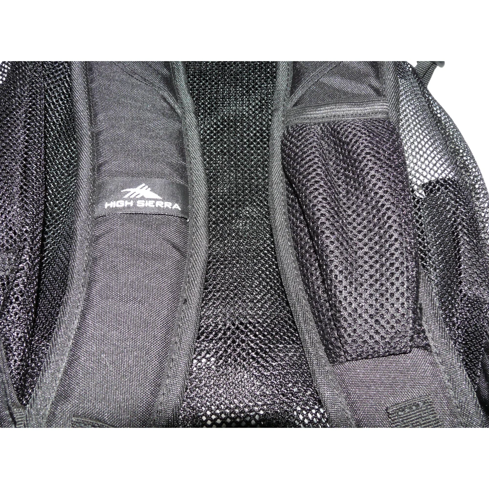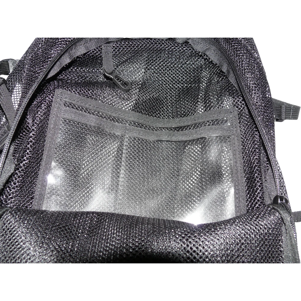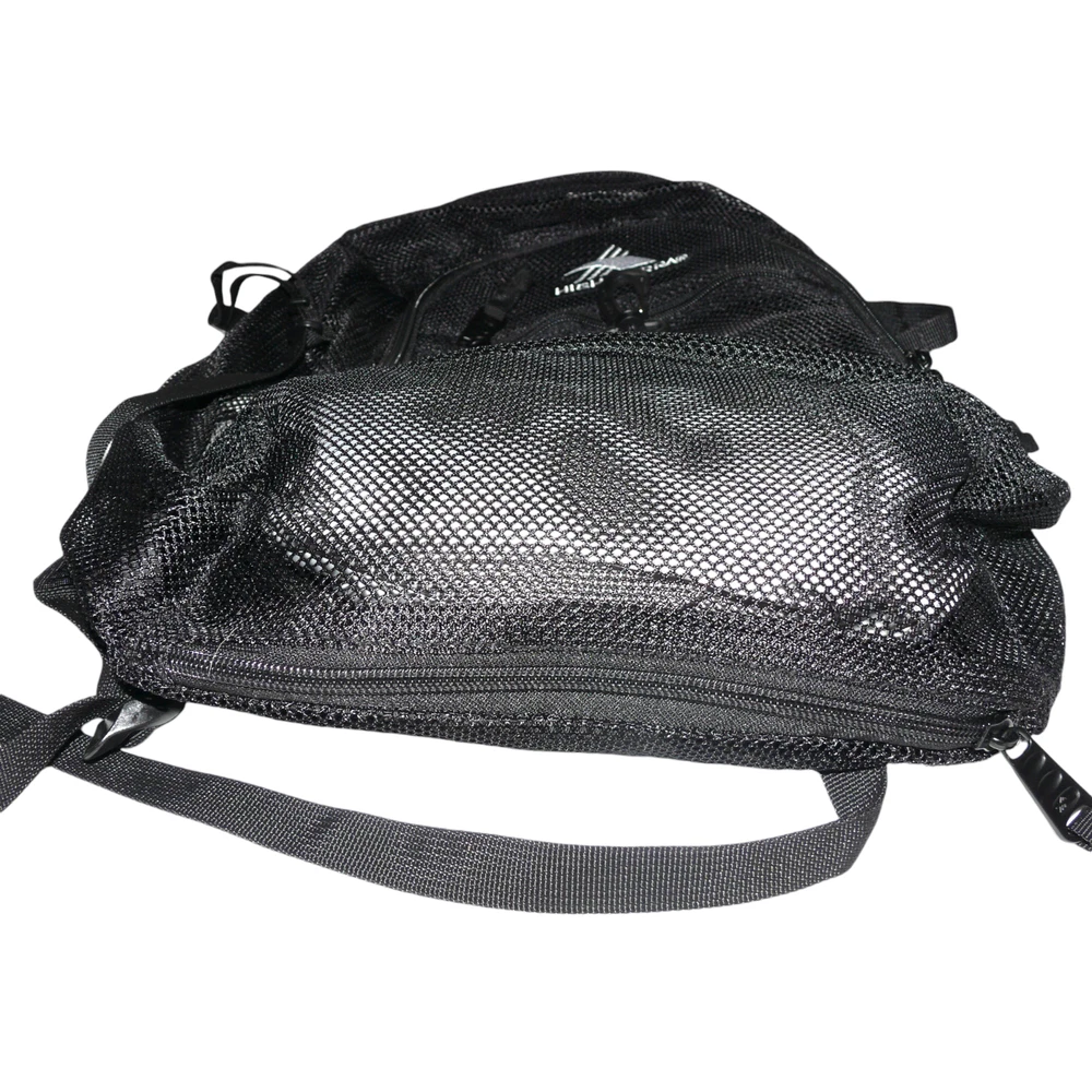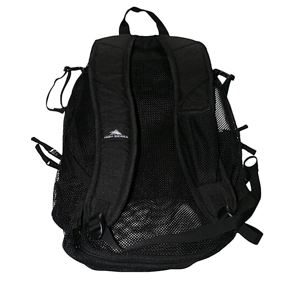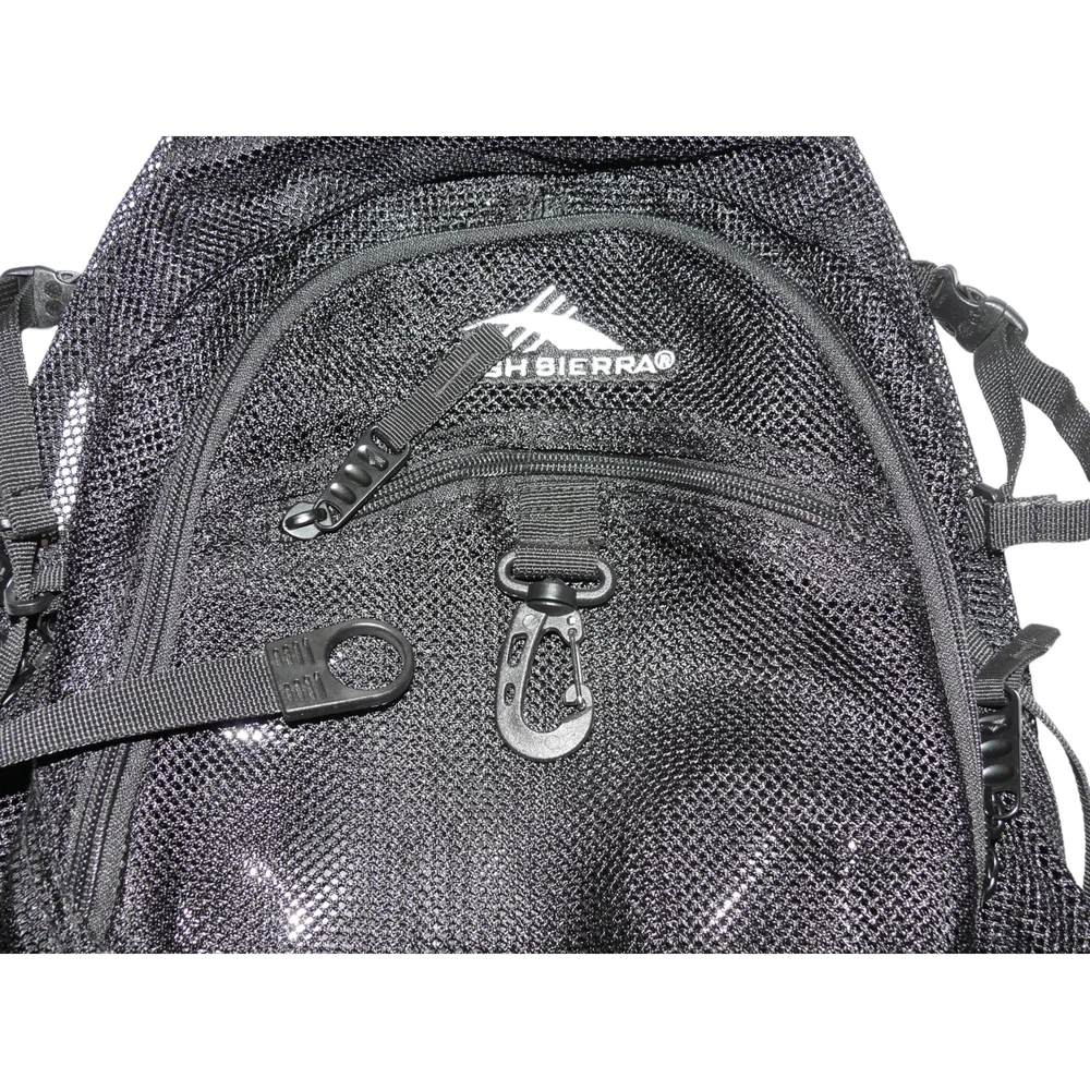 High Sierra mesh backpack. Three zippered pockets and one pocket on the strap. Two clear pocks in second pocket for cell phone and misc items. Rain cover is stored in pocket on the bottom of the backpack. Padded straps with a security clip to keep the pack in place. Secure clip on the front of the backpack for keys or other items. Measurements are approximate: 17" x 12" x 6".