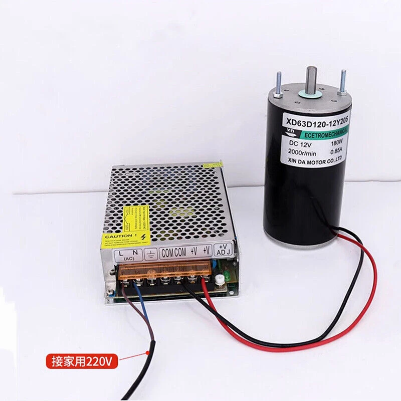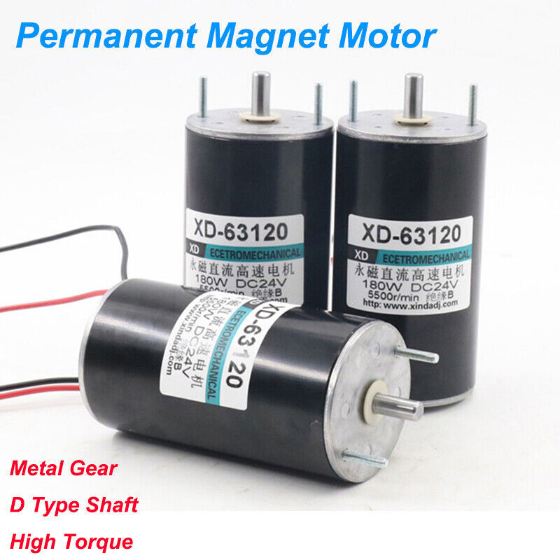 180W High Speed Motor DC 12V 24V Permanent Magnet Reversible Motors 2000/4000RPM ●Product Properties : Motor Model : 63120 Power Supply : DC 12V 24V Speed : 2000RPM , 4000RPM Shaft Diameter : 8mm Shaft Length : 18mm Motor size : 116 x 63mm Motor Power : 180W Current : 0.5A , 0.6A ●Product Features : Pure copper motor, high temperature resistance, high conductivity, strong power and long life. Double ball bearings with hard mechanical characteristics, stability, good control, convenient no-rotation loss and high efficiency. High strength magnet, magnetic stability, high magnetic energy, high performance, high temperature resistance and other characteristics. ●Use : Cutting machine, bag cutter, lawn mower, electric drill, wire winder, cotton candy machine.