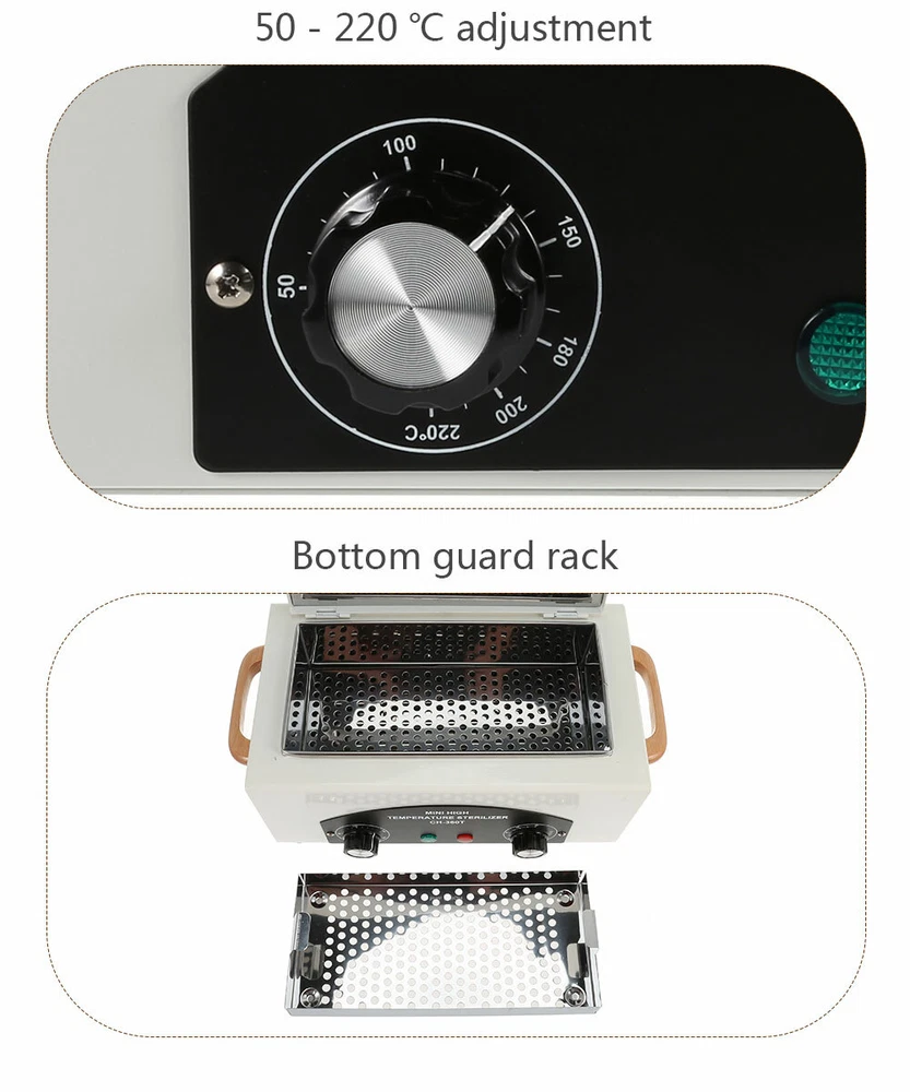 moban2 Description High Temperature Sterilizer Box with Hot Air Disinfection for Nail Art Tools US Features Description: This high temperature manicure sterilizer is designed to disinfect the nail tools and procedures, as well as for cleaning.The inner thermal reservoir block is made of stainless steel and it has a removable container for storage and sterilization instruments. And dry heat sterilizer kill bacteria without moisture and will not dull sharp instrument. Such wonderful goods, just bring it home! Features: 1. This hot air sterilizer is designed to disinfect the nail tools and procedures, as well as for cleaning. 2. The inner thermal reservoir block is made of stainless steel and it has a removable container for storage and sterilization instruments. 3. Temperature regulator + light indicator make it possible to adjust the appropriate temperature for sterilization. 4. Dry heat sterilizer kill bacteria without moisture and will not dull sharp instrument. 5. Sterilization by dry heat works without pressure, steam, or chemicals, which increases safety, and it dose not require routine cleaning. 6. Utility tray can be sterilized with lids on and stored without contamination. 7. Sterilizers also have automatic timers with heat "hold" capacity for continuous use in a very active practice. Specification: Condition: 100% Brand New Item Type: Hot Air Sterilizer Material: Iron + Stainless Steel Color: White Timer: 60min Adjustable Temperature: 50~200 ℃ Adjustable Voltage: AC110V Power: 300W Frequency: 50~60HZ Size: Approx. 31 * 18 * 15cm / 12.2 * 7.1 * 5.9inch Package Weight: Approx. 3460g Package Included: 1 x Hot Air Sterilizer 2 x Trays 2 x Pick-Up Rings 1 x Power Line 1 x English Manual Statement (FDA) The sale of this item may be subject to regulation by the U.S. Food and Drug Administration and state and local regulatory agencies. If so, you can bid it on this item only if you are an authorized purchaser. If the item is subject to FDA regulation, I will verify your status as an authorized purchaser of this item before shipping of the item. Payment a) Paypal accepted. b) Please accomplish payment within 7 days after purchase. If you do have any reason cannot make payment timely, kindly please email me. Otherwise, all unpaid items will be filed an unpaid item dispute through eBay. c) Import duties, taxes and charges are not included in the item price or shipping costs. These charges are the buyer's responsibility. Please check with your country's customs office prior to bidding/buying to determine what these additional costs will be. Delivery Details Note: We can offer the tracking number for u to check the status of your item in 2 days after we deliver it. For international shipping, customs duties might be possible for some countries, they are buyers'responsibility, Hope his could be understood. S&H charged dose not include any those fees. We are not responsibility for the delay of clearance in the buyer's country, but we will help you clear as suppling some files. If the item is in customs or post office for some days, pls contact with local customs actively, otherwise, if the item returns to us, the buyer will pay for the shipping fee for resend or refund except the shipping fee. Few states need to pay remote surcharge. Don't worry, I will tell you before you pay if it's need. You can email us in 1-2 days to change ur shipping address, or we are not responsible for it after we deliver ur products. Return Policy Your SATISFACTION is our ultimate goal. We work hard to earn your trust and future business. a) Please check the package first before you sign for the package. If the package has any damage, please file a claim on your local shipping company. b) If you have a defective item, you can return it or ask for a discount. Please contact us within 2 days after you receive the package. c) What you returned must be unused and in the original packaging as received. Customer is responsible for shipping charges on returned items. d) We will refund the money to you when we get the return items. Or replace item for you. Terms of Sales Please leave us your phone number for smooth and fast delivery. Our prices does not include any taxes, VAT and other hidden charges. Buyers should be responsible for your customs duties if there is any. If you need some profiles, please contact us. We will attach it via Email. About us We are factory founded dental equipment Wholesaler and Retailer. We offer 1 full year warranty for most of our items(please contact us for more info). Each item will be quality checked before shipping to our customers. Contact us If you have any questions about our service or products. You can send us eBay message or Email. You will be replied within 24 hours(48 hours in the weekend).