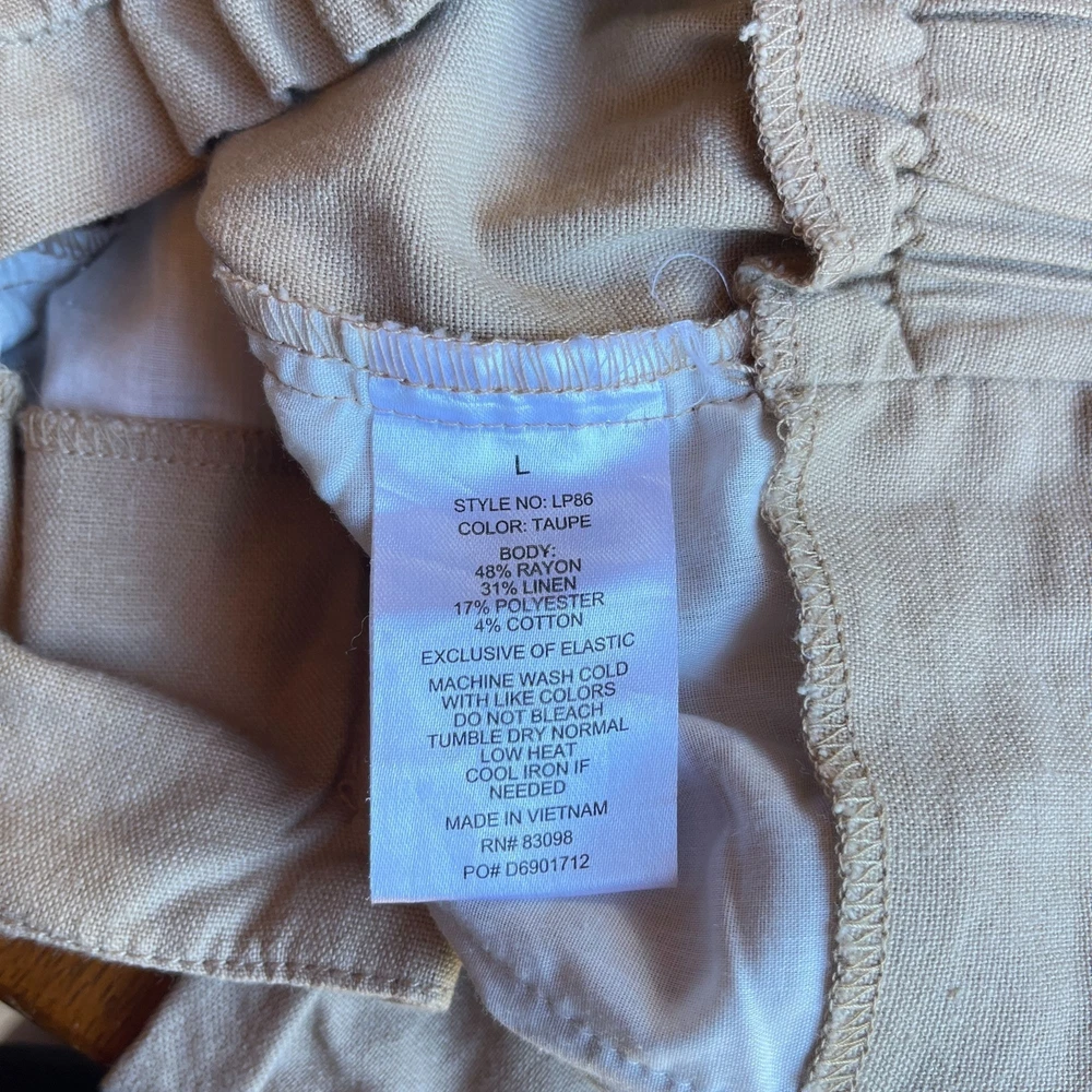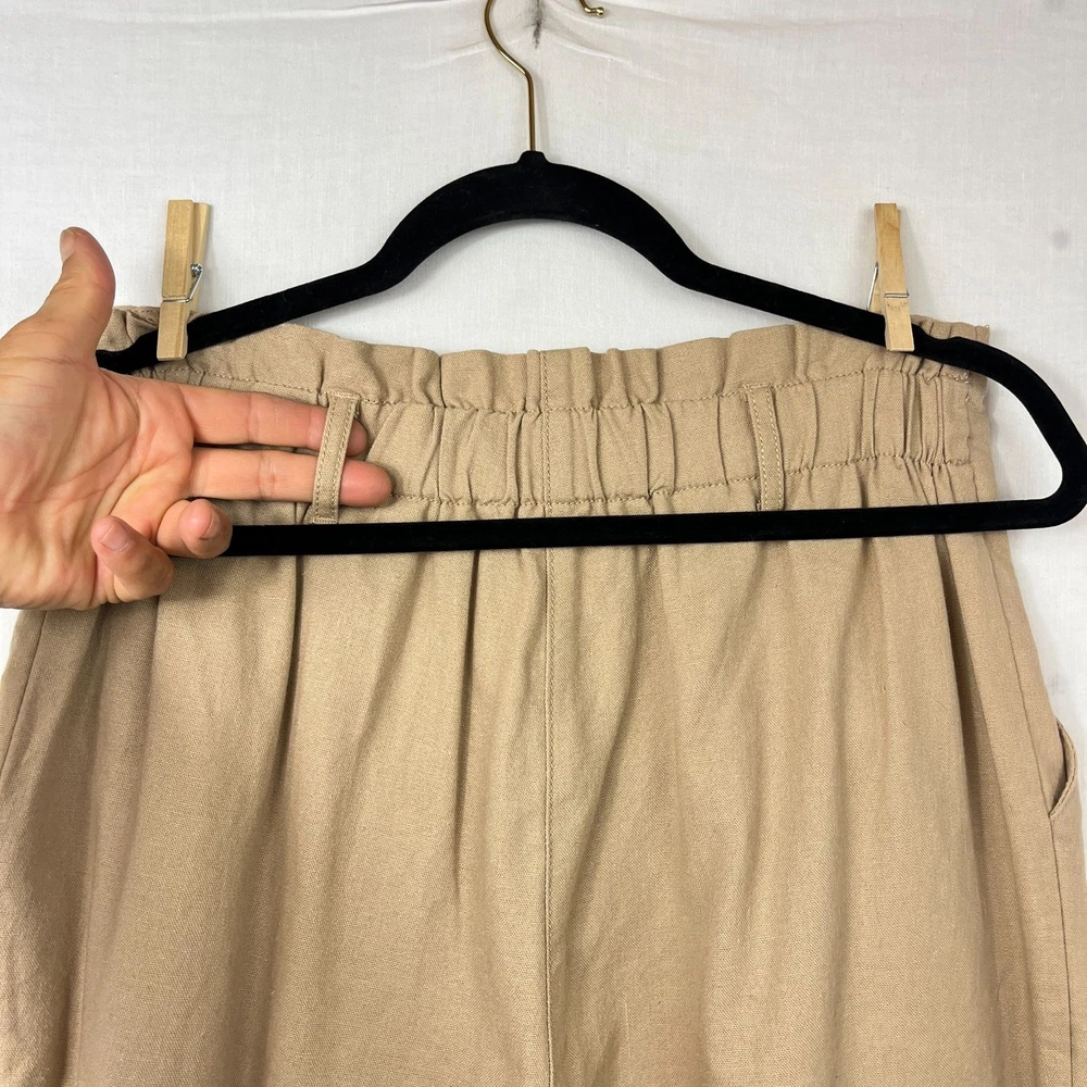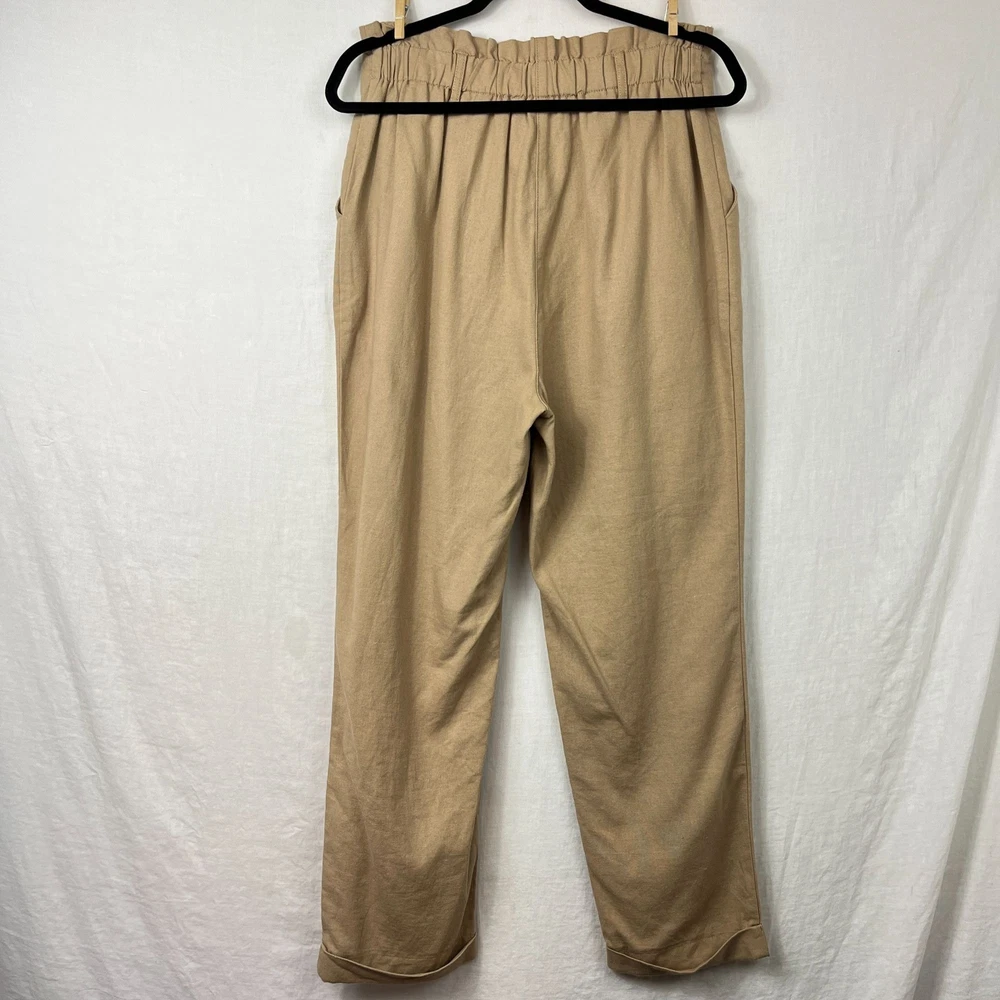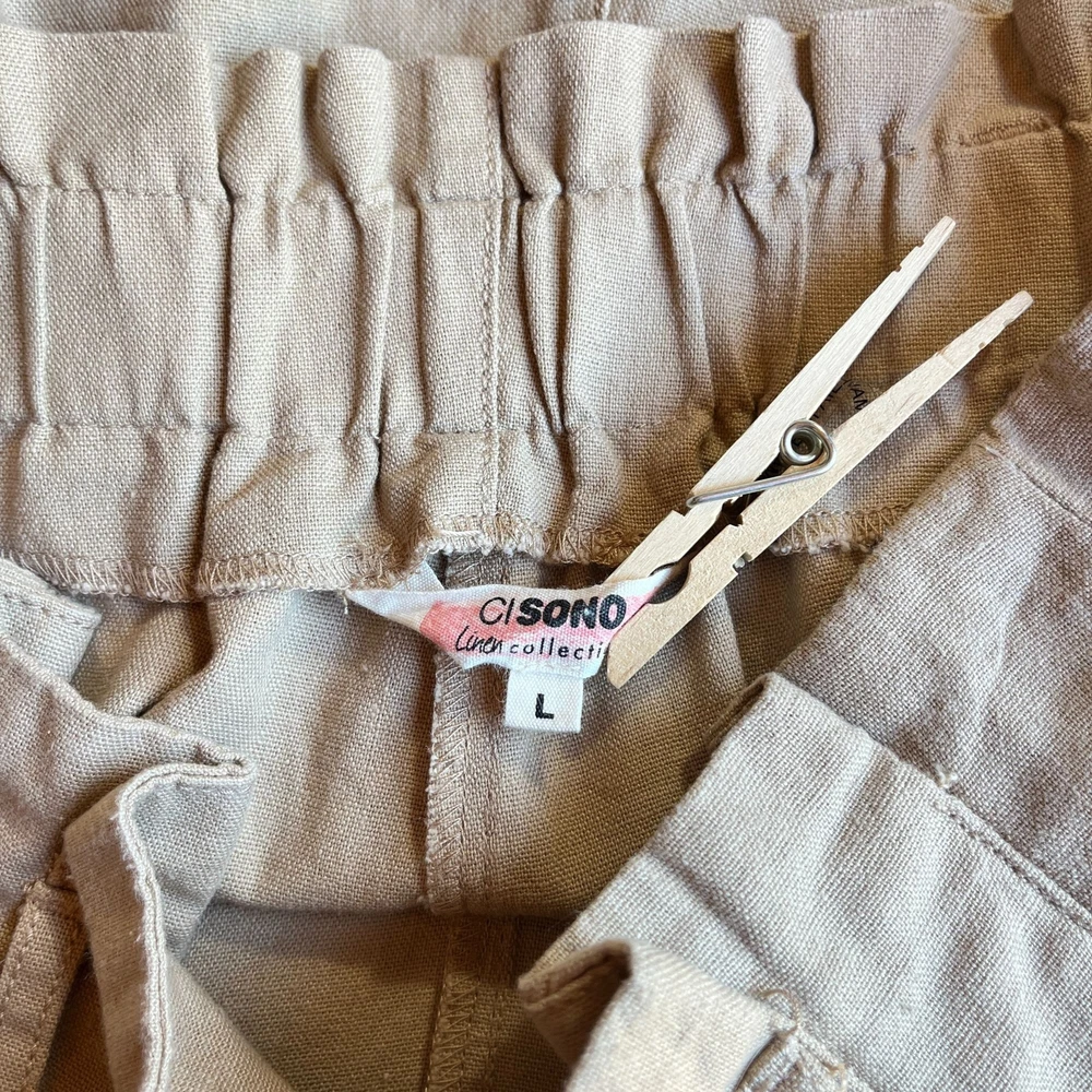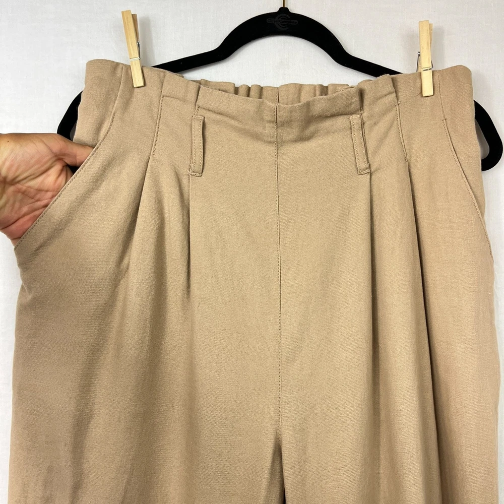 Excellent preowned condition True color is in the second photo Womens size large Ci Sono Linen Collection high waist pull on paperbag pants in khaki tan Pleated front with elastic back Extra wide belt loops Rolled hems Hip pockets Style: lagenlook, minimalist, trousers, professional, preppy, office, career, boho, beige, natural