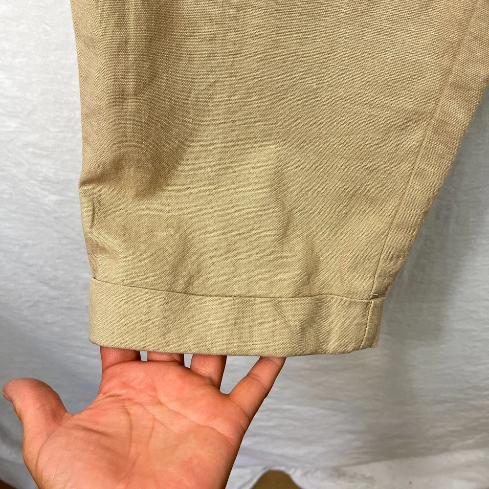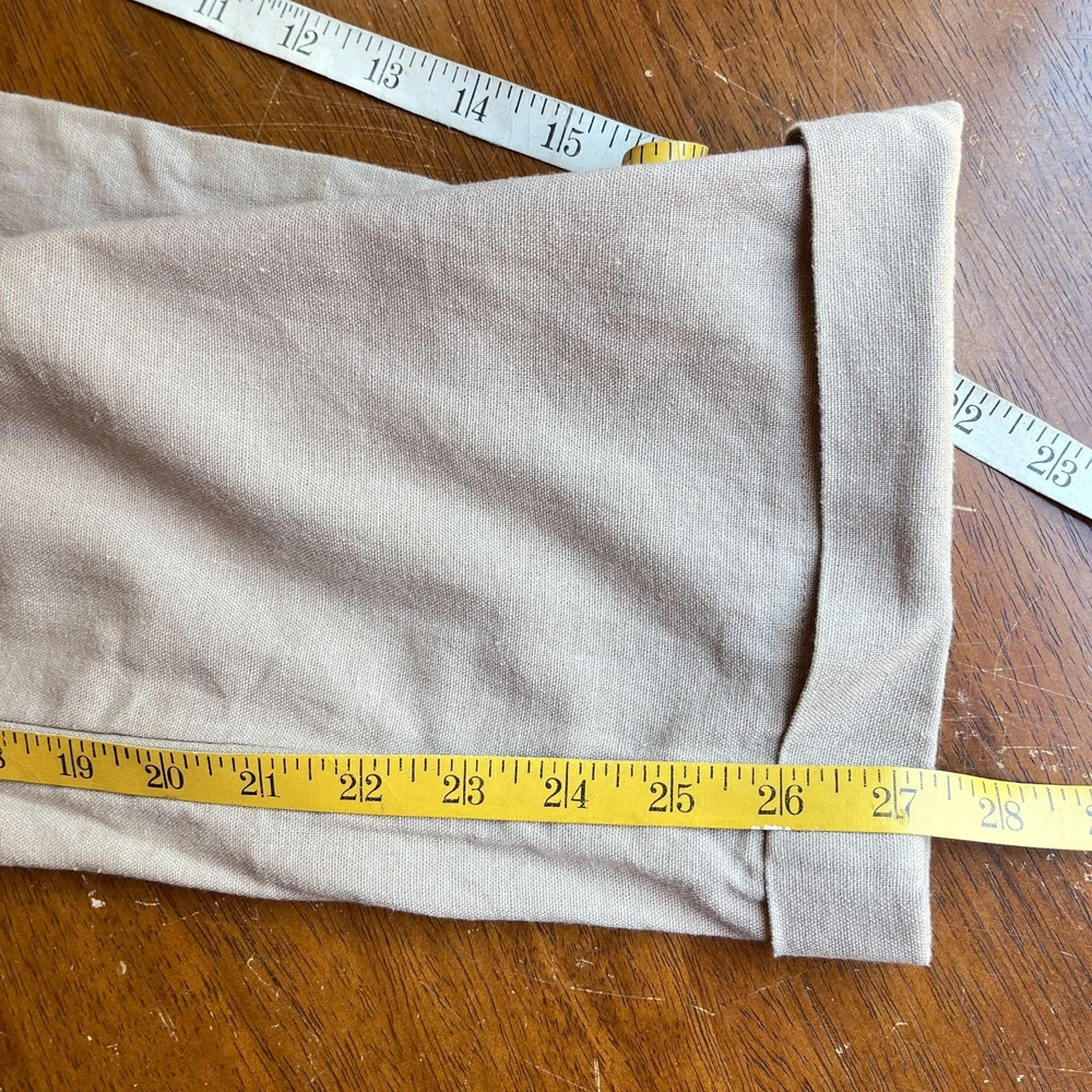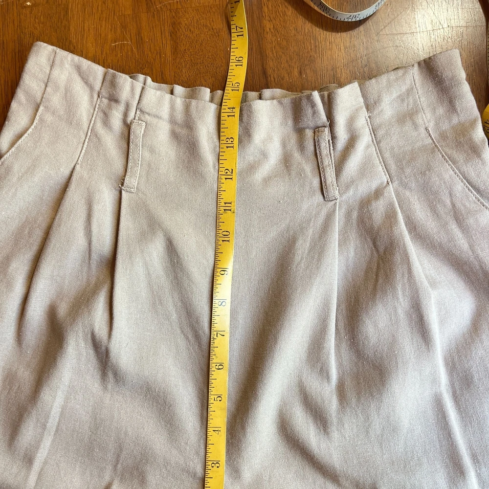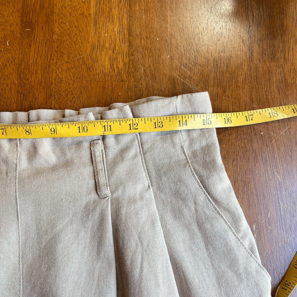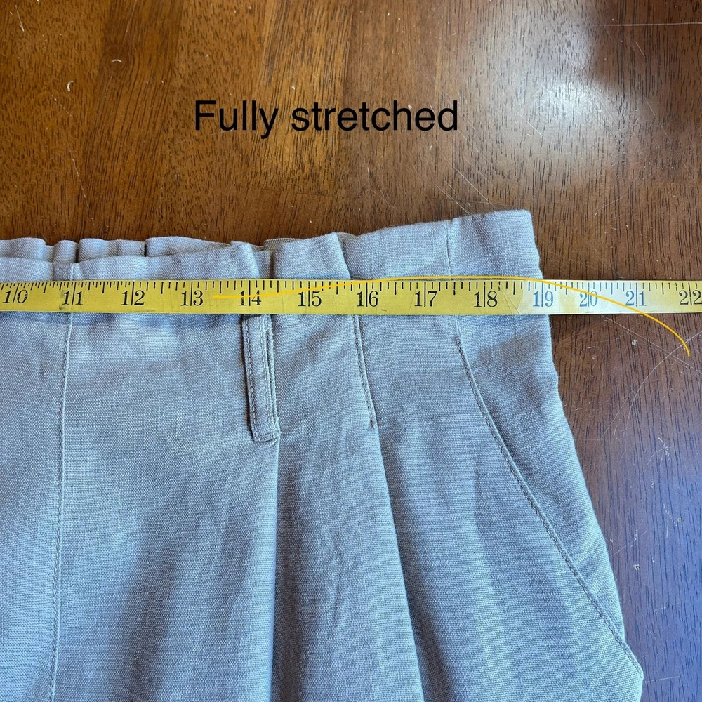 Excellent preowned condition True color is in the second photo Womens size large Ci Sono Linen Collection high waist pull on paperbag pants in khaki tan Pleated front with elastic back Extra wide belt loops Rolled hems Hip pockets Style: lagenlook, minimalist, trousers, professional, preppy, office, career, boho, beige, natural