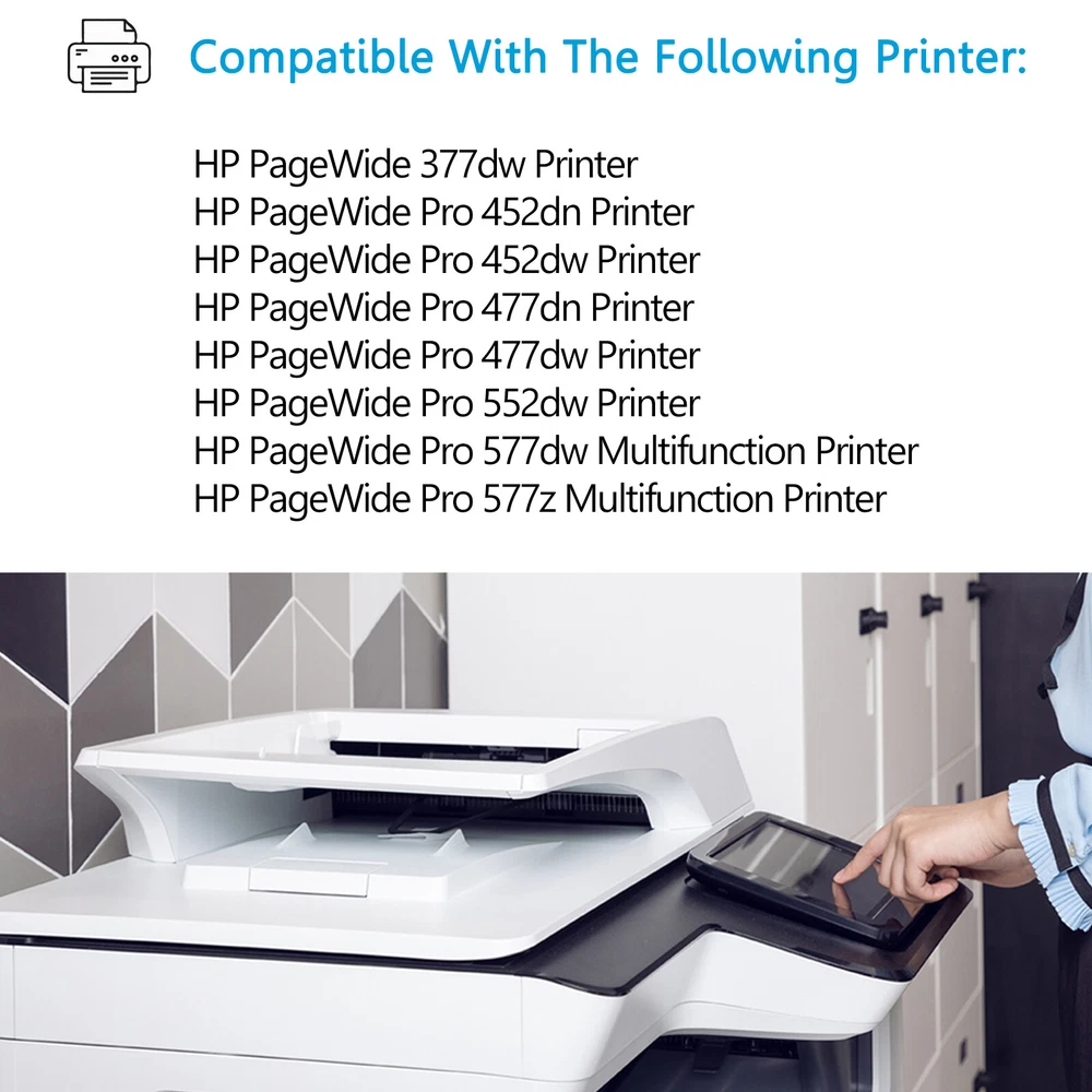 Product Type: Remanufactured Ink Cartridge (NON OEM) Color: Cyan Shelf Life: 2 Years Ink volume: Cyan 50ML Page Yield: Cyan: 3000 pages at 5% coverage Compatible with the following printers HP PageWide 377dw Printer HP PageWide Pro 452dn Printer HP PageWide Pro 452dw Printer HP PageWide Pro 477dn Printer HP PageWide Pro 477dw Printer HP PageWide Pro 552dw Printer HP PageWide Pro 577dw Multifunction Printer HP PageWide Pro 577z Multifunction Printer Product Type: Remanufactured Ink Cartridge (NON OEM) Color: Cyan Shelf Life: 2 Years Ink volume: Cyan 50ML Package Includes: 3 x Cyan Ink Cartridge Page Yield: 3000 pages for cyan ink cartridge at 5% coverage Compatible with the following printers HP PageWide 377dw Printer HP PageWide Pro 452dn Printer HP PageWide Pro 452dw Printer HP PageWide Pro 477dn Printer HP PageWide Pro 477dw Printer HP PageWide Pro 552dw Printer HP PageWide Pro 577dw Multifunction Printer HP PageWide Pro 577z Multifunction Printer Warranty 100% satisfaction guaranteed. Install Instructions Step 1 : Take off the protective clip Step 2 : Remove the static protective vinyl tape. Step 3 : Install the cartridge to the printer.Some printers must be black/color ink cartridges match use. Please clean the printhead 1-2 times once a month.If the printer does not work after installing the cartridge, please clean the chip contacts of the cartridges with a rubber eraser or cotton swab. Take care not to touch the ink nozzles on the bottom of the cartridge. PLEASE DO NOT REMOVE THE CHIP!
