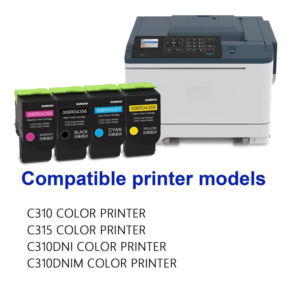 Package Contents: 4-Pack C315 C310 Toner Cartridge (006R04356 Black, 006R04357 Cyan, 006R04358 Magenta, 006R04359 Yellow). Compatible for Printer Models: C310 Printer C315 Printer C310DNI Printer C315DNI Printer High quality standards: high density black and clear text and images. Natural and realistic colors to provide clear printing results to meet your needs. High quality printing: Our high quality photoconductor toner provides a clear and smooth printout. Stable printing quality keeps you away from lines, spots and leaks. Superior Quality: Each of the Toner Cartridges has been ensured full working condition and a superior print quality. Improve efficiency: Improved technology and toner can meet your printing needs in a short time. Applicable scenarios: convenient and cost-effective daily use, such as schools, offices, banks, hospitals and families. Reliable Choice: Follow strict production standards while pursuing a healthier printing experience from advanced materials. Better Print Quality: Strictest quality control to ensure that every customer enjoys stable print quality. Safe Packaging: Separate vacuum sealed package. Professional solid box with double protection. Avoid damage during transportation. Warm tip: Please confirm your printer model before placing an order. After sales service: If you have any questions, please feel free to contact us. We will provide you with the best solution. Package Contents: 4 Pack C310 C315 Toner Cartridges - 006R04356 006R04357 006R04358 006R04359 Toner. Compatible for Printers: C310 C315 C310DNI C315DNI Printers. Page Yield: Up to 3,200 pages per black cartridge and 2,200 Pages per color cartridge, at 5% coverage on A4 paper. Superior quality:Professional Quality Management System strive to ensure excellent quality, keeps your print away from lines, spots and leakage. After sales service: We have established a professional, trustworthy and friendly team.If the Toner Cartridge are defective,We guarantee free returns within 2 years.