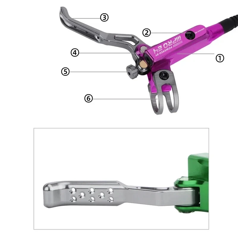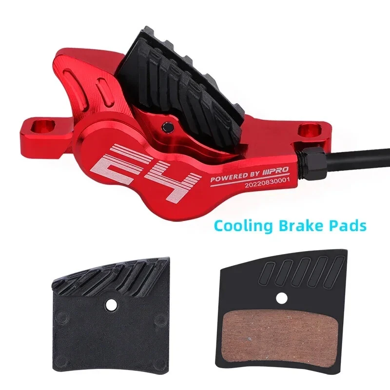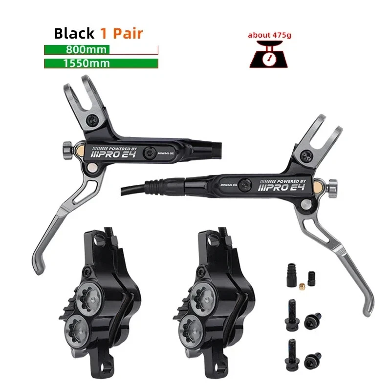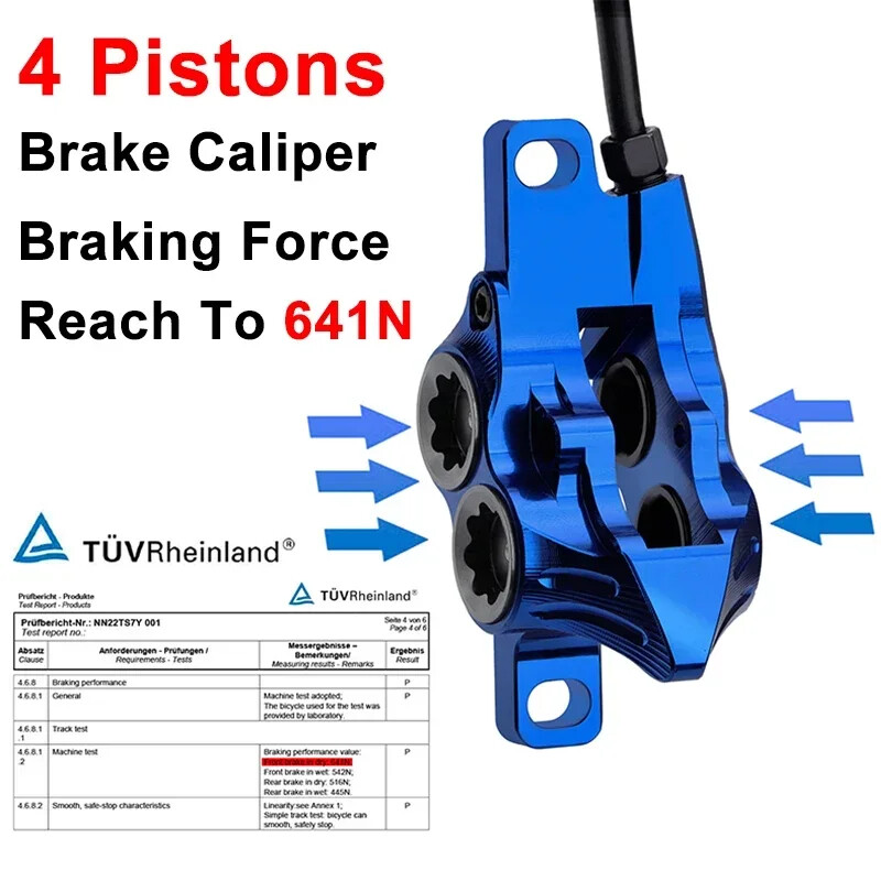 Model: E4 Color: black, red, silver, blue, green, purple Material: magnesium aluminum alloy Length: Front brake 800mm; Rear brake 1550mm Brake Pistons: 4 Pistons Brake Fluid Type: Mineral Brake Fluid Weight: about 230g for the front brake; about 245g for the rear brake; about 28g for the screw. Brake For: mountain bikes, DH,AM,folding bikes, electric bikes, etc. The brakes are the left front brake and the right rear brake Left hand controls the front brake, right hand controls the rear brake. Right rear brake suitable for internal wiring!!! 4 Piston brake Smooth and even braking Cooling brake pads The multi-metal copper-based ceramic heat sink improves the heat dissipation performance by 25%. ①Cylinder block ②M6 oil filling screw ③CNC anti-skid vent brake lever ④Built-in bearing ⑤ Travel adjustment screw ⑥22.2mm detachable clamp ring The rear brake adopts the cable routing inside the frame, and the brake lever/caliper has a split structure. German TUV safety certification, the measured braking force can reach 641N.