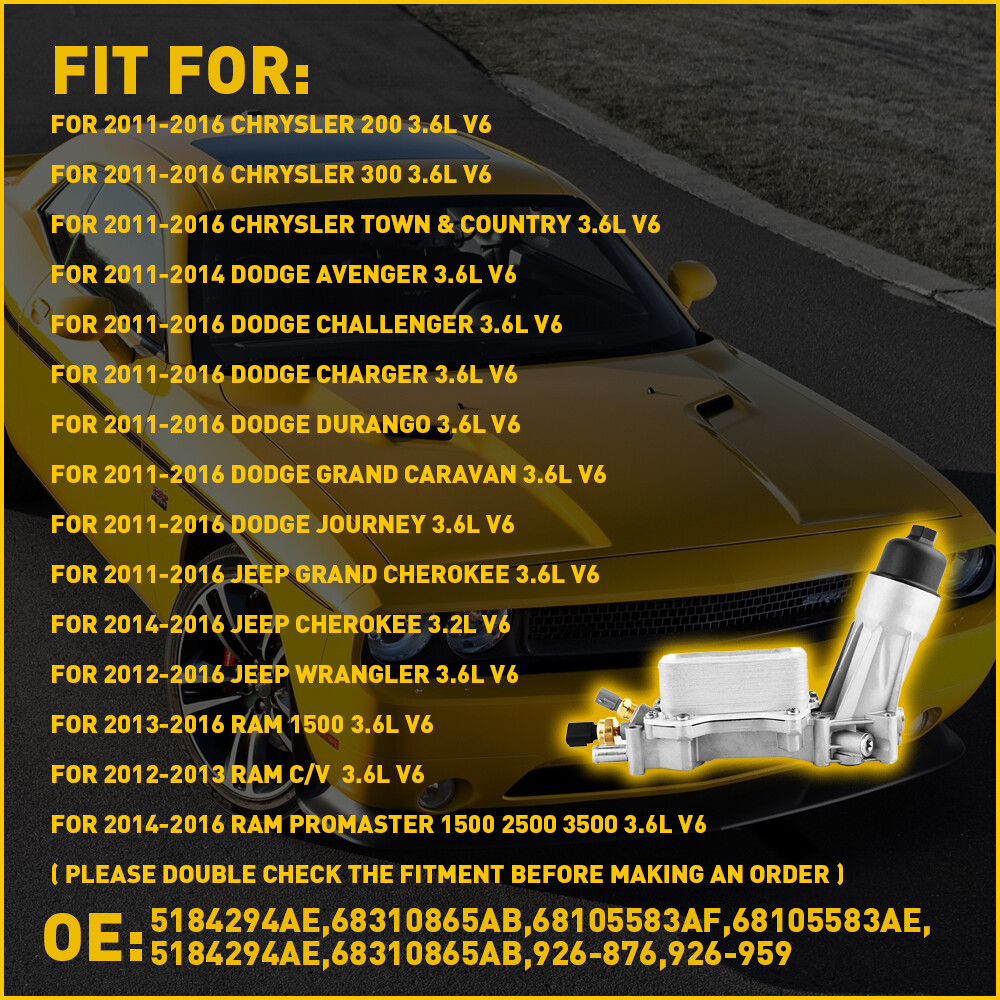 Fits for: For 2011-2016 Chrysler 200 3.6L V6 For 2011-2016 Chrysler 300 3.6L V6 For 2011-2016 Chrysler Town & Country 3.6L V6 For 2011-2014 Dodge Avenger 3.6L V6 For 2011-2016 Dodge Challenger 3.6L V6 For 2011-2016 Dodge Charger 3.6L V6 For 2011-2016 Dodge Durango 3.6L V6 For 2011-2016 Dodge Grand Caravan 3.6L V6 For 2011-2016 Dodge Journey 3.6L V6 For 2011-2016 Jeep Grand Cherokee 3.6L V6 For 2014-2016 Jeep Cherokee 3.2L V6 For 2012-2016 Jeep Wrangler 3.6L V6 For 2013-2016 Ram 1500 3.6L V6 For 2012-2013 Ram C/V 3.6L V6 For 2014-2016 Ram ProMaster 1500 2500 3500 3.6L V6 Aluminum Oil Cooler & Oil Filter Housing Adapter for Chrysler Dodge Jeep 3.6L V6 Fits for: For 2011-2016 Chrysler 200 3.6L V6 For 2011-2016 Chrysler 300 3.6L V6 For 2011-2016 Chrysler Town & Country 3.6L V6 For 2011-2014 Dodge Avenger 3.6L V6 For 2011-2016 Dodge Challenger 3.6L V6 For 2011-2016 Dodge Charger 3.6L V6 For 2011-2016 Dodge Durango 3.6L V6 For 2011-2016 Dodge Grand Caravan 3.6L V6 For 2011-2016 Dodge Journey 3.6L V6 For 2011-2016 Jeep Grand Cherokee 3.6L V6 For 2014-2016 Jeep Cherokee 3.2L V6 For 2012-2016 Jeep Wrangler 3.6L V6 For 2013-2016 Ram 1500 3.6L V6 For 2012-2013 Ram C/V 3.6L V6 For 2014-2016 Ram ProMaster 1500 2500 3500 3.6L V6 ( Please double check the fitment before making an order. ) Specifications: OE: 5184294AE, 68310865AB, 68105583AF, 68105583AE, 5184294AE, 68310865AB, 926-876, 926-959 Features: *Superior material Made of upgraded aluminum material to replace the original fragile oil filter and provide a better performance. *High temperature resistance The product with high temperature resistance and leakproof functions ensures its long service life and durability. *Complete accessories Equipped with all components required for installation,including oil temperature sensor,oil pressure sensor,oil cooler,O-ring,intake manifold etc. *Simple installation Simple installation with direct replacement,other modifications are not required. Packaging include: 1 x Engine Oil Cooler Filter Adapter Housing [with Oil Pressure & Temperature Sensor, O-Rings (Installed), Oil Filter (new pre-installed) & Oil Filter Cap] 6 x Gaskets (for Upper intake manifold) 6 x Gaskets (for Lower intake manifold) Item Specifics Brand Unbrand Placement on Vehicle Front Manufacturer Part Number 926-876 926-959 Interchange Part Number 68105583AA 68105583AB 68105583AC 68105583AD 68105583AE 68105583AF 68105583AG 68310865AA 68310865AB 68310865AC 68310865AF 68365925AA 68365925AB 68365925AC 68365925AD 926-876 Type Engine Oil Filter Housing Manufacturer Warranty 3 Years Features Easy Installation OE/OEM Part Number 5184294AE 68310865AB 68105583AF 68105583AE 926-876 926-959 Gasket Material Rubber Material Aluminum Universal Fitment Yes Fitment one for Chrysler 200 300 Town & Country Fitment two for Dodge Avenger Challenger Charger Grand Caravan Fitment Three For ProMaster 2500, ProMaster 3500 Fitment Four for Jeep Grand Cherokee Cherokee Items Included Cover, Gasket, O-Ring, Screws, Seal, Oil Filter, Oil Cooler Engine 3.6L V6 Mounting Style Clip-On Finish Matte Superseded Part Number 5184294AE, 68310865AB Mounting Style Clip-On Finish Matte Superseded Part Number 5184294AE, 68310865AB FAQ ♥ If you have a decoding problem or any other problems, please contact us first, we will help you with it. We will reply you within 24 hours in working days. I'm a new seller, thanks a lot for your trust and convince! I will serve you with all my heart. ♥ Q1: Will this bulb fit my vehicle? A: We can match almost any vehicle to one of our bulb sizes. eBay only lets us include some vehicle fitments per listing, but if your vehicle does not show up on the compatibility table at the top of our listings, welcome you to contact us for free consulation before purchasing a product. Q2: My item has not arrived, what's taking so long? A: Sometimes items take longer than expected, especially if it’s going far or to rural area. Check with your post office to see if your item has been held up. Sometimes Royal Mail will not update a tracking number until it has arrived at its destination. If your item still don't arrive after a few days, let us know so we can double check for you and help solve it asap. Q3: My bulbs won't fit, help! A: Special bulb holder may be required. See if you can take the holder from the stock bulb. If not, let us know. The bulb size may be wrong, double check the item you received with the item you ordered. Do you have an aftermarket lighting housing? These may not be perfectly fitted for aftermarket bulbs and will require some manual modifications. Q4: Neither side lighting up? Both sides flicker, hyper flash, or work inconsistantly. A:Check the light fuses, and then check the ballast plugs to insure correct installation. If this doesn't work, there may be a voltage problem with the vehicle. You probably just need a relay or capacitor. Even though some bulbs are builtin resistors, they may still need a decoder. Pay & Ship (1). We gladly accepts payment via PayPal, We will ship your item(s) within 24 hours. (2). Before payment, please keep the consistency of Paypal address and ebay address. (3). Quantity orders are welcome! Returns (1). We offer 60 days free return policy. Please contact us within 60 days from the date you receive your order if you have any issues with the product or want return. Refund will be send after we got your resend package. (2). All returned items should be in the original packaging , return tracking information should be provided . Contact Us (1).Negative feedback will not help resolve any problems you have, please contact us via eBay messages before leaving negative feedback , our customer service will make best effort to help you with the issues. (2).We maintain high standards of excellenceand strive for 100% customer satisfaction! Feedback is very important to us. We request that you contact us immediately before you give us neutral or negative feedback, so that we can satisfactorily address your concerns