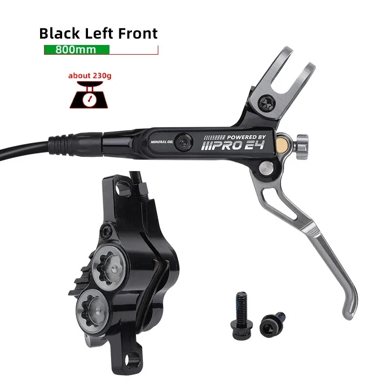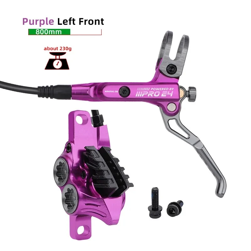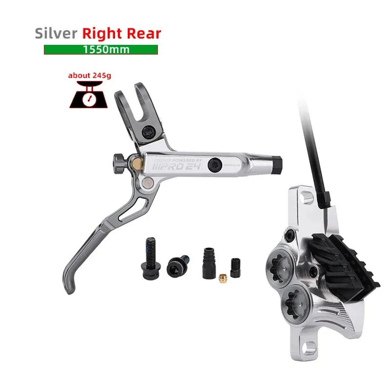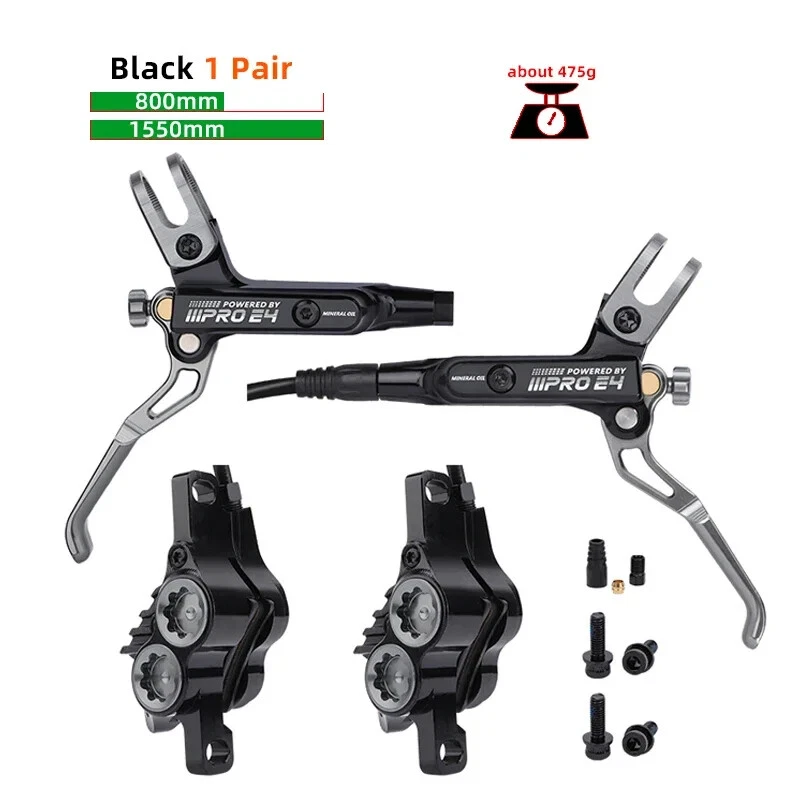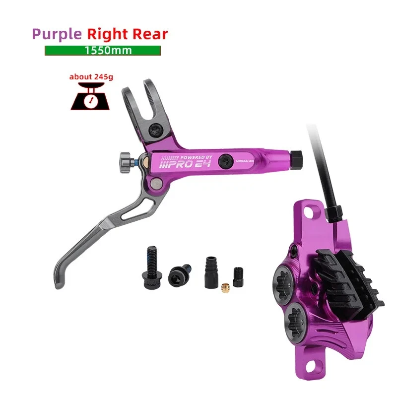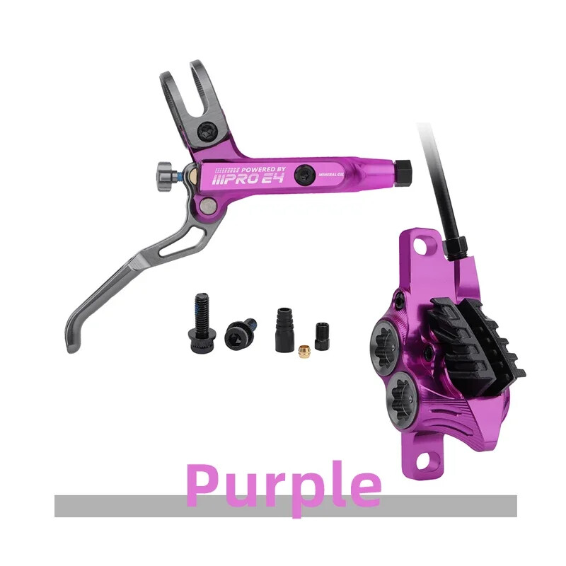 Model: E4 Color: black, red, silver, blue, green, purple Material: magnesium aluminum alloy Length: Front brake 800mm; Rear brake 1550mm Brake Pistons: 4 Pistons Brake Fluid Type: Mineral Brake Fluid Weight: about 230g for the front brake; about 245g for the rear brake; about 28g for the screw. Brake For: mountain bikes, DH,AM,folding bikes, electric bikes, etc. The brakes are the left front brake and the right rear brake Left hand controls the front brake, right hand controls the rear brake. 4 Piston brake Smooth and even braking Cooling brake pads The multi-metal copper-based ceramic heat sink improves the heat dissipation performance by 25%. ①Cylinder block ②M6 oil filling screw ③CNC anti-skid vent brake lever ④Built-in bearing ⑤ Travel adjustment screw ⑥22.2mm detachable clamp ring The rear brake adopts the cable routing inside the frame, and the brake lever/caliper has a split structure.