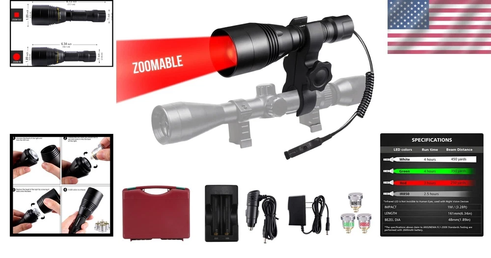 High-Performance Predator Hunting Torch with Red, Green, White & IR 850nm Light ‹ › ‹ › ‹ › ‹ › ‹ › ‹ › ‹ › ‹ › High-Performance Predator Hunting Torch Illuminate your hunting adventures with the ultimate High-Performance Predator Hunting Torch. This state-of-the-art hunting light kit offers unparalleled versatility and functionality, making it a must-have for any serious hunter. Features: 4 Different Color Beams: Green (350 yards), Red (250 yards), White (450 yards), and Infrared (IR) 850nm Tool-free interchangeable LED modules allow you to transition from wide flood to focused spot beams effortlessly. No colored lenses used—ensures maximum light output. Innovative dual control switch design featuring momentary and clicky on/off coil cord switch for optimal ease of use. Comes with a home charger and car charger for on-the-go charging, plus 2 rechargeable batteries for a consistent 3-4 hours of run time. Durable aluminum alloy housing with anodized finish for rainproof reliability during harsh weather conditions. Quick-release universal scope mount compatible with various scope sizes ranging from 1” to 30mm. Benefits: Versatile lighting options tailored specifically for predator hunting—enhancing visibility and accuracy. Quick and easy setup allows you to spend more time hunting and less time managing gear. Long-lasting battery life ensures you’re always ready for action when the perfect opportunity arises. Sturdy, rainproof construction lets you pursue your passion regardless of the elements. Thoughtfully designed with hunters in mind, allowing for seamless integration with your equipment. Why Choose Our Predator Hunting Torch? For the dedicated hunter who seeks precision and adaptability, our High-Performance Predator Hunting Torch is the epitome of functionality and durability. Utilizing only the highest quality materials and innovative design, this torch isn't just a tool—it's your companion for those crucial moments in the field. With various color beams tailored for specific hunting scenarios, you’ll have the best vision for every pursuit. Don’t let the darkness limit your passion for hunting. Elevate your skills with our Predator Hunting Torch and enjoy the thrill of the hunt like never before! Shipping Free & Fast Shipping - We offer free shipping to most of the USA with a normal delivery time of 3-7 days. However, due to the current situation, additional delivery time (up to 3 weeks) may be required for some items. Alternative Carriers - We may use alternative carriers (e.g. USPS, FedEx, UPS, etc.) to ensure your package arrives safely and on time. Due to the use of multiple carriers, we are unable to provide a tracking number automatically. Handling Time - Orders are processed and shipped within 1-2 business days of receiving cleared payment. Shipping Restrictions - Shipping to Alaska, Hawaii, Puerto Rico, Guam, and other US territories may incur shipping charges or delivery restrictions. Please contact us before ordering, or your order can be refunded/cancelled. State Restrictions - There may be restrictions based on your state of purchase. For example, certain items may not be shipped to California due to state regulations. Contact for Tracking Updates - If you require tracking updates or have any concerns about the delivery of your order, please feel free to contact us, and we will be happy to assist you. Return 30-Day Hassle-Free Returns - We want you to be completely satisfied with your purchase. If you are not, you can return the item within 30 days of receiving it for a full refund or exchange. Easy Return Process - To start a return, simply contact us and we will provide you with a prepaid return shipping label and detailed instructions. Restocking Fee - There are no restocking fees for returns. However, the buyer is responsible for return shipping costs if the return is not due to a seller's error. Refund Processing Time - Refunds will be processed within 5 business days of receiving the returned item in its original condition. Payment We accept all major credit cards, PayPal, and Apple Pay for your convenience. Your payment information is secure and encrypted to ensure a safe and seamless transaction. Please complete your payment within 3 days of purchase to avoid any delays in shipping. Feedback Your feedback is extremely important to us. We strive to provide the best products and customer service possible. If you are satisfied with your purchase, please take a moment to leave us a positive review. If you have any concerns or issues with your order, please contact us before leaving negative feedback. We are committed to resolving any problems and ensuring your satisfaction. Contact Us If you have any questions or concerns, please feel free to reach out to our customer support team. You can contact us through the eBay messaging system. We are available Monday to Friday, 9:00 am to 5:00 pm EST, and we will do our best to respond to your inquiry within 24 hours. Buy it now and enjoy a pleasant shopping experience! UPC: Not Set Voltage: Not Set Item Height: Not Set Item Length: Not Set Item Weight: 2.29 lb Item Width: Not Set Model: Not Set Lumens: Not Set Number of LEDs: 4 Unit Quantity: 1 Material: Aluminum Features: Rechargeable,Waterproof,Interchangeable LED Modules,Dual Control Switch Design,Rainproof Brand: Unbranded Type: Flashlight Lighting Technology: LED Power Source: Battery Operating Range: 350 yards MPN: Not Set Battery Technology: Li-Ion Number of Batteries: 2 Color: Red Country/Region of Manufacture: Not Set IP Rating: Not Set Operating Time: 3-4 Hours Number of Lights: 1-3 Unit Type: lb Personalize: Not Set