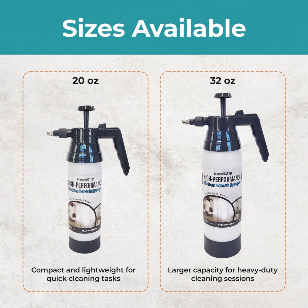 Introducing the High-Performance Kitchen & Bath Sprayer You already know buying those cleaning liquids in bulk saves you money, and helps reduce waste. But most traditional cleaning sprayers you fill with these products are made with flimsy, low-quality nozzles and triggers. Now you can buy your cleaning products in bulk and use them with our high quality and robust pump-up sprayer. Crafted with an adjustable nozzle, you can choose between an ultra-fine mist, a strong jet stream, or anything in between. With just 8-12 pumps, our High-Performance Kitchen & Bath Sprayer delivers an ultra-fine mist or spray, making cleaning faster, easier, and more enjoyable. Simply buy your cleaners in bulk, fill, pump, and mist! Designed for anyone who loves a clean space, whether you’re a homemaker, restaurant owner, or teacher, this sprayer works with most water-solvent cleaning products. It’s perfect for dusting, cleaning, glass, window washing, and more. Built to last with high-grade silicone o-rings, the sprayer is graded for up to 100 PSI pressure. Available in both 20 oz and 32 oz sizes, it’s your go-to cleaning tool for keeping your home spotless. Countless Uses: Spray down kitchen counters Clean bathroom sinks Spray down shower tiles and grout Clean windows and mirrors Spray down kitchen table and dining table Sanitize gym equipment Wash pet crates Clean refrigerator, microwave, and toaster oven Wash granite or marble countertops Spray down classroom desks REUSABLE & DURABLE – Upgrade from flimsy sprayers to our long-lasting high-performance pump sprayer. It works with most of your regular household cleaning products, allowing you to buy in bulk, reduce waste, and save money. HIGH-PERFORMANCE SPRAYER – This handheld mister spray bottle is perfect for cleaning, disinfecting, dusting and washing. It works on all surfaces, appliances, and glass, with mist, spray, and stream settings for any cleaning task. PRESSURIZED CONTINUOUS SPRAY BOTTLE – Pump it 8 to 12 times for a high-pressure mist or a jet stream, and everything in between. The trigger lock allows continuous spraying, making cleaning faster and easier. ADJUSTABLE NOZZLE – Twist the nozzle to switch between an ultra-fine mist, a strong jet stream, or any setting in between. It's graded for up to 100 PSI, perfect for various cleaning needs. EASY TO USE – Simply fill the cleaning spray bottle with your favorite household cleaner, pump it to pressurize, and press the trigger to release a continuous spray or mist. Use It for cleaning your shower, sink, kitchen island, glass windows, counters, bathrooms, living rooms, playrooms and more. NOTE: Each one is factory tested with water to ensure pressurization, and some moisture may remain in the sprayer when it is newly purchased.