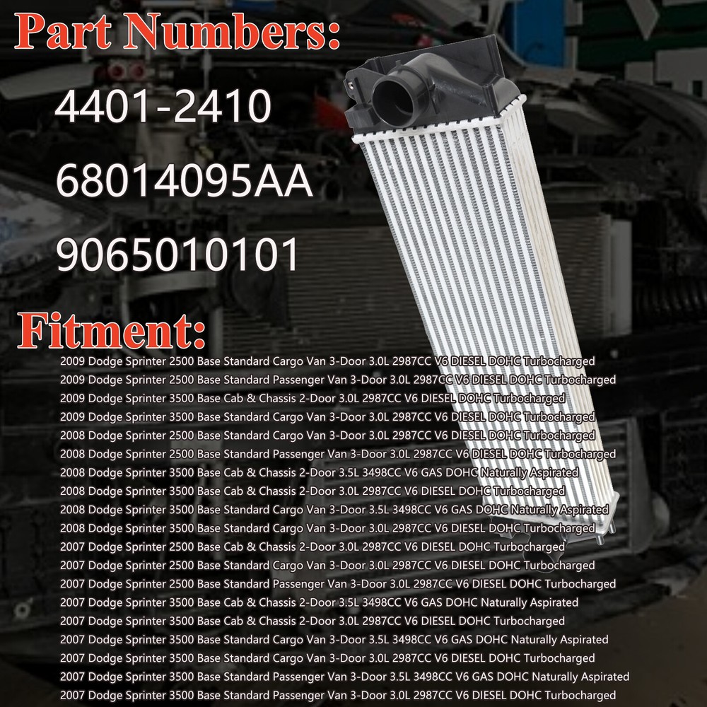 Store Home New Listing Ending Soon Sale items View Feedback Contact us Shock Absorbers & Spring Power Steering Pump Rack & Pinion Engine Rebuild Kit Store Categories Turbo Charge Air Cooler Intercooler for Dodge Sprinter 2500 3500 3.0L 2007-2009 Turbo Charge Air Cooler Intercooler for Dodge Sprinter 2500 3500 3.0L 2007-2009 Product Description 1pc Intercooler For 2007-2009 Dodge Sprinter 2500 / 3500 68014095AA Specifications Material: Aluminum Color: Silver Placement on Vehicle: Front OE Number: 4401-2410,68014095AA,9065010101 Fitment: For 2009 Dodge Sprinter 2500 Base Standard Cargo Van 3-Door 3.0L 2987CC V6 DIESEL DOHC Turbocharged For 2009 Dodge Sprinter 2500 Base Standard Passenger Van 3-Door 3.0L 2987CC V6 DIESEL DOHC Turbocharged For 2009 Dodge Sprinter 3500 Base Cab & Chassis 2-Door 3.0L 2987CC V6 DIESEL DOHC Turbocharged For 2009 Dodge Sprinter 3500 Base Standard Cargo Van 3-Door 3.0L 2987CC V6 DIESEL DOHC Turbocharged For 2008 Dodge Sprinter 2500 Base Standard Cargo Van 3-Door 3.0L 2987CC V6 DIESEL DOHC Turbocharged For 2008 Dodge Sprinter 2500 Base Standard Passenger Van 3-Door 3.0L 2987CC V6 DIESEL DOHC Turbocharged For 2008 Dodge Sprinter 3500 Base Cab & Chassis 2-Door 3.5L 3498CC V6 GAS DOHC Naturally Aspirated For 2008 Dodge Sprinter 3500 Base Cab & Chassis 2-Door 3.0L 2987CC V6 DIESEL DOHC Turbocharged For 2008 Dodge Sprinter 3500 Base Standard Cargo Van 3-Door 3.5L 3498CC V6 GAS DOHC Naturally Aspirated For 2008 Dodge Sprinter 3500 Base Standard Cargo Van 3-Door 3.0L 2987CC V6 DIESEL DOHC Turbocharged For 2007 Dodge Sprinter 2500 Base Cab & Chassis 2-Door 3.0L 2987CC V6 DIESEL DOHC Turbocharged For 2007 Dodge Sprinter 2500 Base Standard Cargo Van 3-Door 3.0L 2987CC V6 DIESEL DOHC Turbocharged For 2007 Dodge Sprinter 2500 Base Standard Passenger Van 3-Door 3.0L 2987CC V6 DIESEL DOHC Turbocharged For 2007 Dodge Sprinter 3500 Base Cab & Chassis 2-Door 3.5L 3498CC V6 GAS DOHC Naturally Aspirated For 2007 Dodge Sprinter 3500 Base Cab & Chassis 2-Door 3.0L 2987CC V6 DIESEL DOHC Turbocharged For 2007 Dodge Sprinter 3500 Base Standard Cargo Van 3-Door 3.5L 3498CC V6 GAS DOHC Naturally Aspirated For 2007 Dodge Sprinter 3500 Base Standard Cargo Van 3-Door 3.0L 2987CC V6 DIESEL DOHC Turbocharged For 2007 Dodge Sprinter 3500 Base Standard Passenger Van 3-Door 3.5L 3498CC V6 GAS DOHC Naturally Aspirated For 2007 Dodge Sprinter 3500 Base Standard Passenger Van 3-Door 3.0L 2987CC V6 DIESEL DOHC Turbocharged Package Include: One Piece of Air Cooler Features: 1. Built to strict quality control standards 100% factory tested 2. IATF16949 3. 100% Compatible with OEM Parts, meets Original Equipment Manufacturer (OEM) Standards 4. The sturdy aluminum core ensures the durability of the product while providing excellent heat transfer. 5. Compact tube and fin construction ensuring better air flow and larger surface increasing the heat exchange 6. Perfect product fit, enabling fast and smooth installation. 7. Plastic tanks with reinforcing inner cross-bars, strengthened inlets and outlets and specially designed side panels to help against stress caused by high temperatures and mechanical tensions. Attention: 1) Align the installation holes with the fixed positions and use standard bolts for fastening. 2) When connecting the inlet and outlet ports with the engine hoses, they should be tight and there should be no air leakage. 3) Fix the pipelines and pipelines, and complete the installation. Note: During the installation of the intercooler, please do not damage the diffuser (fin) and damage the intercooler to ensure the heat dissipation capacity and sealing. Note: Professional Installation is Highly Recommended Installation Instruction is NOT Included About Us Payment Shipping Returns Contact Us About Us VEHICULOS Story: Mission: The mission of VEHICULOS automotive parts is to provide customers with excellent quality and reliability, ensuring their vehicles are always in optimal condition. We aim to be the preferred brand in the field of car maintenance and repair, offering unmatched value and trust to our customers. Philosophy: At VEHICULOS, we believe that every single automotive part plays a crucial role, influencing the overall performance and safety of the vehicle. Therefore, we strive for the perfect combination of exceptional quality, innovative technology, and superior service to meet the demand for high-standard automotive parts. Founder's Experience: The founder of VEHICULOS automotive parts, Cooper, is an automotive engineer and an expert passionate about car maintenance. He held key positions in renowned car manufacturers and aftermarket companies, accumulating extensive industry experience. However, he recognized the varying quality of automotive parts available in the market and was determined to create the VEHICULOS brand, offering reliable and high-quality parts to provide customers with worry-free maintenance and repair experiences. "Excellence in Quality, Confidence in Every Drive" - VEHICULOS Automotive Parts, infusing your vehicle with reliable power! VEHICULOS automotive parts stand out in a highly competitive market due to the following differentiating factors : 1,Superior Quality: VEHICULOS strictly controls every production process to ensure all parts meet the highest quality standards. We utilize premium materials and advanced manufacturing techniques, subjecting each component to rigorous testing and validation for durability, performance, and safety. 2,Innovative Technology: VEHICULOS continuously introduces innovative technologies, incorporating the latest advancements into the design and manufacturing of our parts. We strive to deliver products with outstanding performance and advanced features, meeting customers' expectations for enhanced vehicle performance and driving experience. 3,Customer Care: We understand the importance of customer satisfaction in vehicle maintenance and repair. Therefore, VEHICULOS always prioritizes customer needs. We provide professional pre-