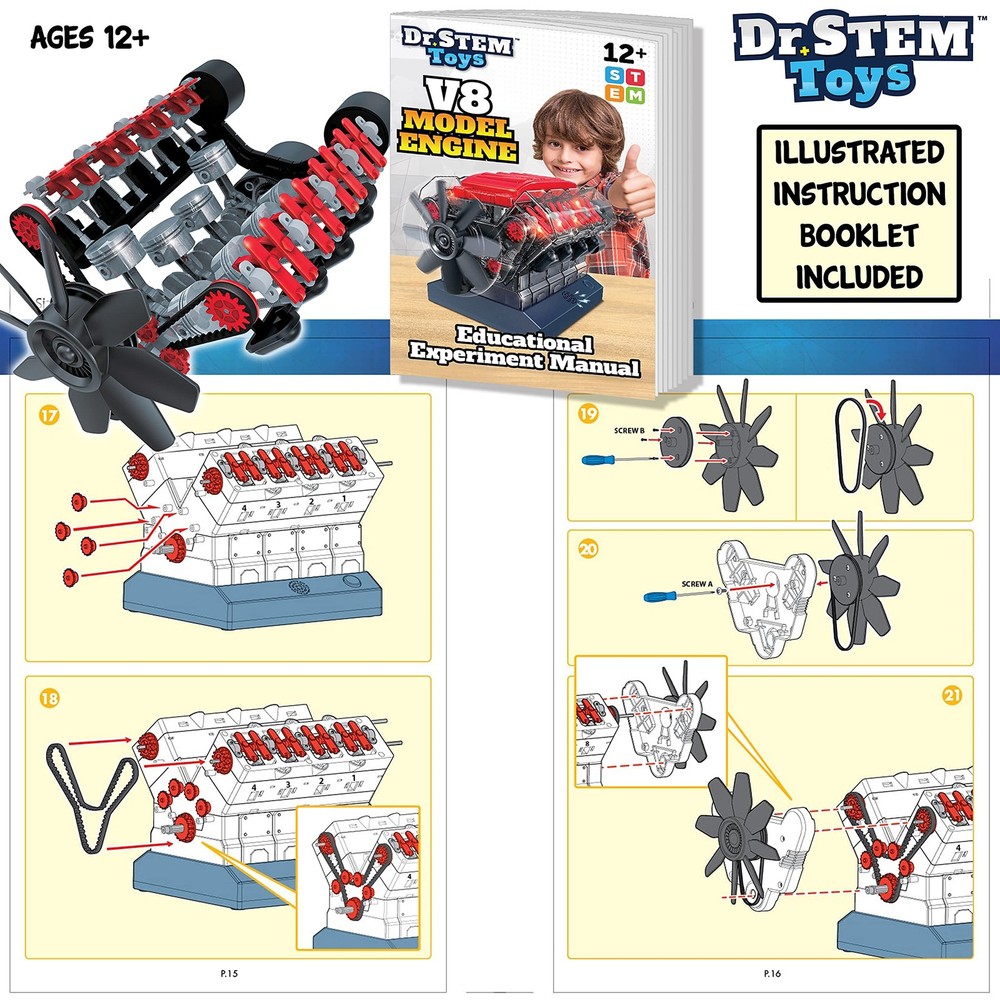 COMPLETE KIT: Includes over 250 quality pieces and illustrated guide IT REALLY WORKS: Once assembled the pistons move, fan spins, lights up, and sound effects A STEM TOY: Kids learn how a V8 combustion engine works with hands on experiments MAKES SCIENCE FUN: Exciting to build then watch it run. Great for home or classroom. Ages 12+ GREAT GIFT IDEA: Perfect for birthday or holiday, boys and girls ages 12+