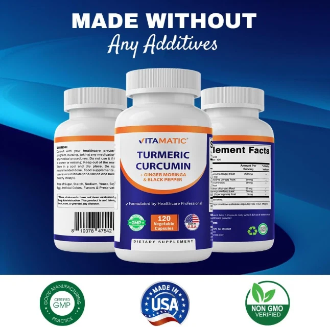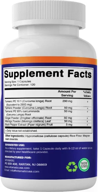 Pastillas de Curcumina de Curcuma 3000mg- Suplemento Natural de Apoyo Non-GMO 12 US Warehouse - FREE & FAST Shipping in US Product Description: These statements have not been evaluated by the FDA. This product is not intended to diagnose, treat, cure, or prevent any disease or health condition. MADE WITH 95% CURCUMINOIDS, GINGER, & MORINGA - Our premium Turmeric Curcumin Complex 3000mg Equivalent Serving; with 95% Standardized Curcuminoids, Ginger, Moringa and enhanced with Black Pepper to provide maximum absorption and bio-availability ENHANCED ABSORPTION WITH BLACK PEPPER: Black Pepper, with ginger, has been shown to improve the absorption of many herbs and spices; and provides as much as 2000x better absorption than consuming normal turmeric capsules alone Third-Party Tested: This product undergoes rigorous third-party testing to ensure quality and purity. Vegetarian Capsules: Made with vegetable cellulose, these capsules are non-GMO and gluten-free. Convenient Dosage: With 120 Capsules / 120 Servings per bottle, this supplement provides a long-lasting supply. Easy to Swallow: The capsules are designed for easy consumption and absorption. QUALITY ASSURED: Made in the USA in an FDA-inspected facility following strict GMP guidelines. Feedback: 1.Any question for your order, please contact us in time, we will reply to you within 24 hours and give you a satisfactory answer. 2.If you are satisfied with our products and services, hope to take up your a little precious time to leave feedback reviews for our products.Thanks! 3.Your satisfaction is our effort. Welcome to order again! Have a great day! Our Policy: 100% Satisfaction Guarantee 20% of restocking fee will be charged for return item