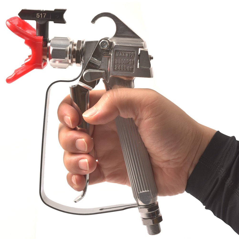 It is for use with any airless paint sprayer,such as magnum All Airless paint sprayers. This spray handle is ideal for homeowners for spraying a variety of coatings including primers,stains and varnishes. Featured a thumb engaged metal trigger lock, it allows you to lock the handle when not spraying for safety. Specifications: Main material: Aluminum,Color:Silver Max Operating Pressure: 3600 PSI Inlet: 1/4” Thread Outlet: 7/8” Thread Spray Tip Size: 517,Color: Black. Spray Guide Accessory Model: General. Extension Bar Size:10 IN. Trigger Configuration: Four Finger Trigger Wight: 2.3 lbs Dimension: Handheld Sized Package: 1 x Airless Spray Gun 1 x Spray Guide Accessory 1 x 517 Tip 1 x Tip Guard 1 x Extension Bar 3600 PSI Maximum Pressure, four-finger trigger, soft pull.Forged Gun Head, 100 mesh gun filter inside. The spray-guide works for airless sprayer with 7/8” thread size. Consist of a 180-degree swivel, tip guard,517 Spray tip, tip seal,a freewheeling disc. With a 10 inch extension bar, it is easy to get close to the location needed for spraying and reduce your labor intensity. Built-in hose swivel to reduce hose twists. Can be used on most of airless paint sprayers.