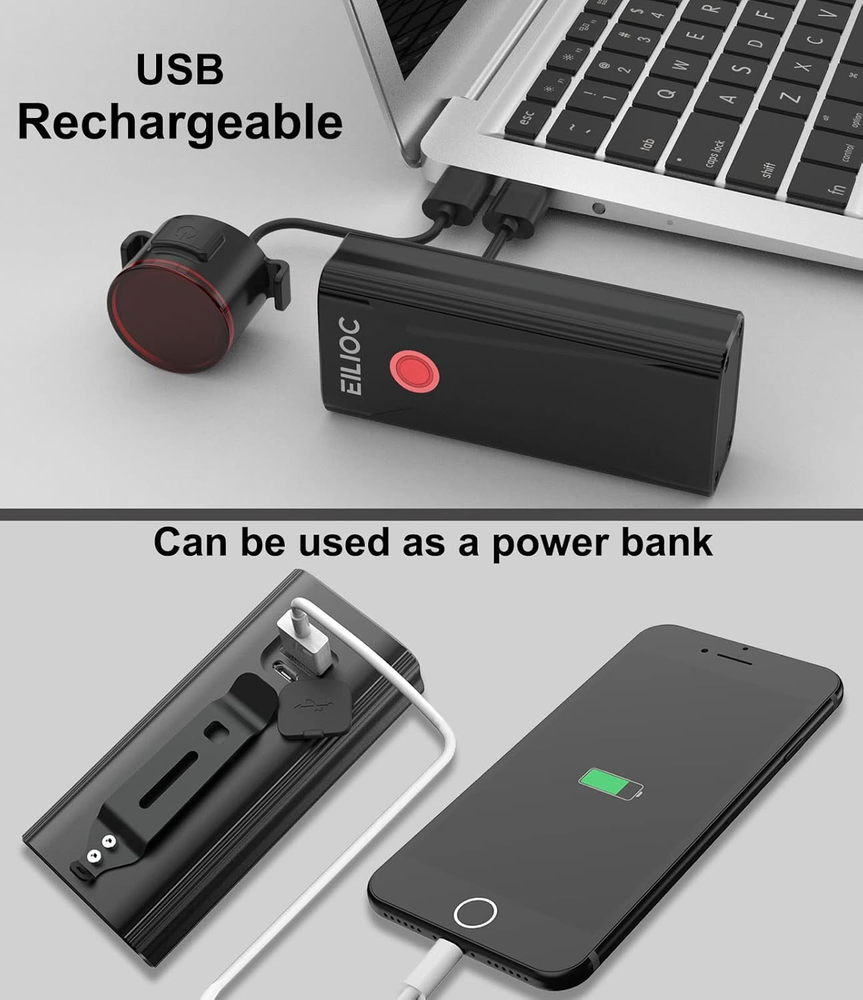 ✅SUPER BRIGHT BIKE LIGHT SET-1200 LUMEN headlight shines a powerful beam far and wide 180°over roads and trails making it easy to see and be seen! The wide beam make it visible from the sides also,cars can see you if they approach from your side at an intersection.Free Tail light included.The bike light set make your bicycle 360ºvisibility,keep in safety all the time.GET IT NOW! ✅BUILT IN HIGH CAPACITY BATTERY- The headlight built in high capacity 6400 mAh long lasting battery,can work 5 hours in high mode,7 hours in Middle mode,and 12 hours in low mode.Long runtime ensures that you reach your destination safely on dark nights,avoiding the battery run out and effect your safety and travel.Both USB Rechargeable Bike light front and back can charge from mobile phone charger,computer,power bank or any device with a USB port,never waste your money on the batteries again. ✅EASY INSTALLATION AND 360°RATATION SWIVEL STRONG MOUNT-Clip design,just slide on or remove the lights in seconds without tools.When you lock up your bike outside,You can easily remove it for charging and theft prevention.Rotate the USB Rechargeable bike light to shine any direction you want. The holder is steady and clamped to handlebar firmly.The light clicked to the base firmly.You put it on and don't need to worry about falling down. ✅WATERPROOF AND USB POWER OUTPUT-Water resistant rated to IPX5 - Protected against small rain, Splash water,light up your road in all conditions of weather!The lamp power supply can be used as a power source.If your mobile phone has no power during the riding,you can use it emergency charging the phone. ✅100% SATISFACTION-If you have any problem with your bike light set or if you are not happy with your purchase,contact us through our amazon listing with your order ID and you will receive a replacement.Has any problem please contact us we will reply you within 24 hours.Get It Now! Product Description Keep You Safe all the Time EILIOC KX3 is a bright and waterproof bike headlight with large battery capacity, long battery life. IPX5 waterproof rating headlight,protected against small rain, splash water,light up your road in all conditions of weather! See and Be Seen 1200 LUMEN headlight shines a powerful beam far and wide over roads and trails making you easy to see and be seen! The bike light set make your bicycle 360°visibility,keep in safety all the time. Daytime Visibility It is so bright that it cannot be ignored even during the day. BIKE LIGHT FRONT 5 Modes and 3 Modes Available Click the button on the bicycle light to switch mode.6 clicks are high/middle/low/strobe/SOS/off in sequence. The bicycle light can switch between 3 modes and 5 modes,When it is off,hold down the button for 2 seconds till the red and green light flashing to switch to 3 modes (high/low/strobe). When it is off again,hold down the button for 2 seconds to switch back to 5 modes. Battery Indicator Power capacity indication: When power is sufficient,indicator light is green. When power is less than 20%,the indicator light turn red to alert you when battery needs to be recharged. You don't have to worry about your riding suddenly pushed into the darkness. Charging indication:when charging,indicator light is red .When fully charged ,indicator light turn green. 360 Degree Rotation The front bike light can rotate 360 degrees. when you rotate it at a fixed angle,it will stay in that position,it won't rotate more unless you rotate it again. The holder is steady and clamped to handlebar firmly. The light clicked to the base firmly.You put it on and don't need to worry about falling down. Can Be Used as Power Bank If your mobile phone has no power during the riding,you can use it emergency charging your phone.This is important for outdoor cycling. Easy to Carry Just weight 198 g( not include bracket),size 3.9x1.78x0.98 in,Light and compact,it is easy to carry. When you lock your bike in parking area of work place or supermarket,you can easy to carry the headlight in the pocket or backpack for charging and theft prevention. Package included 1.Headlight*1 2.Taillight*1 3.USB wire *2 4.Headlight bracket*1 5.Rear light rubber strap*2 6.User's manual*2 VERSATILE BIKE REAR LIGHT More than a rear light You can not only use on bike light,but also use on baby carriages/helmet/backpack/the dog when walking. 6 Modes Work:3-17 hours Charge:1.5 hours 6 modes:High/Middle/Low/Slow-flashing/Strobe/Fast-flashing Easy to install Mounting is simple and effective with ultra-grippy rubber strap ensuring the light doesn’t slip on regular or oversize handlebars. IPX4 waterproof Water resistance design provides all-weather reliability.